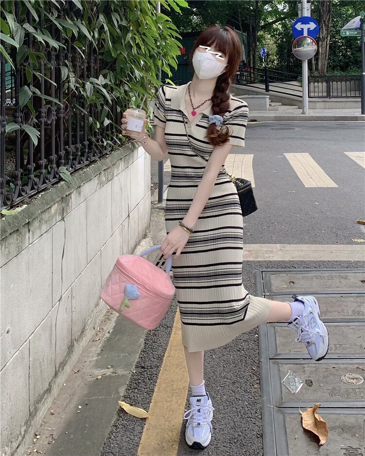 カラーストライプドレス サマースタンダードニットロングスカート レトロ 夏物 s576148277129451