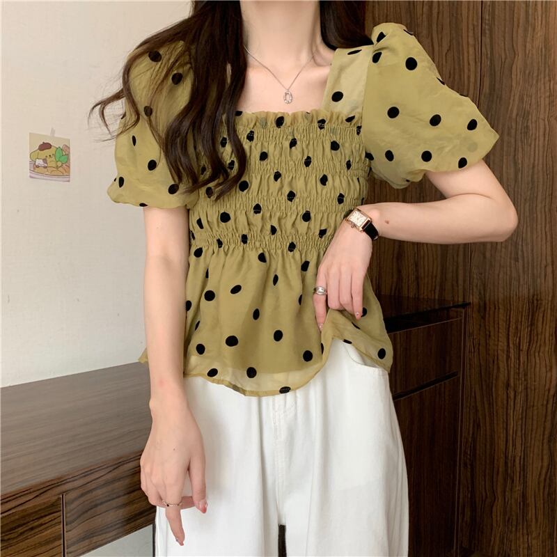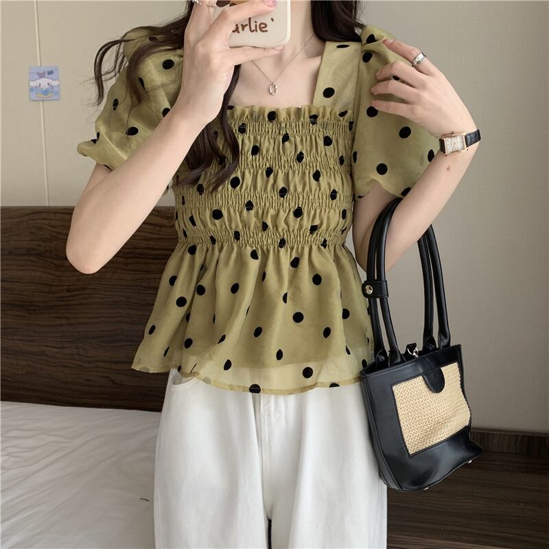 水玉ショートトップス サマースリーブシャツ 大人ガーリー スウィート キュート カジュアル 夏物 スクウェア s576132376263930