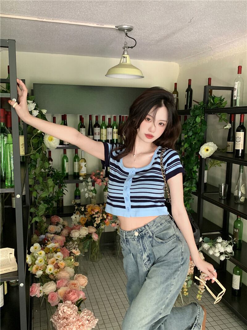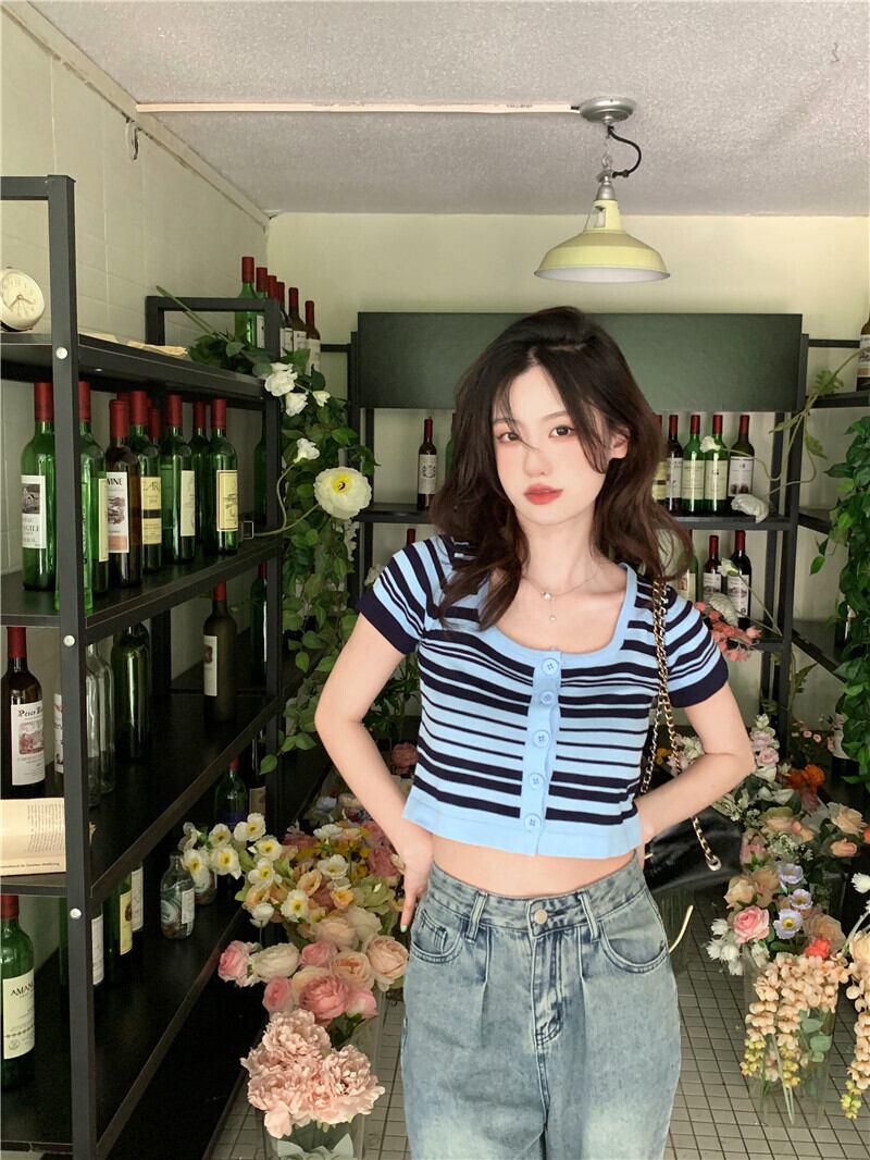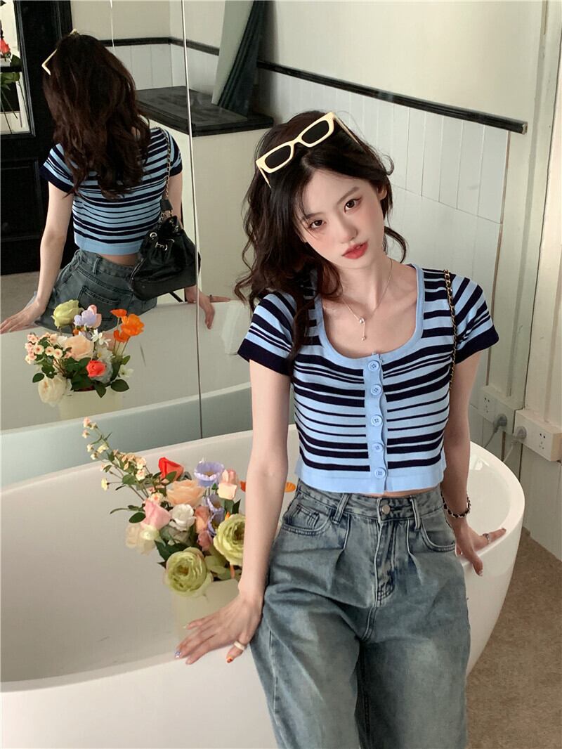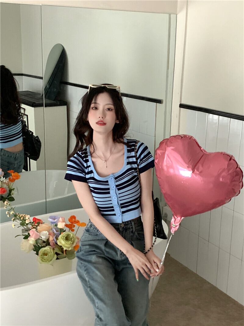 スタンダードショートTシャツ サマーストライプカラートップス レトロ 大人ガーリー スウィート キュート カジュアル 夏物 スクウェア s576123014907008