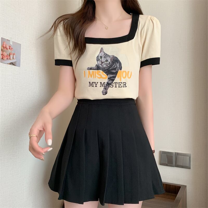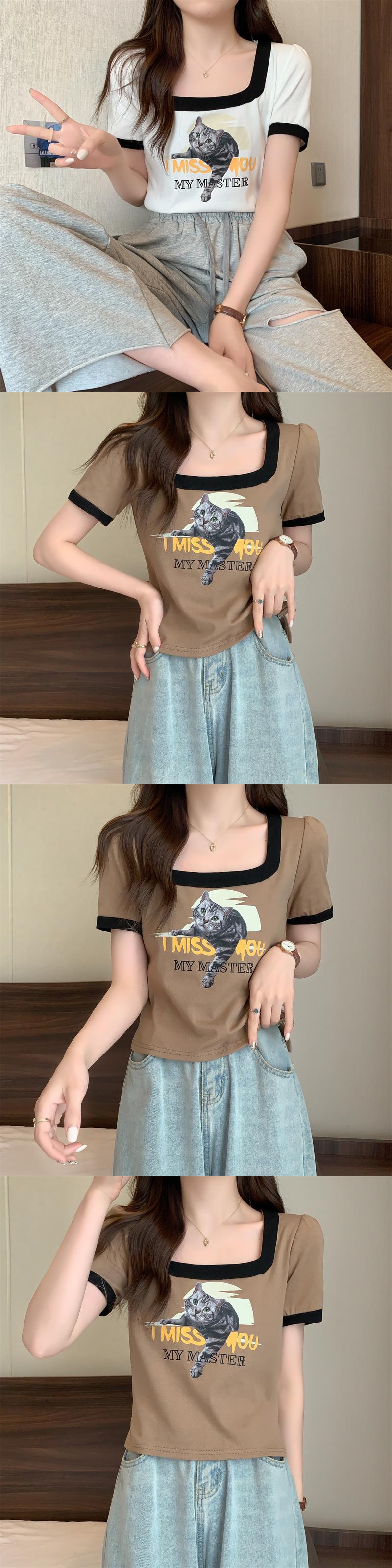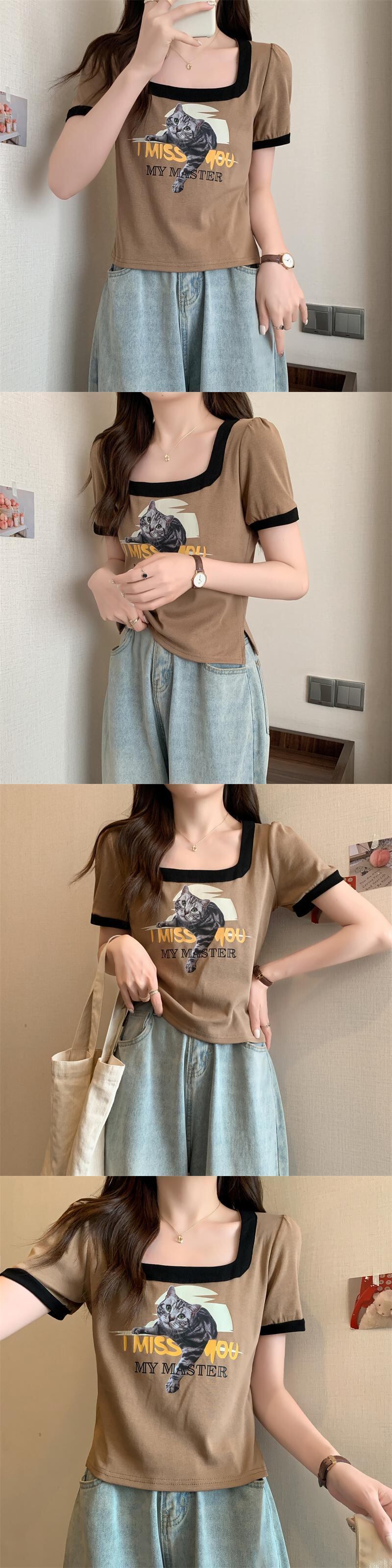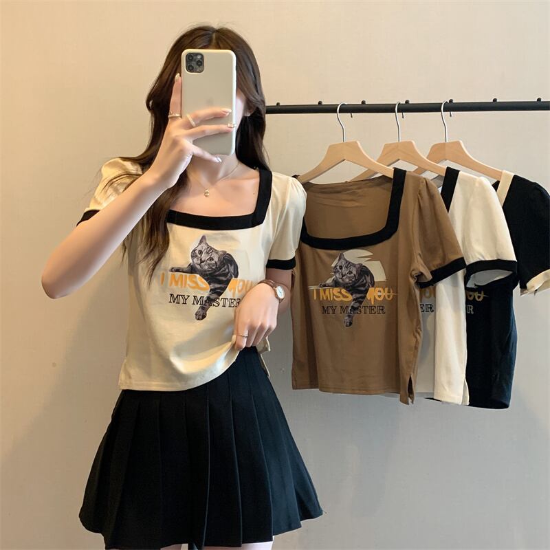スタンダードショートTシャツ サマープリント柄トップス レトロ 夏物 スクウェア s57614655704124