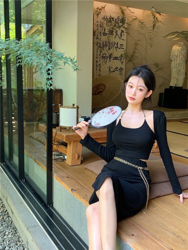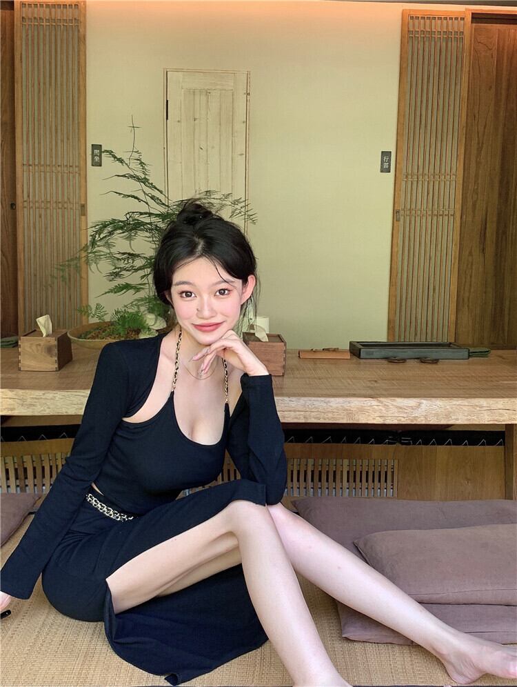 色:ブラックsuspender,Long袖丈cardigan,Splitスカート,ウェストchain