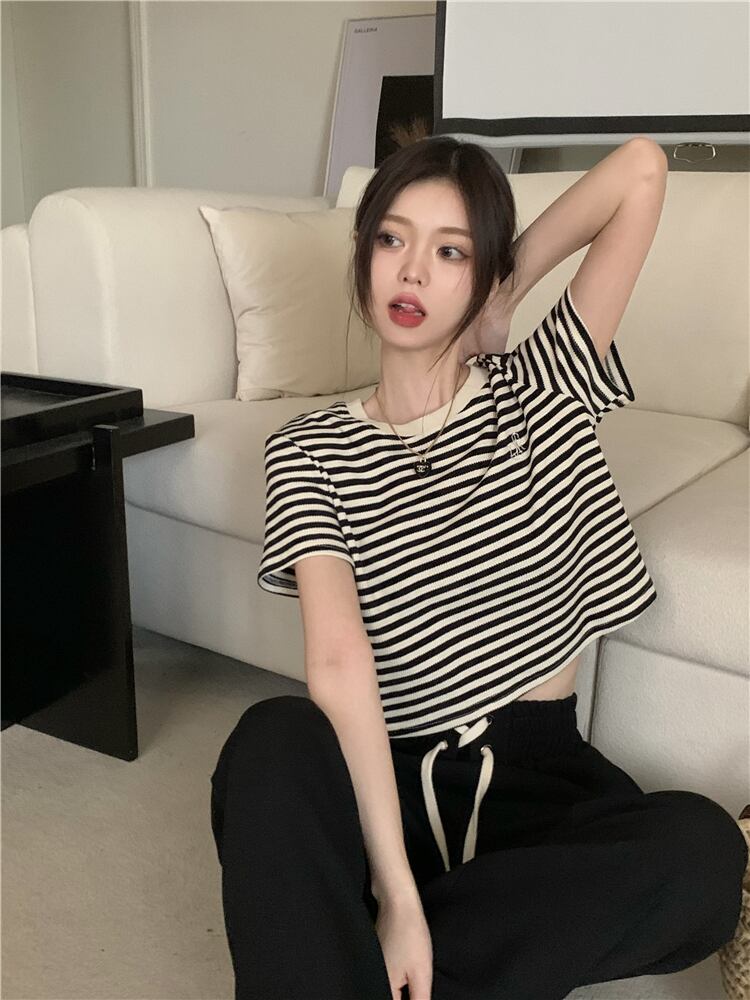ストライプショートTシャツ サマースタンダードニットトップス レトロ 夏物 s57617727834722
