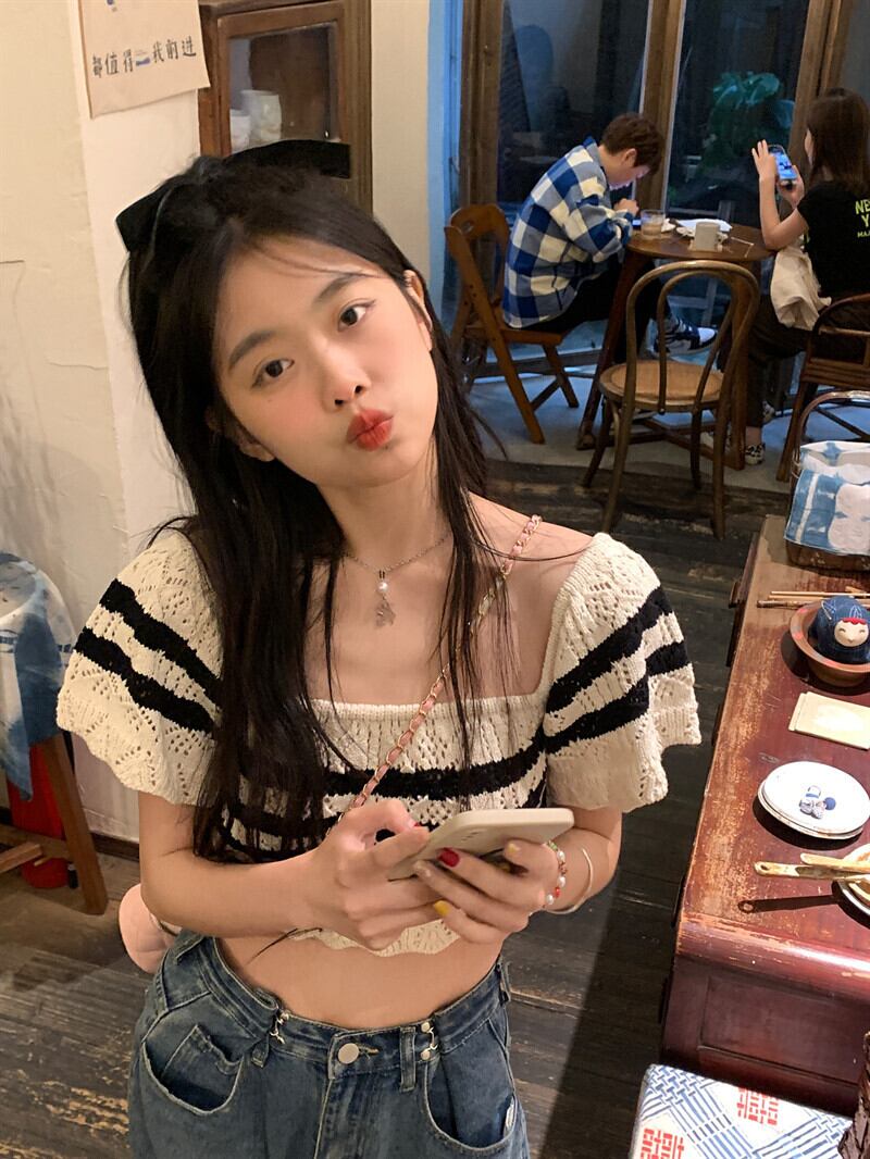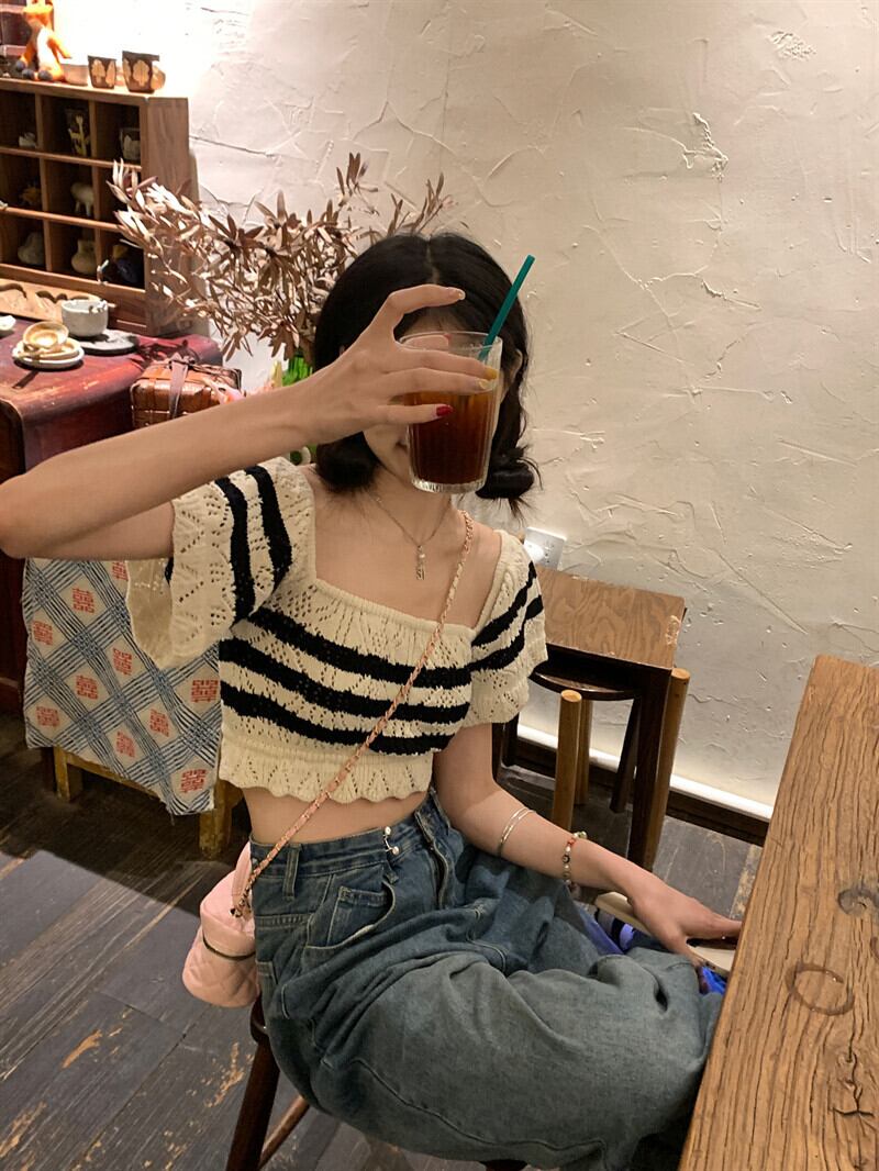 スタンダードストライプショートスリーブカラー半袖ニットセーター サマーシャツ トップス レトロ ハーフスリーブ 夏物 スクウェア s576146072436655