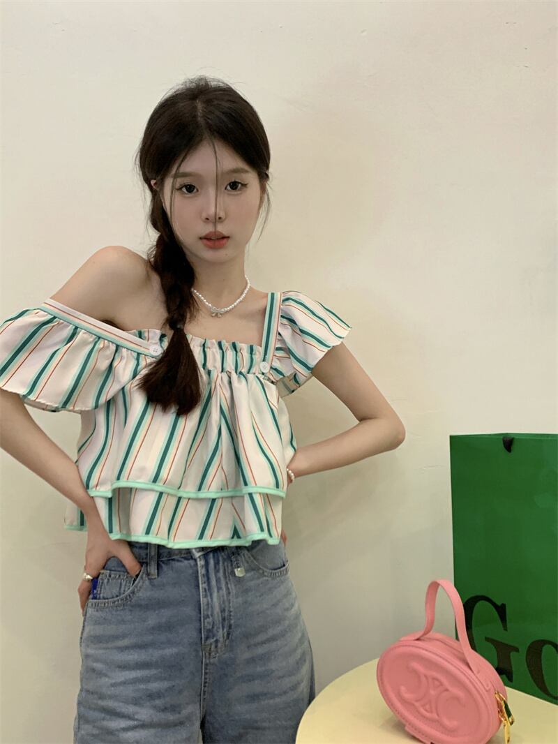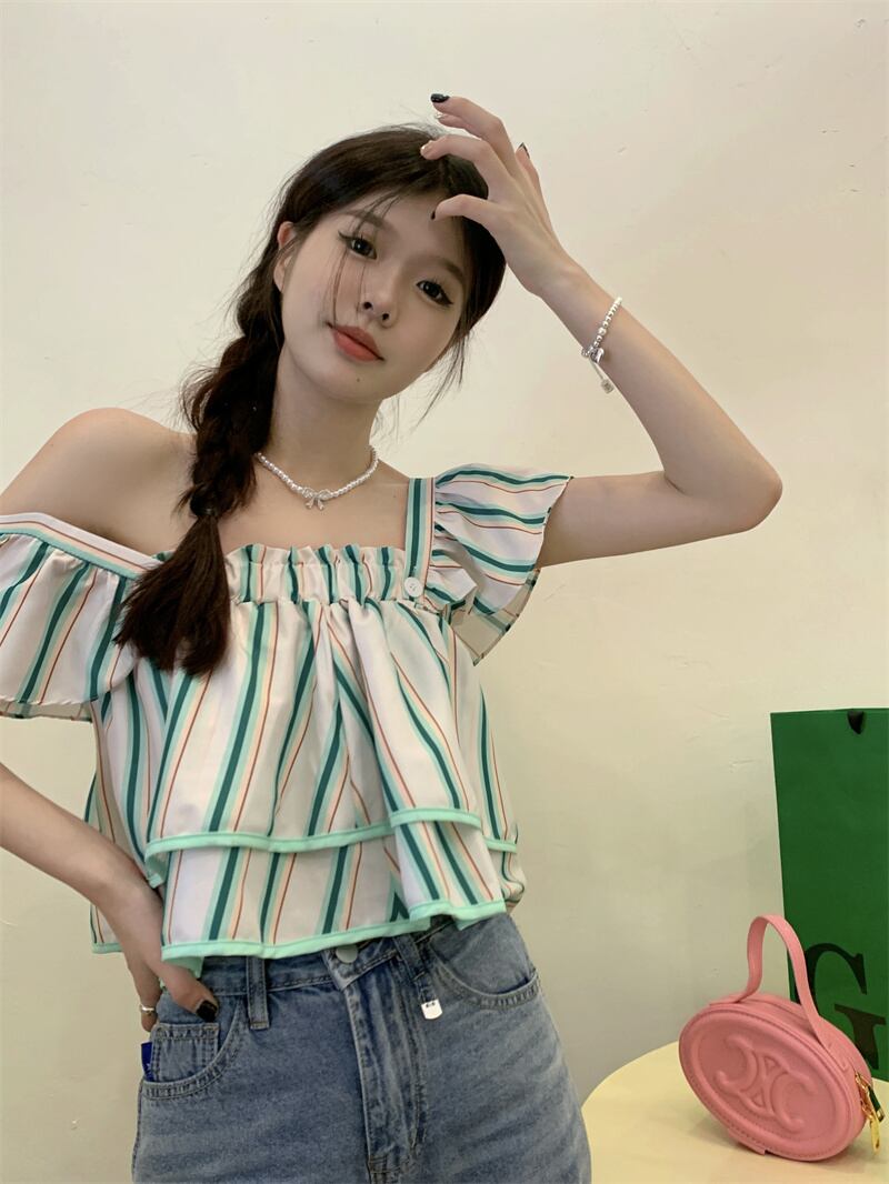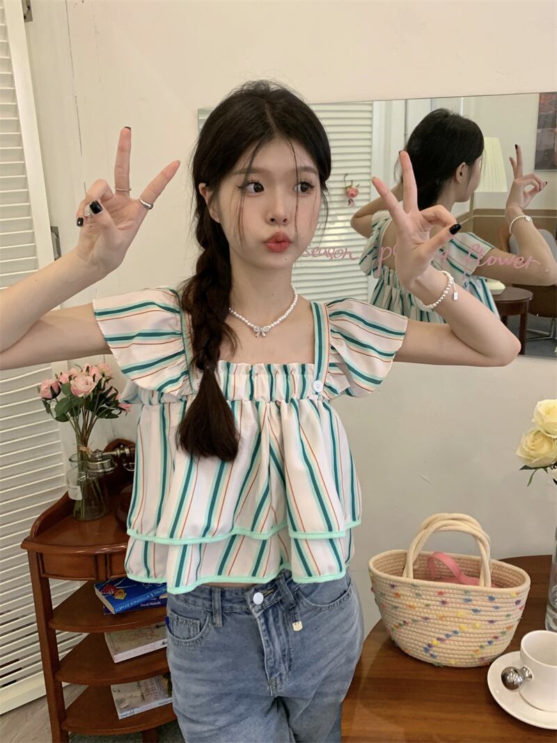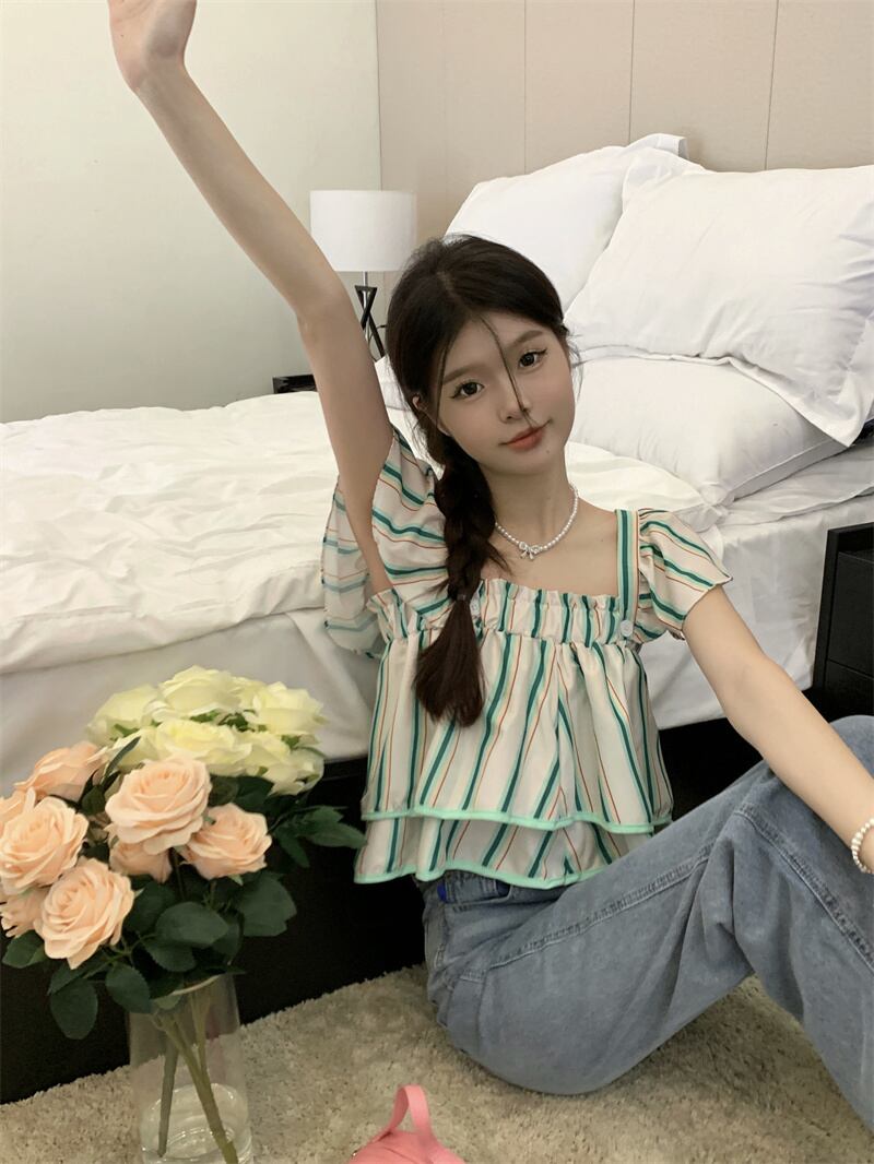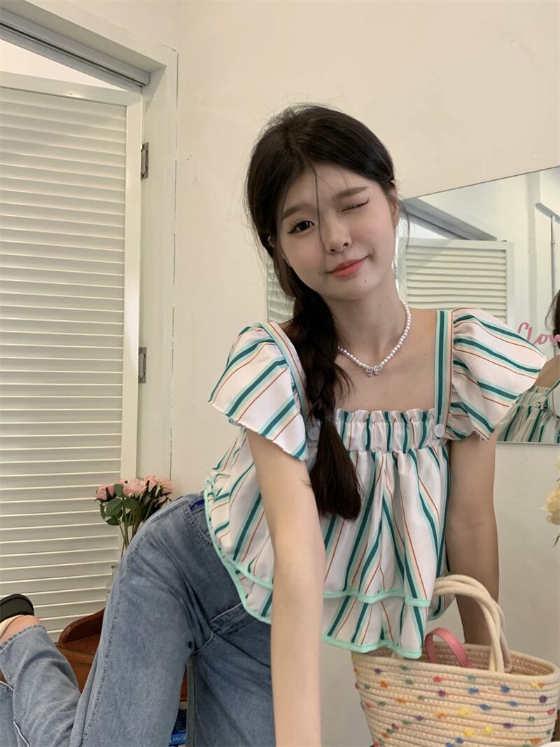 スリーブトップス ストライプカラーシャツ サマーショート 夏物 スクウェア s576192648330151