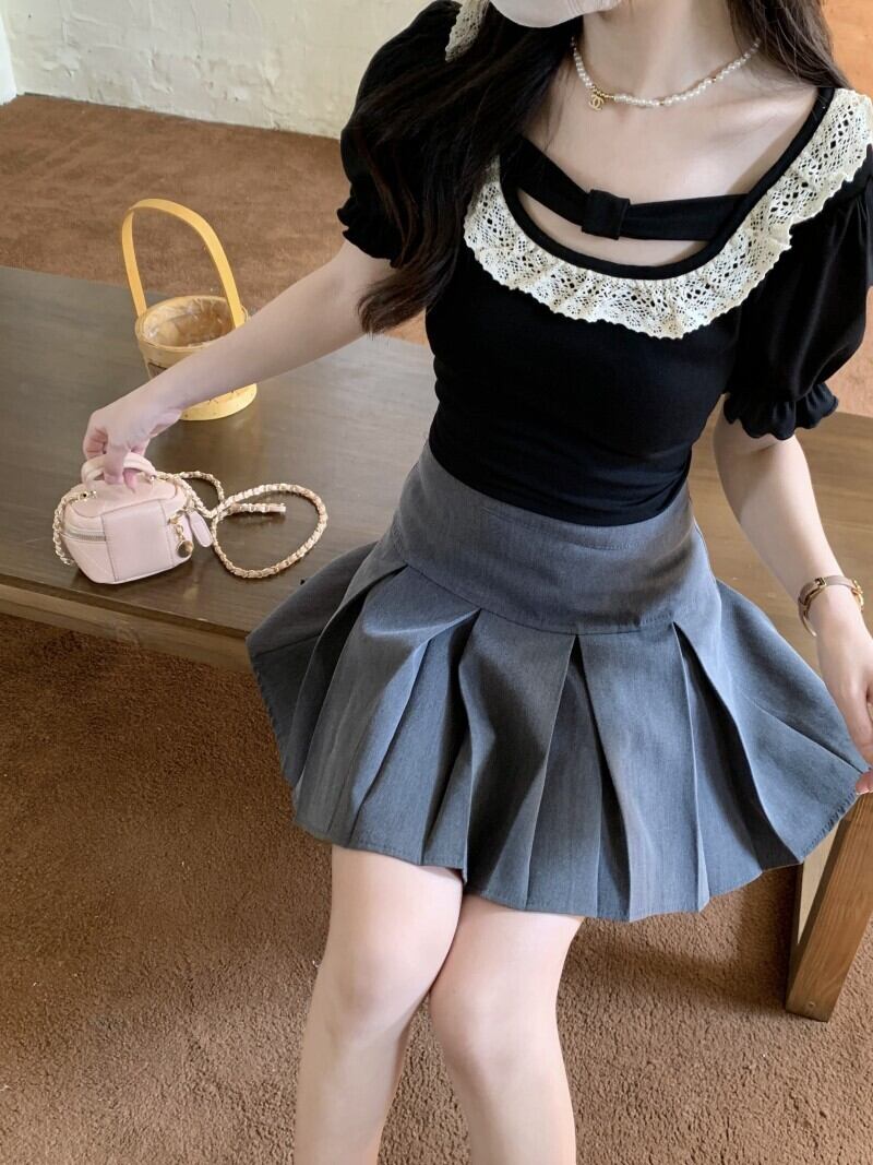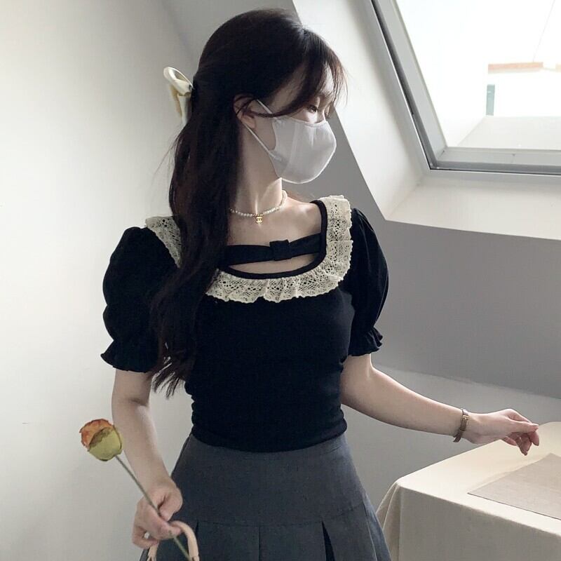 レースショートスリーブTシャツ サマースリムフィット薄手トップス 夏物 スクウェア s576177314053877