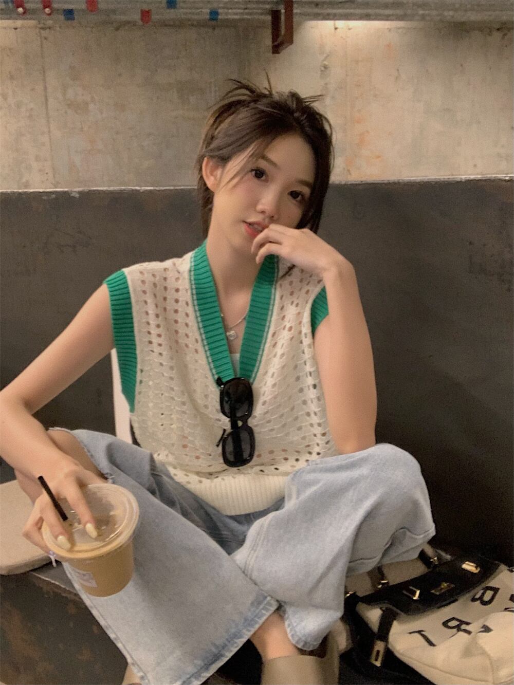 カラーVネックルーズニットサマーノースリーブトップス 夏物 s576147058637944