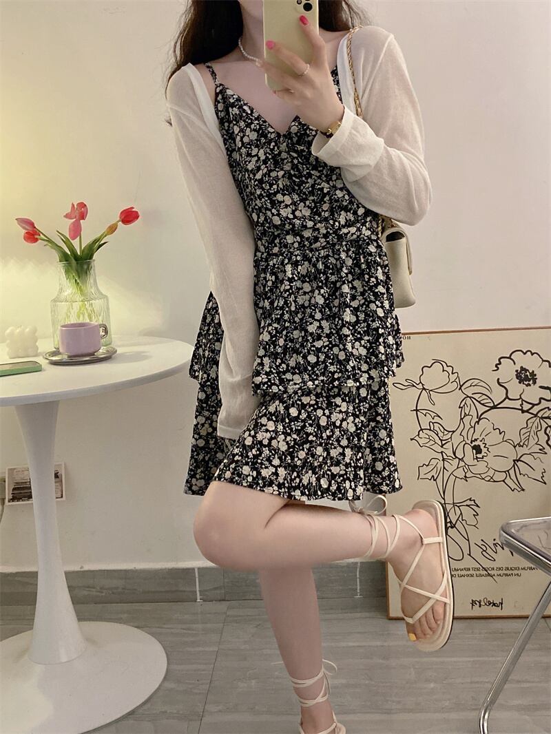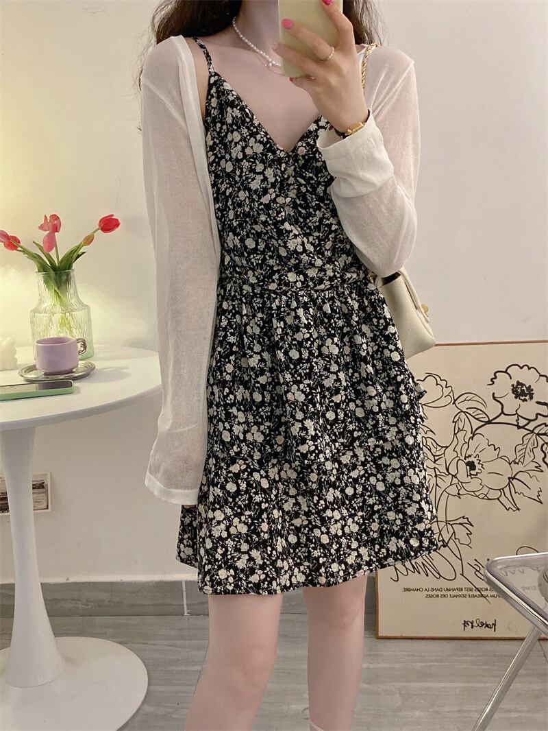 Vネックフローラルドレス サマースカート ウェストAラインショート 夏物 花柄 s576186381705116