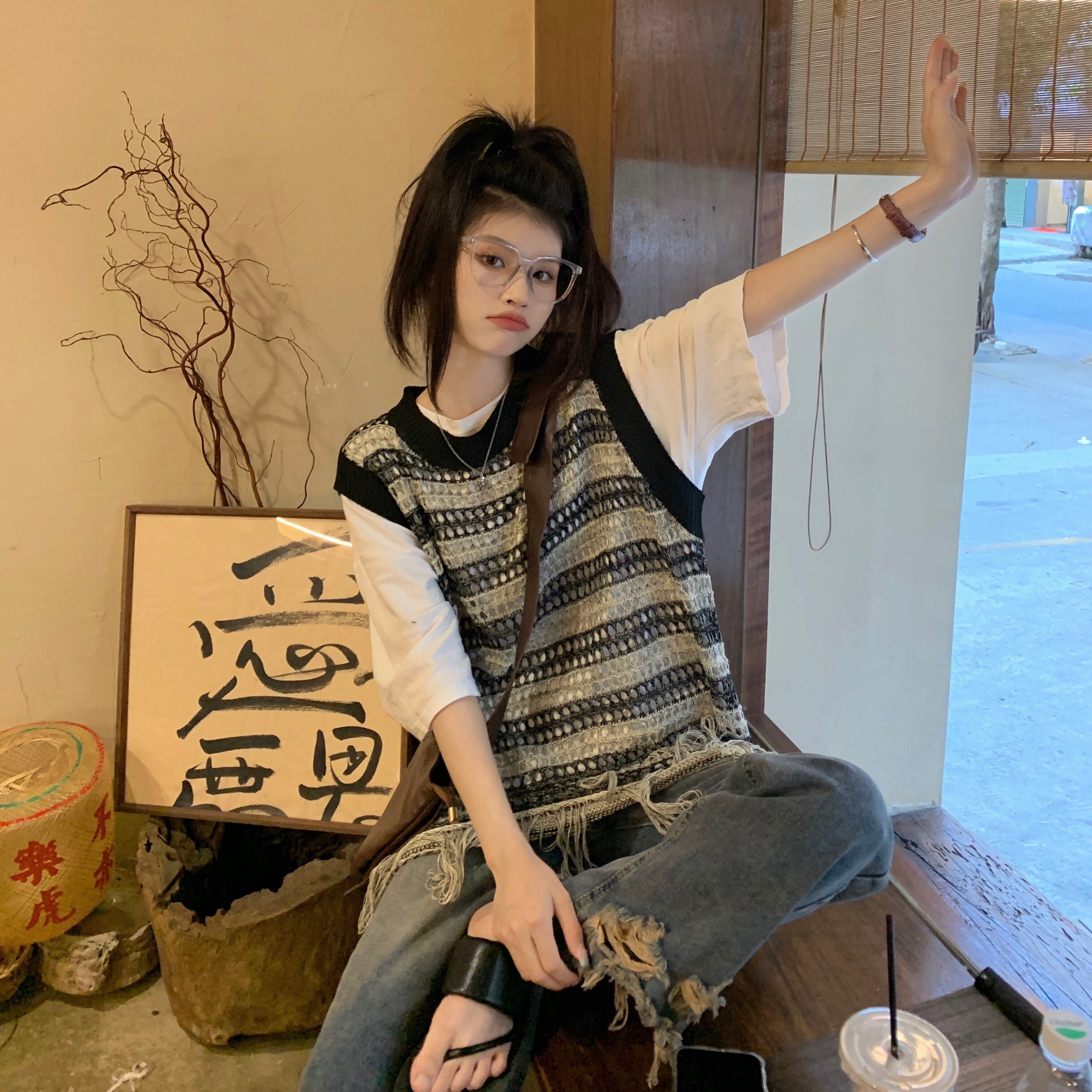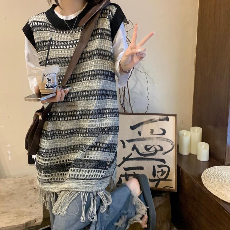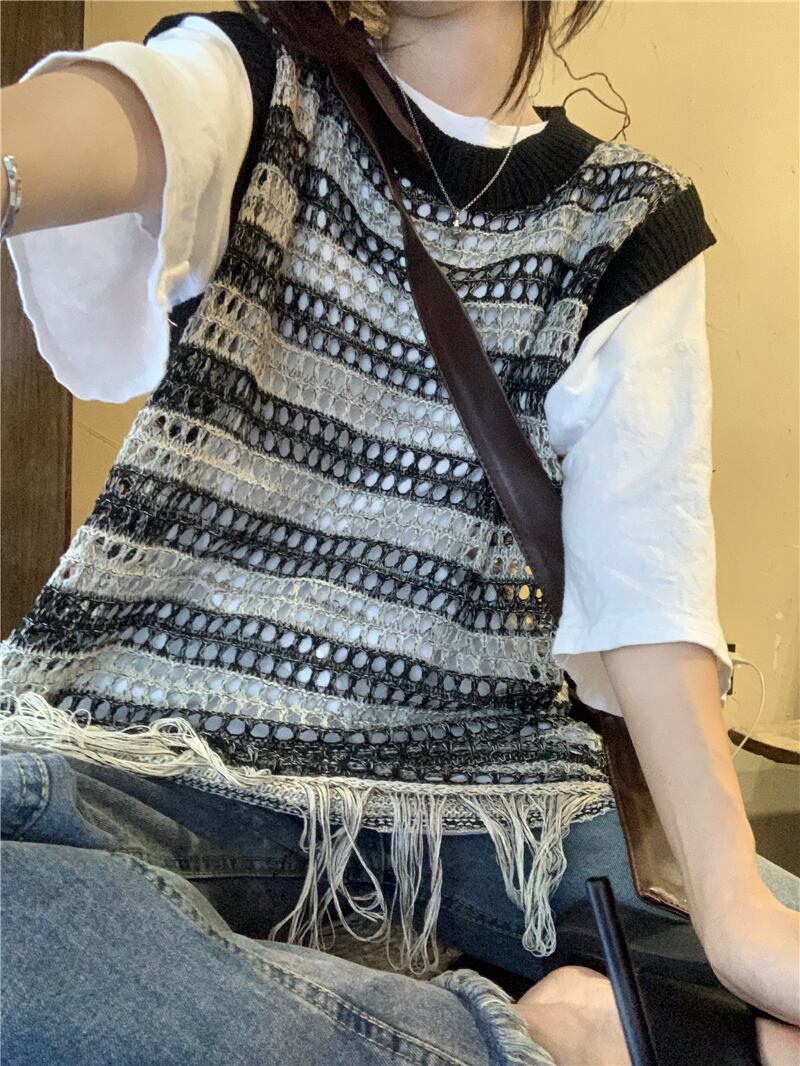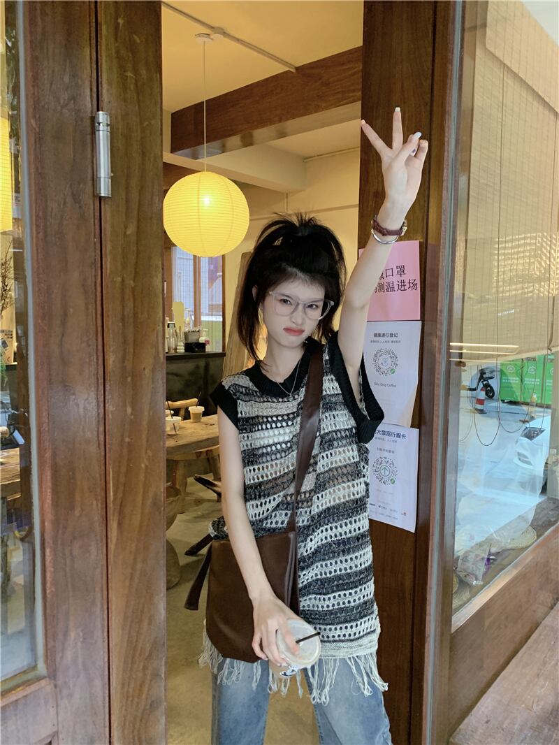 ノースリーブニット サマー薄手ブラウス ルーズストライプトップス 夏物 s576121422403114