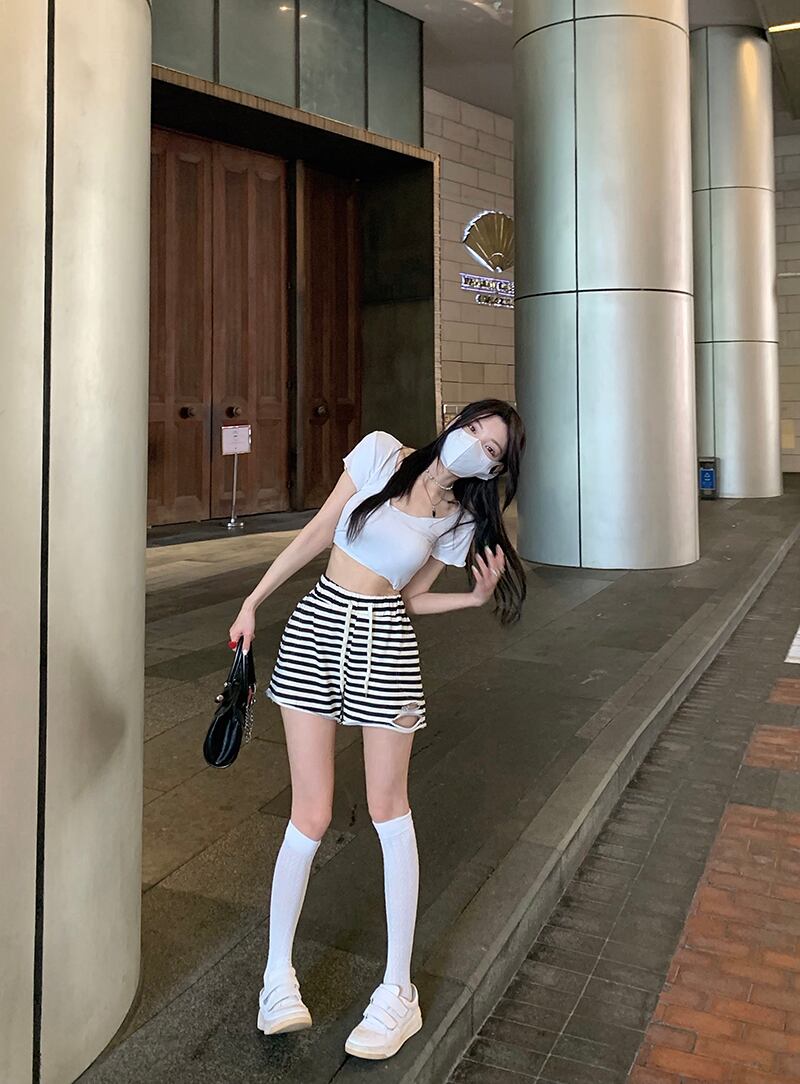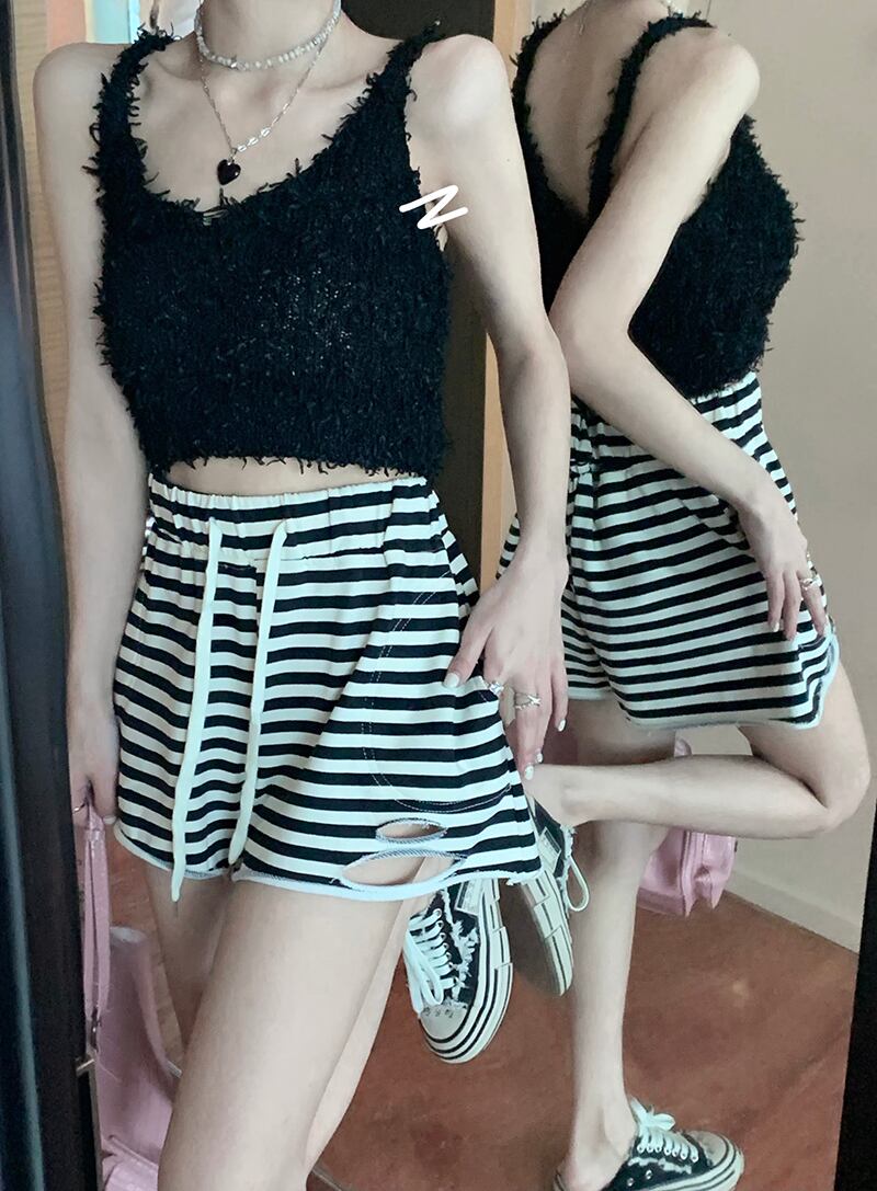 ショーツ サマーストライプカジュアルパンツ ハイウェストウェストワイドレッグ 夏物 ブルマー ワイドパンツ s576150598892897