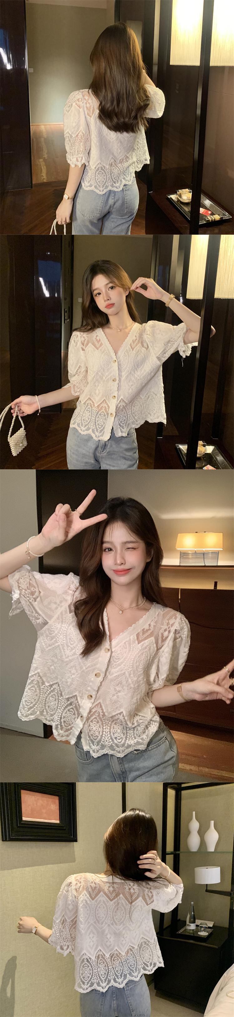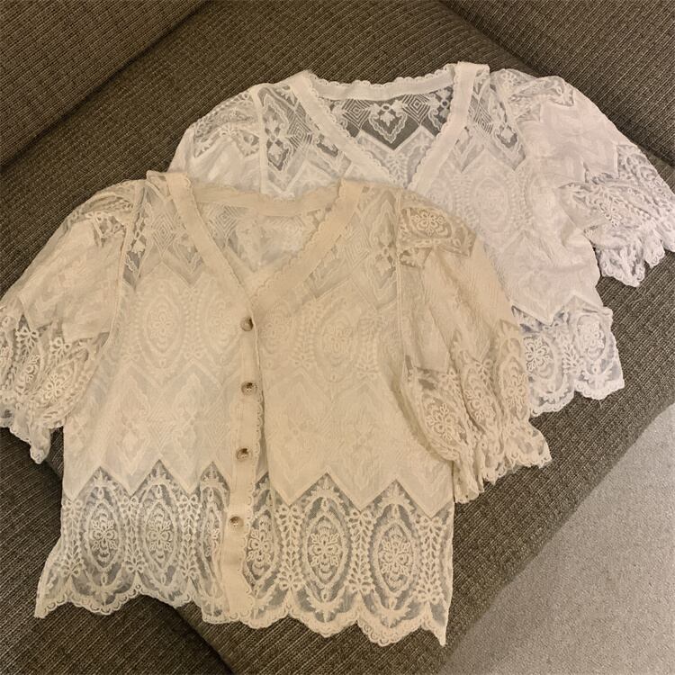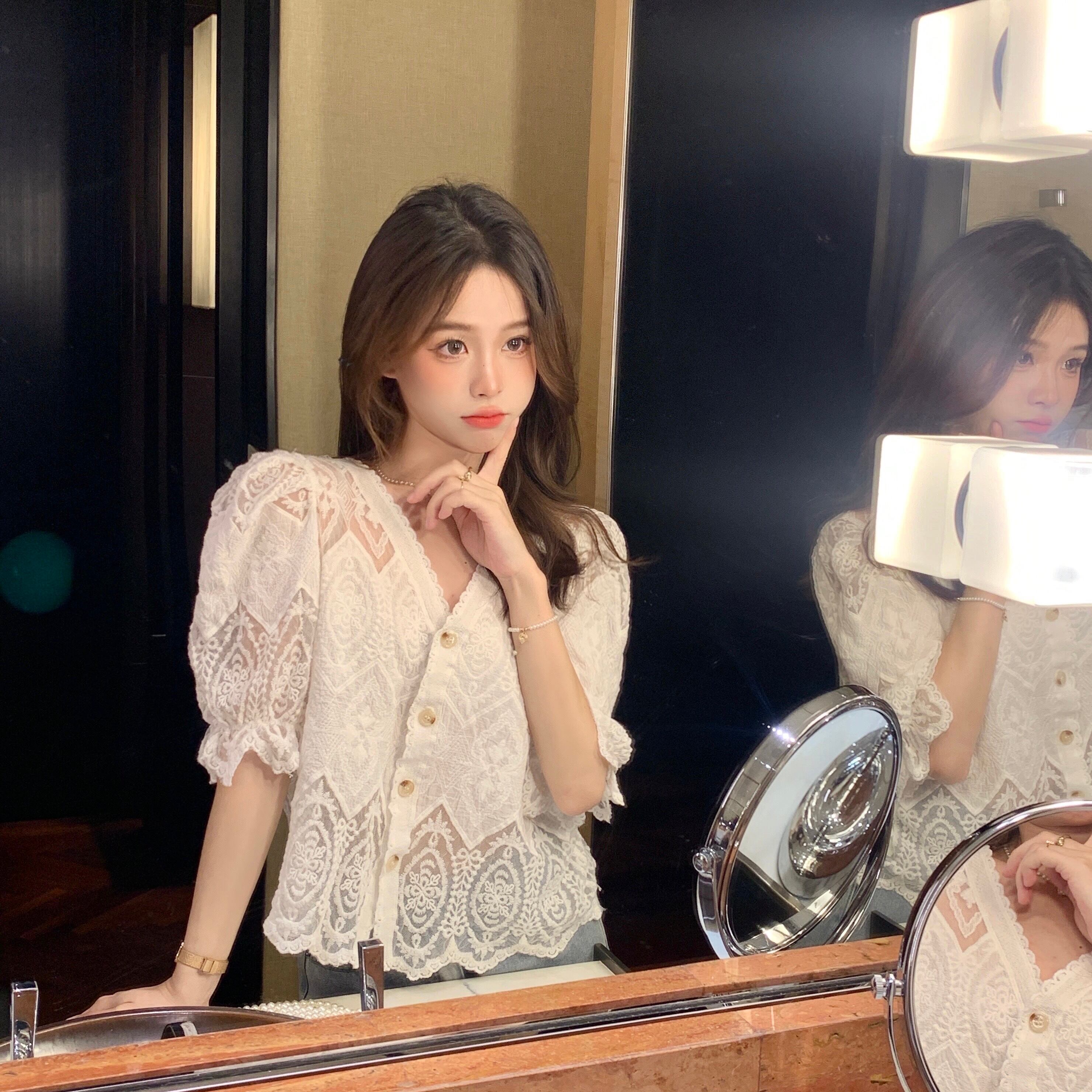 Vネックショートトップス サマースリーブレースシャツ 大人ガーリー スウィート キュート カジュアル 夏物 s576192421733718