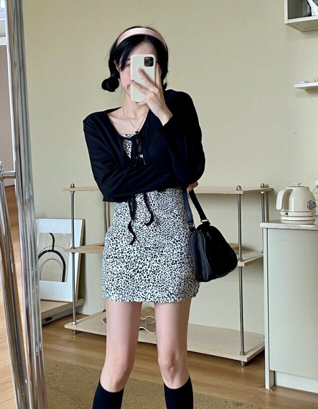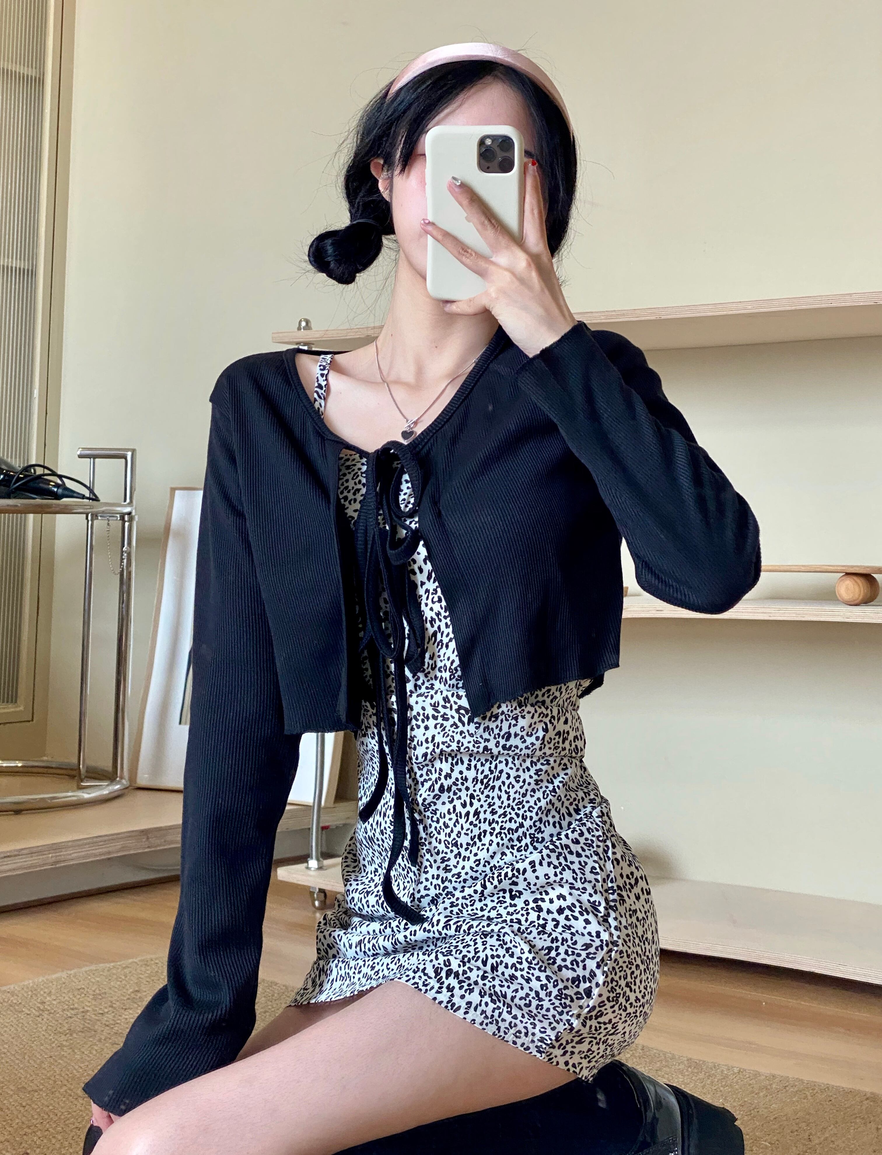 色:レパードプリント柄camisole,レパードプリント柄camisole,ブラックlong袖丈cardigan,ブラックshort袖丈cardigan,ブラックデニムshorts