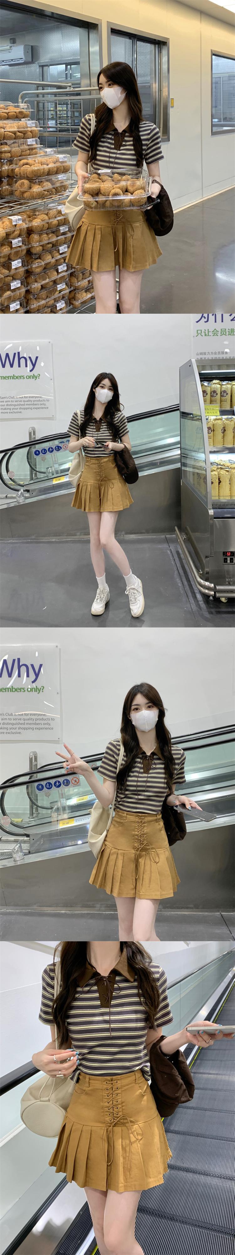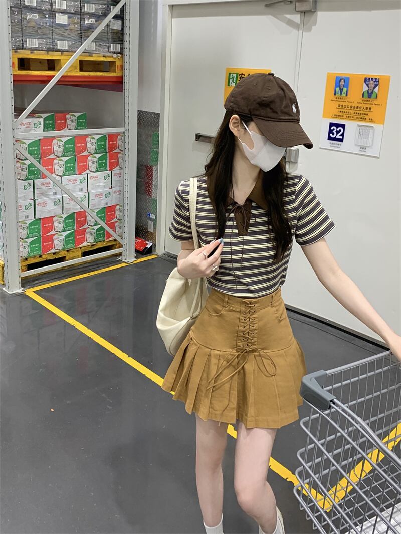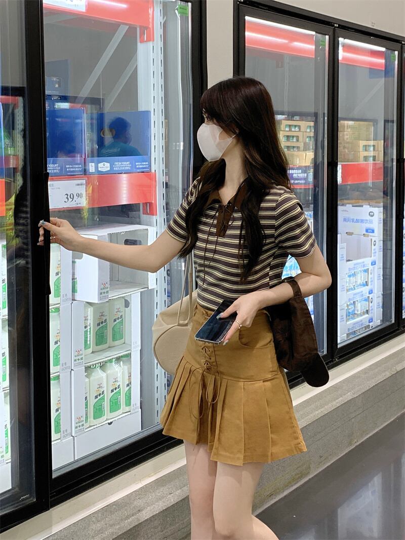 色:ブラウンストライプdT-Shirt,カーキpleatedスカート