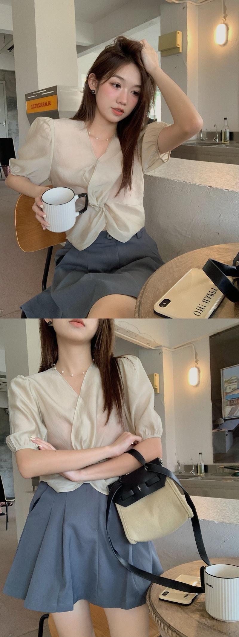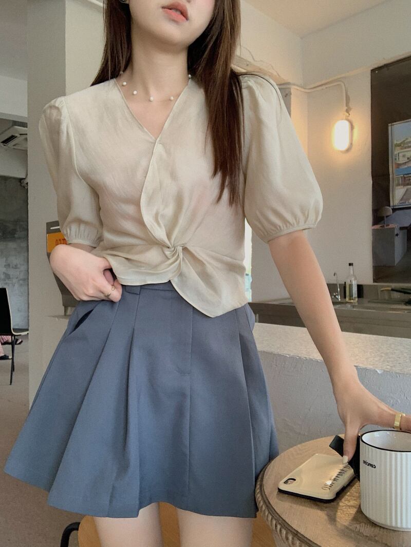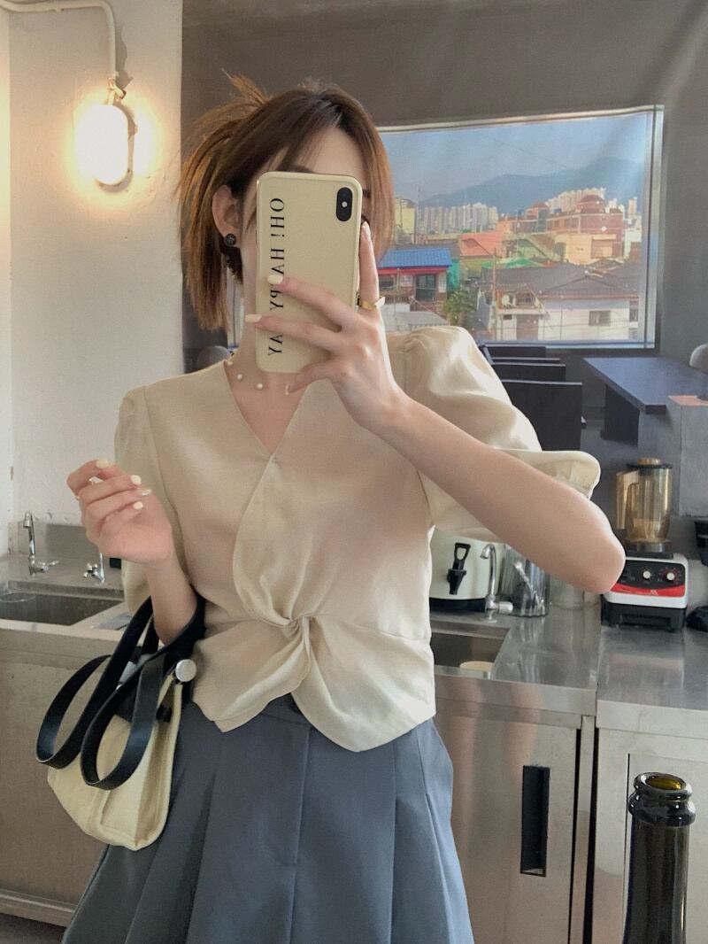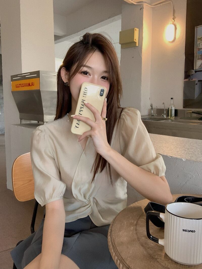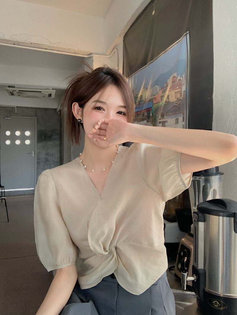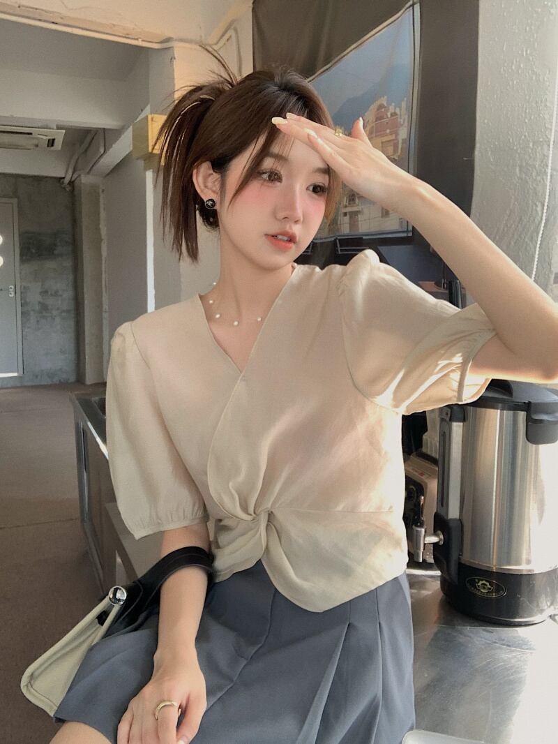 Vネックショートトップス サマースリーブシャツ 大人ガーリー スウィート キュート カジュアル 夏物 s576144897030578