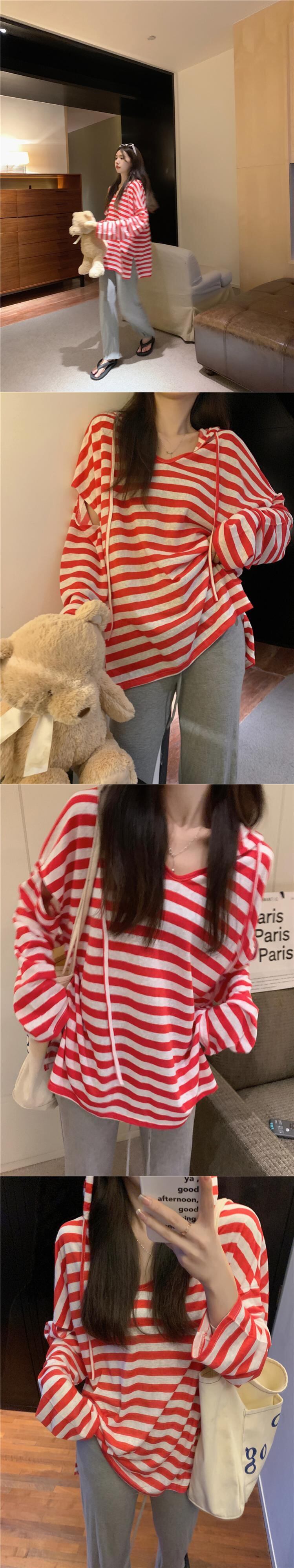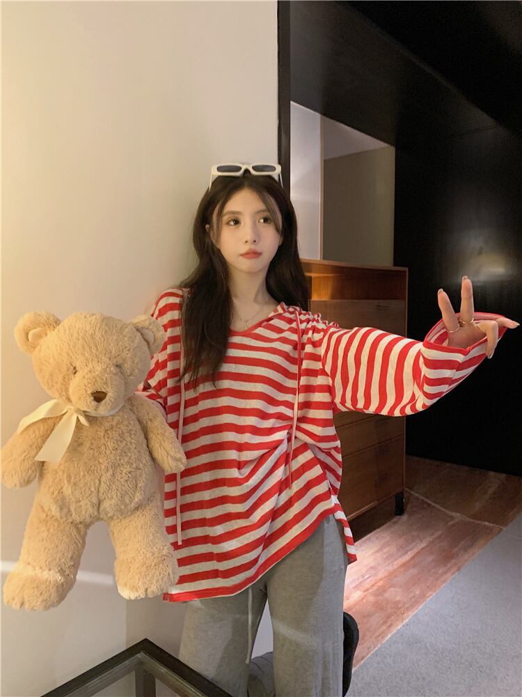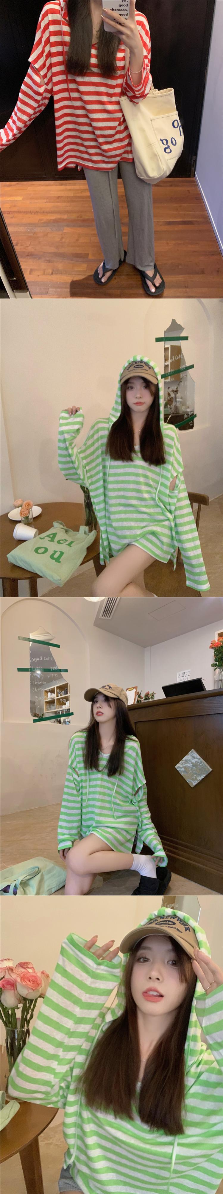 ストライプTシャツ サマー薄手フードルーズトップス ロング 夏物 s576116160155684