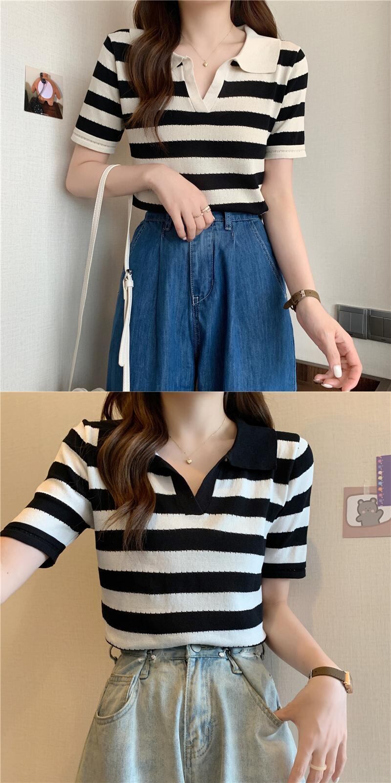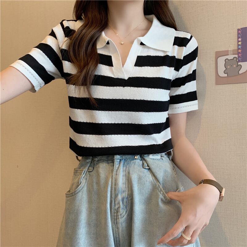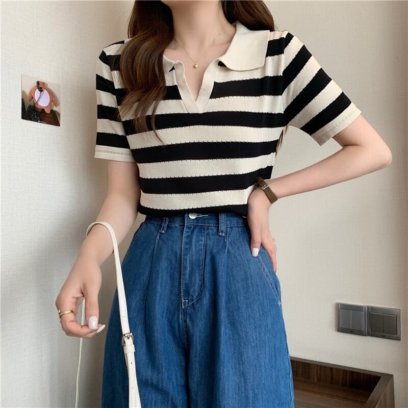 カラーニットセーター サマースタンダードスタイルストライプトップス レトロ 夏物 s576193027244444