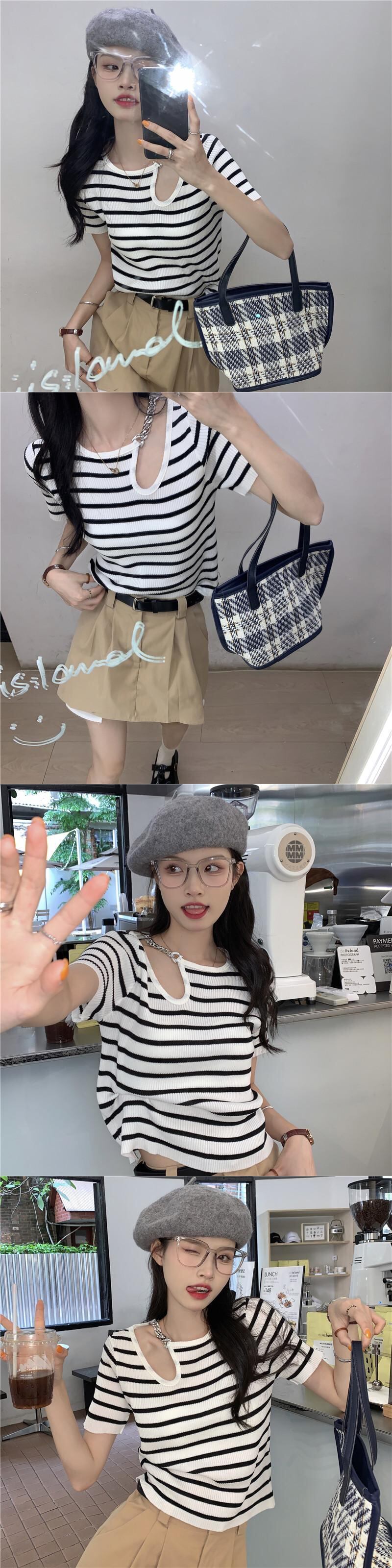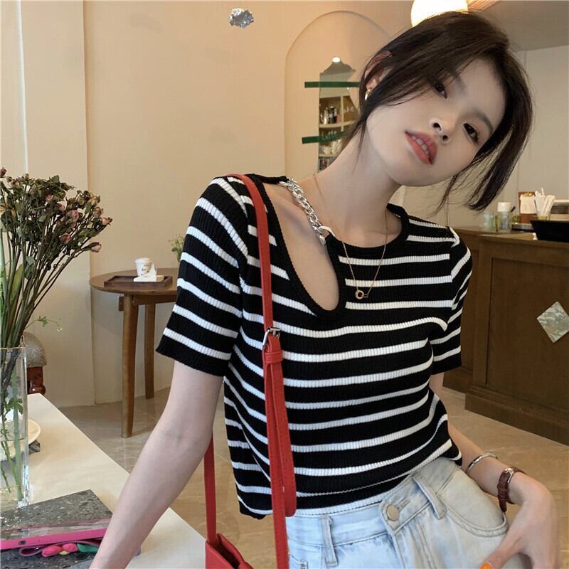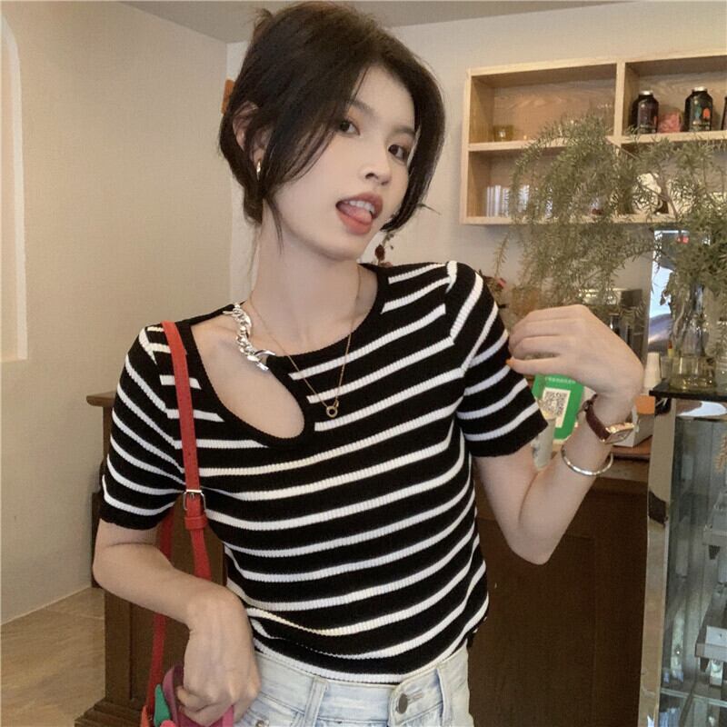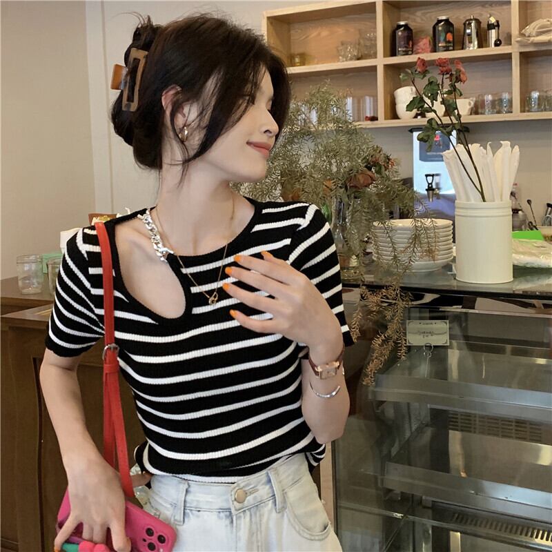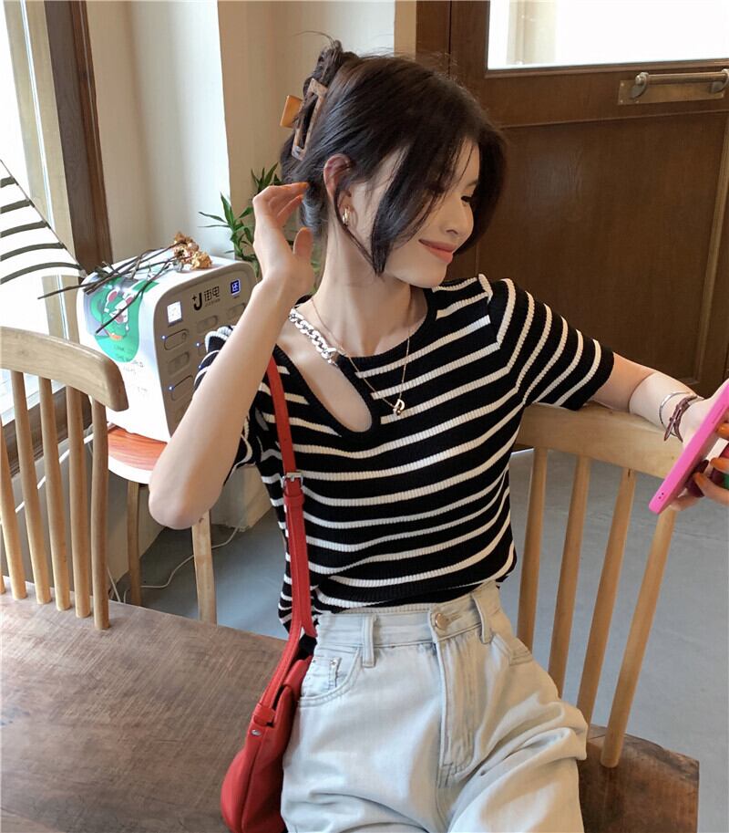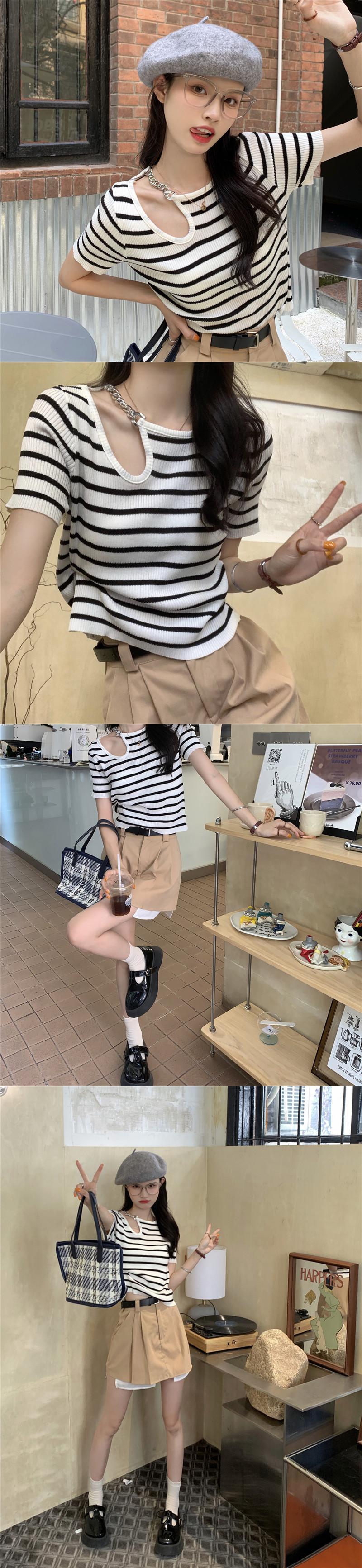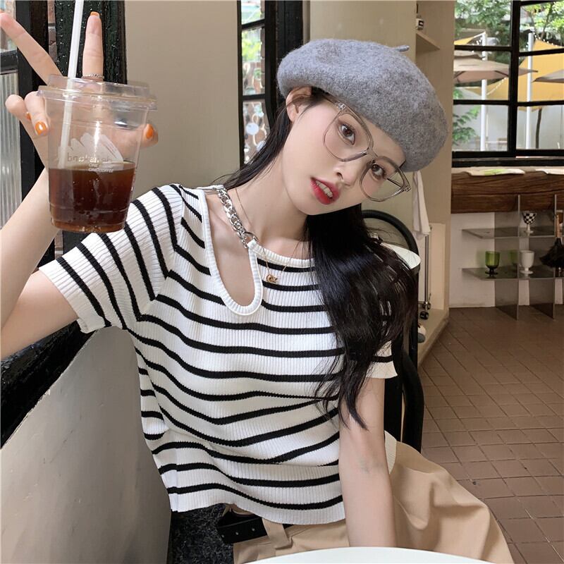 ニットショートTシャツ サマーストライプトップス 夏物 シルク s576168124359789