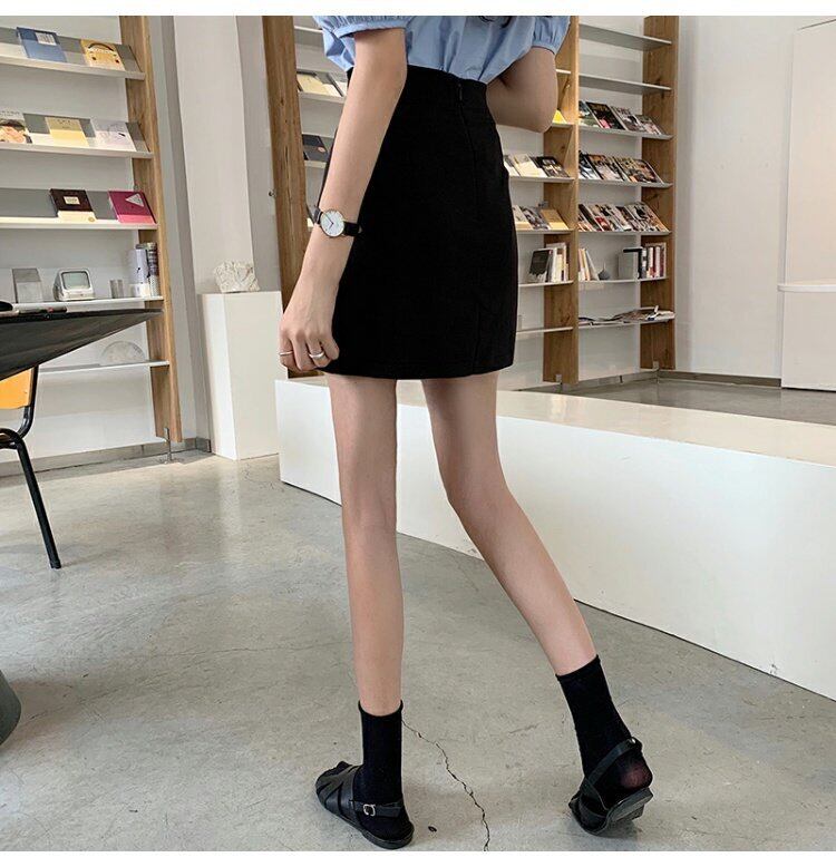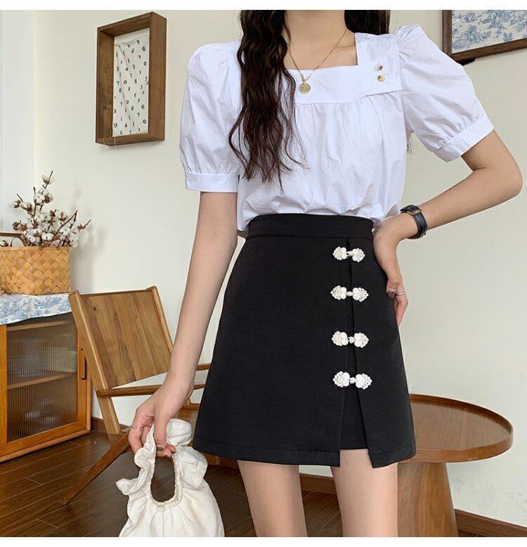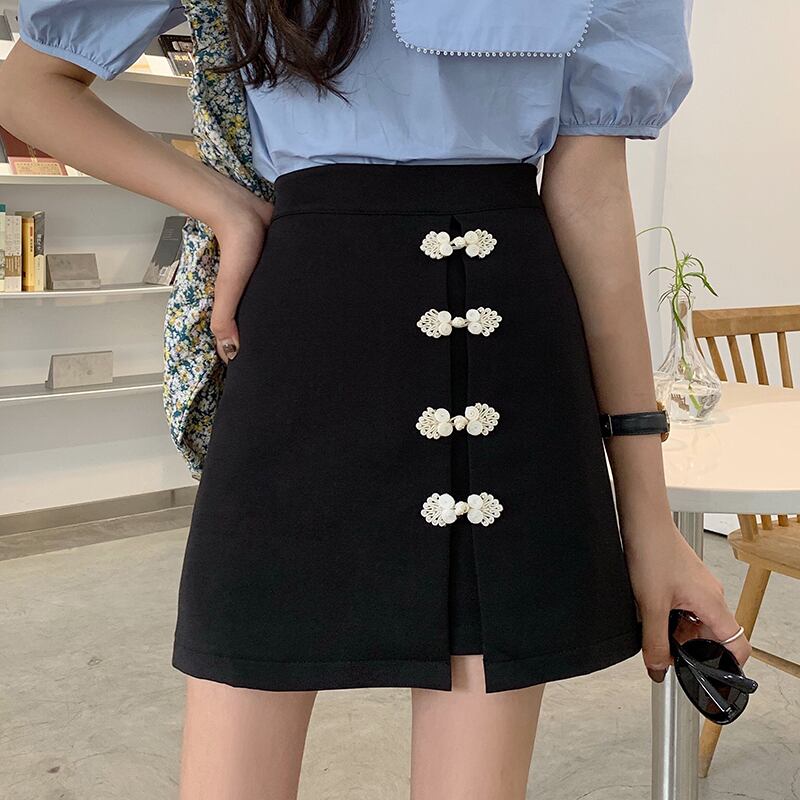 サマーバックルスタンダードスカート Aラインハイウェストウェスト薄手ブラック レトロ 夏物 s576137211117650