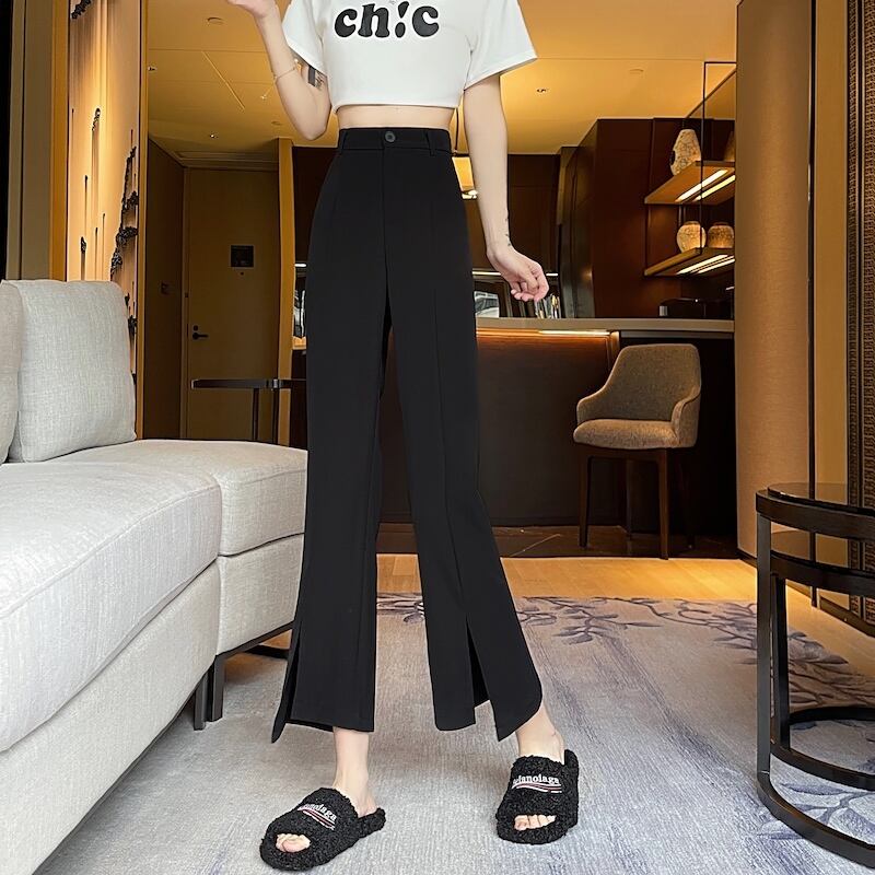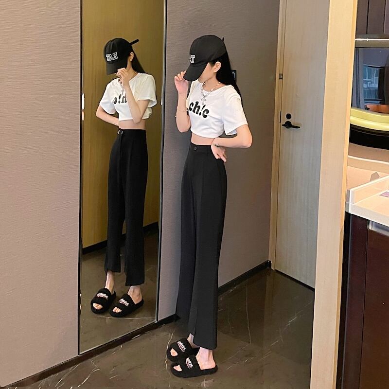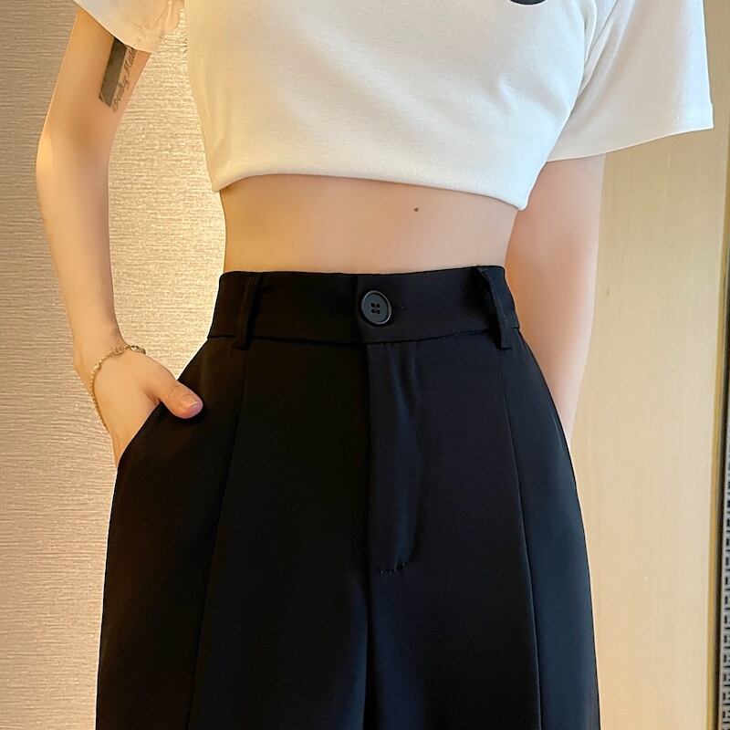 ワイドレッグパンツ サマーカジュアルハイウェストウェストブラック薄手 レッド 夏物 ワイドパンツ s576183506207178