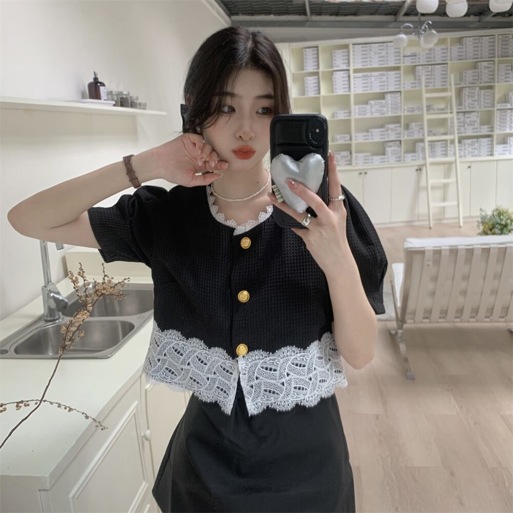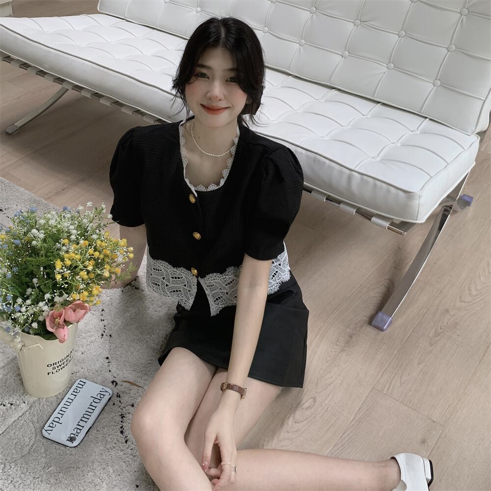 スタンダードショートトップス サマーシャツ ブラックスリーブレース レトロ 夏物 s576156243329762