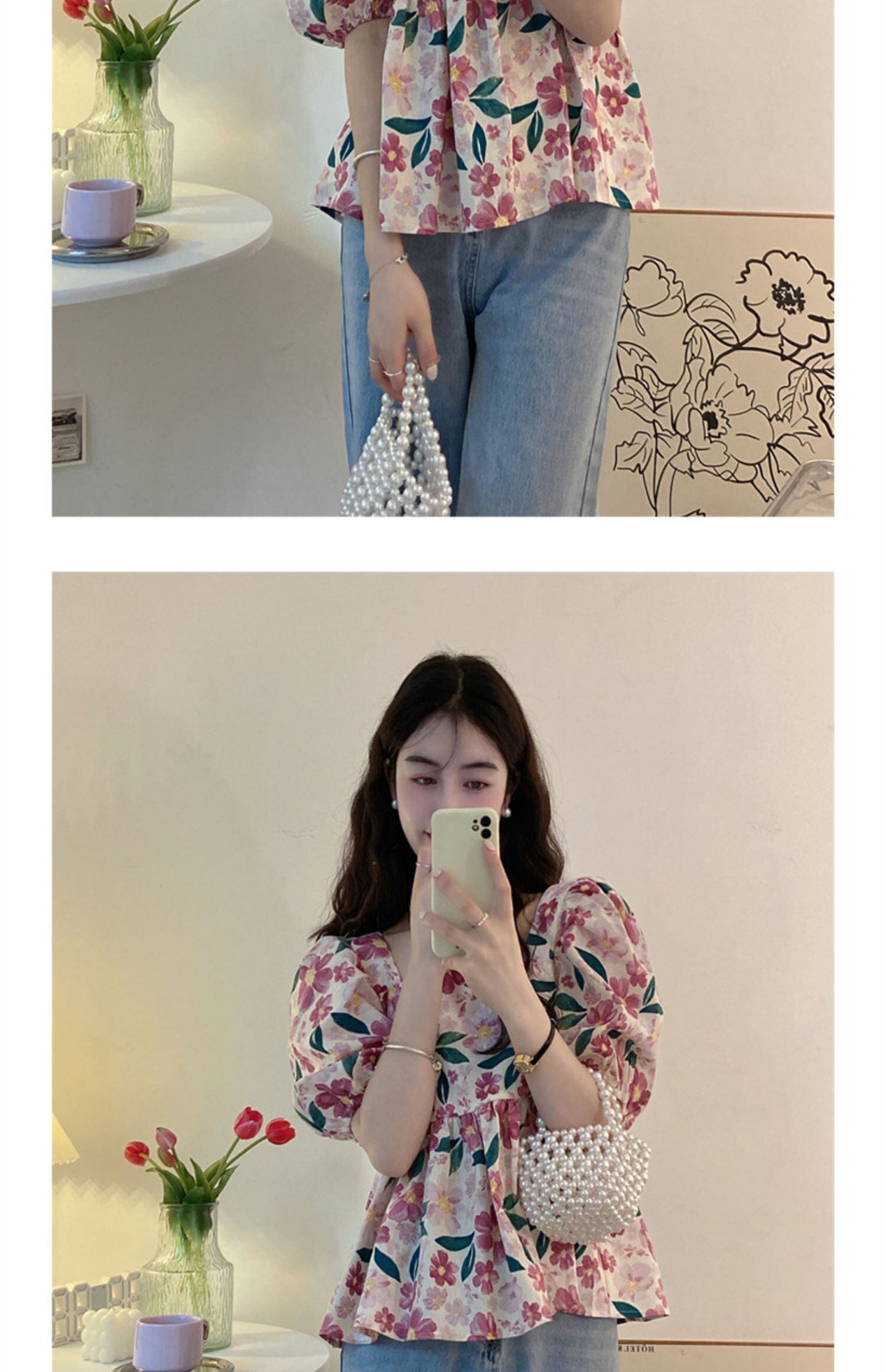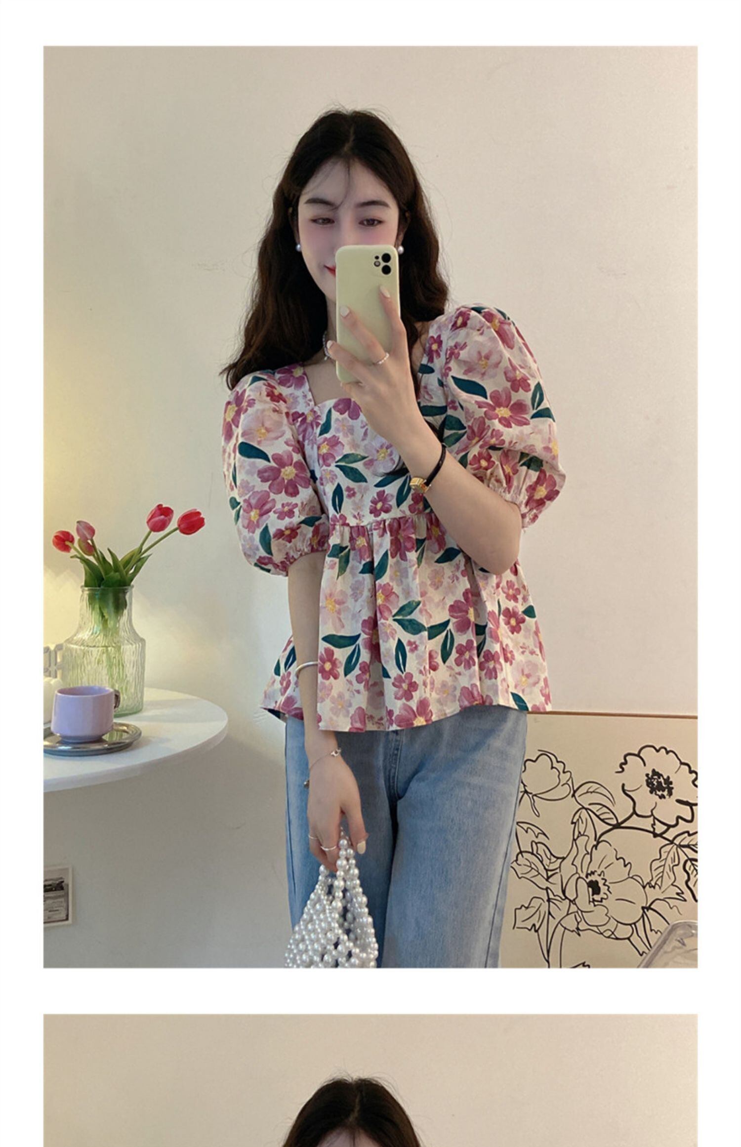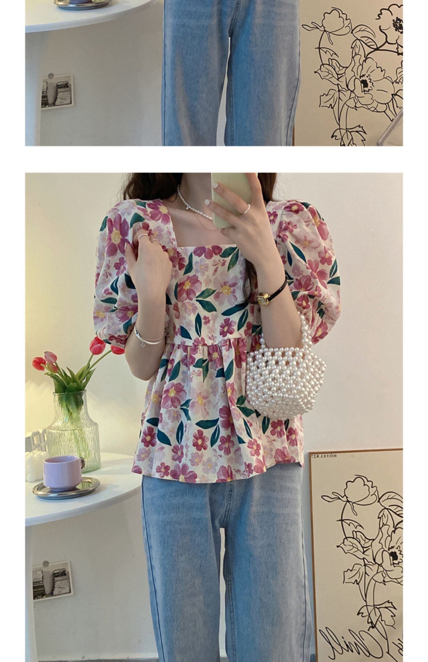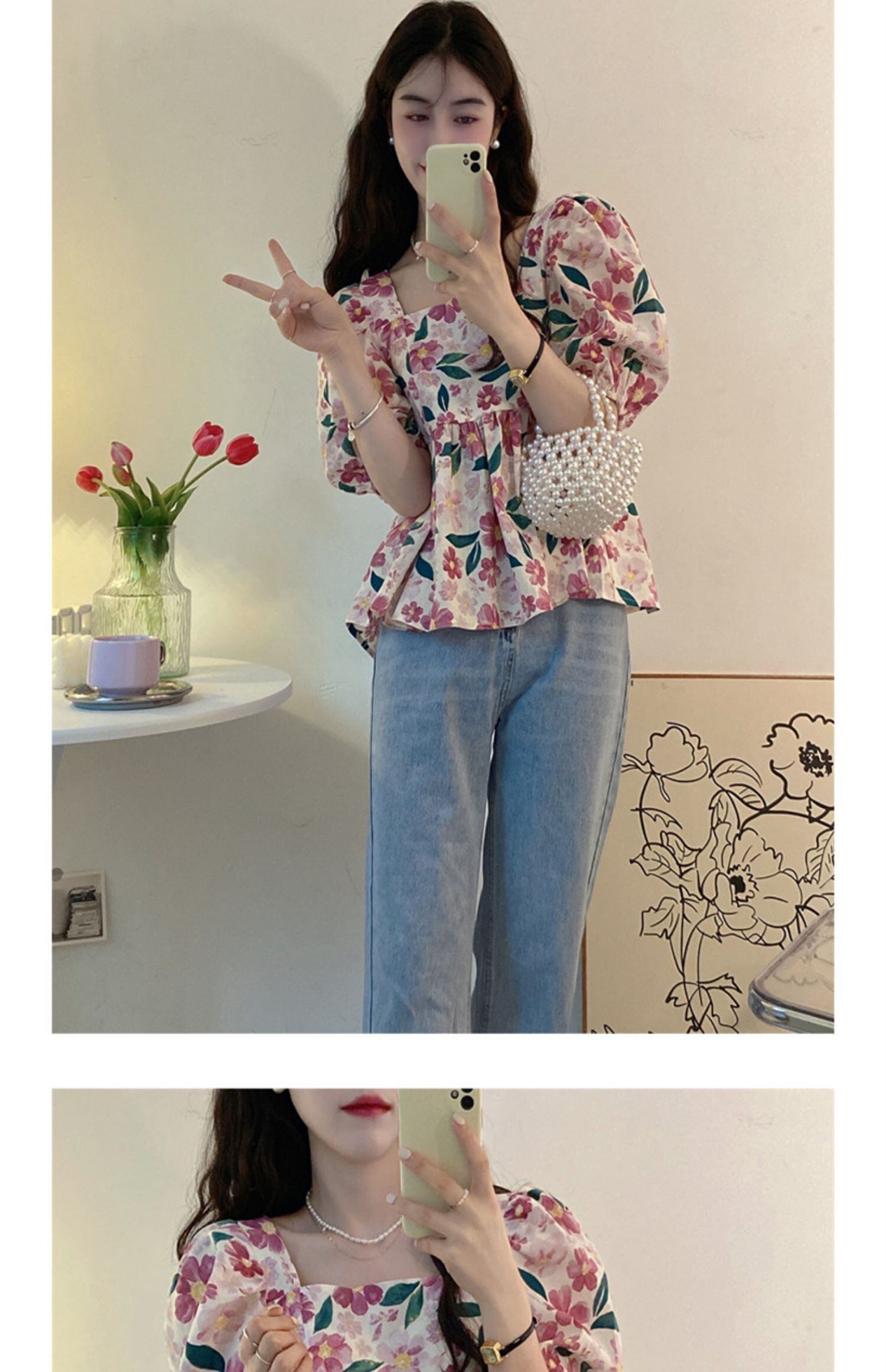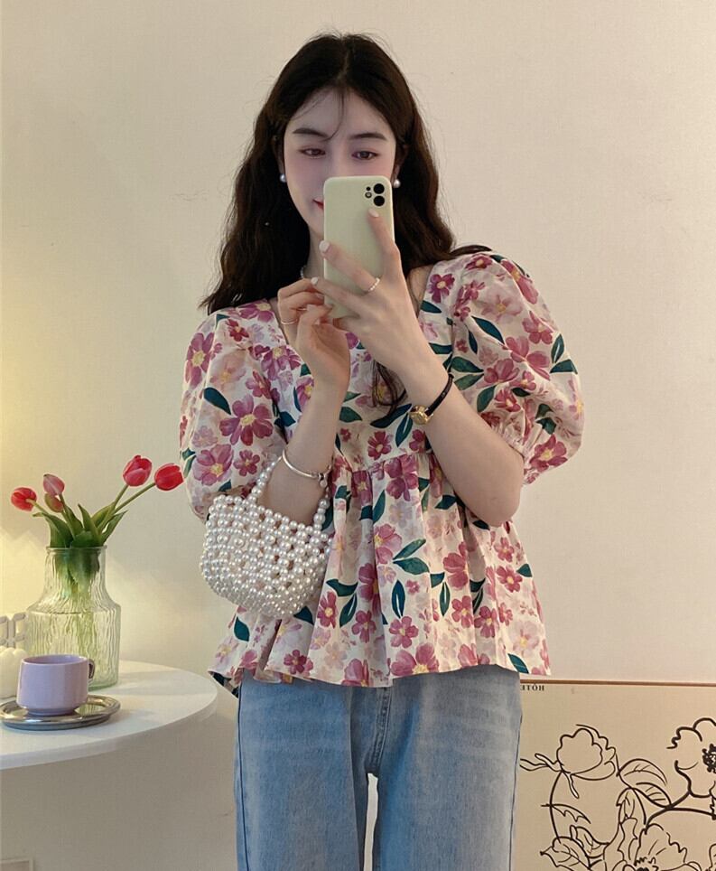 スリーブカラートップス サマーフローラルシャツ 大人ガーリー スウィート キュート カジュアル 夏物 花柄 スクウェア s576146985920541
