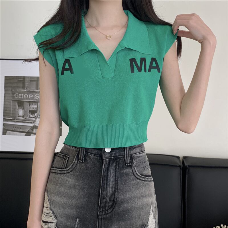 グリーンノースリーブニットセーター サマースタイルショートトップス 夏物 s576147787070091