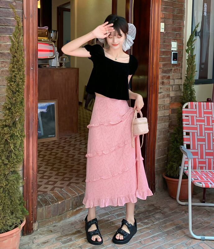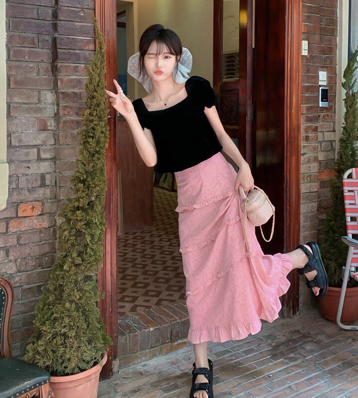 色:ブラックvelvetトップ,flowerspikeピンクスカート