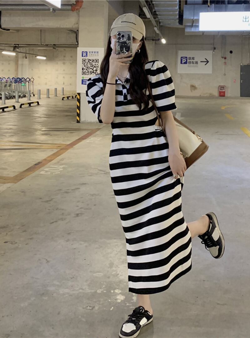 ストライプカラーTシャツ ドレス サマースタンダードカジュアルロングスカート レトロ 夏物 s576174690293023