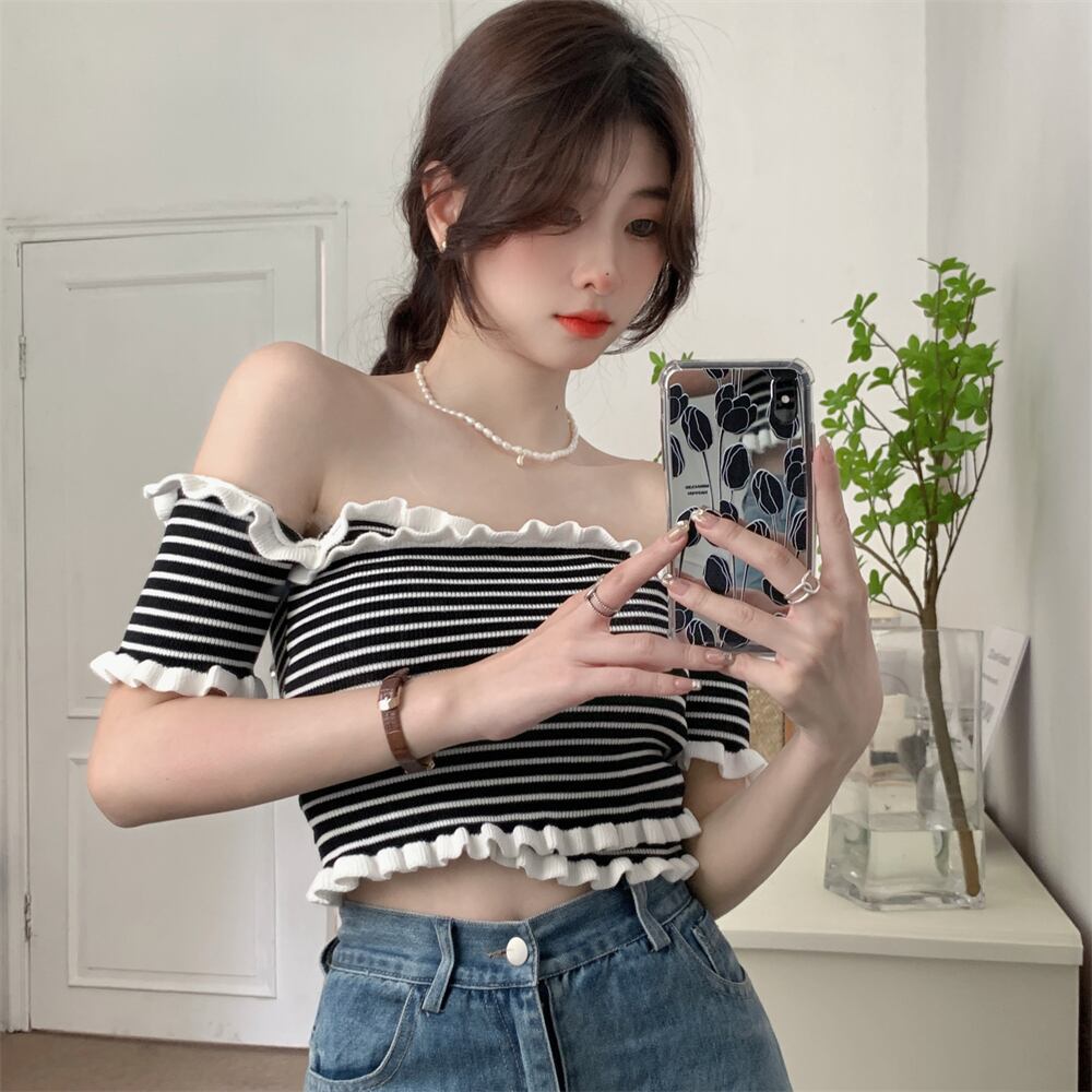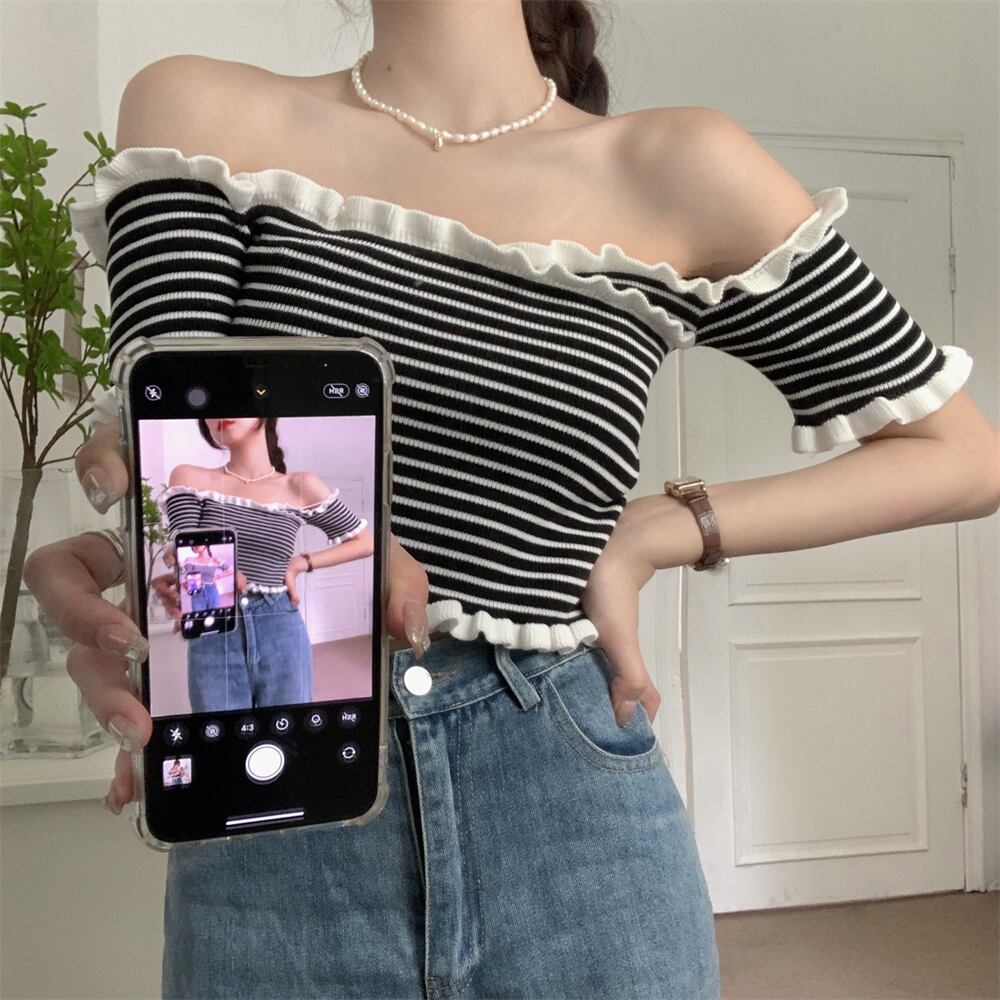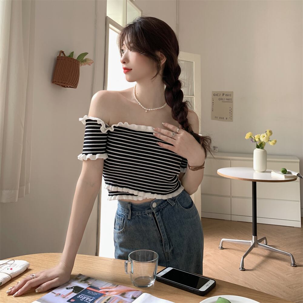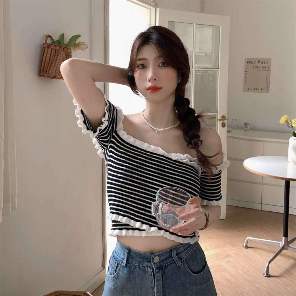 ストライプショートTシャツ サマースリムトップス 夏物 s576119337187464
