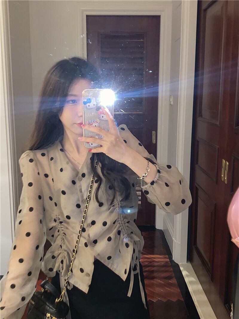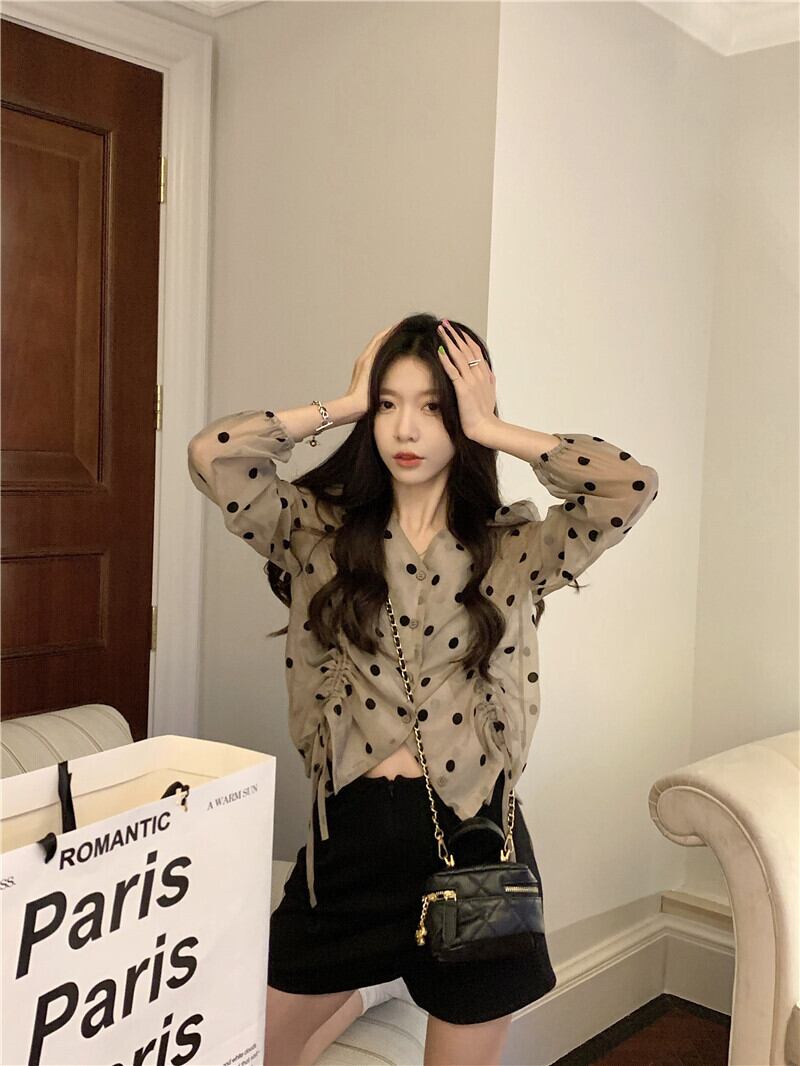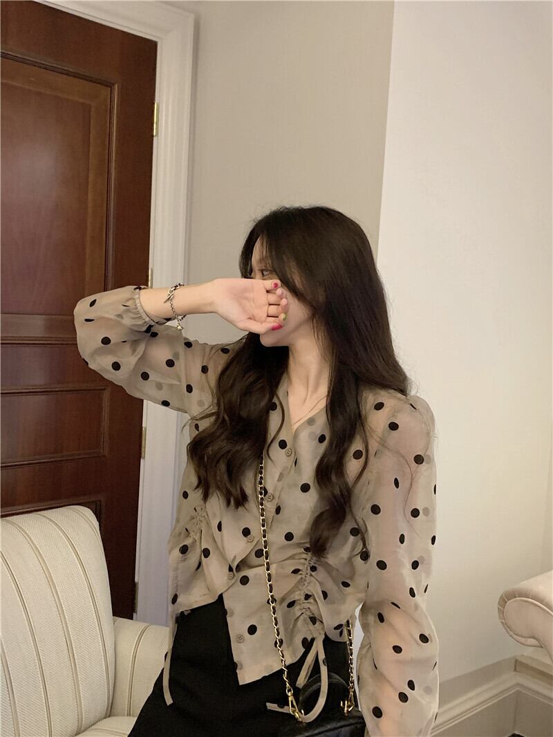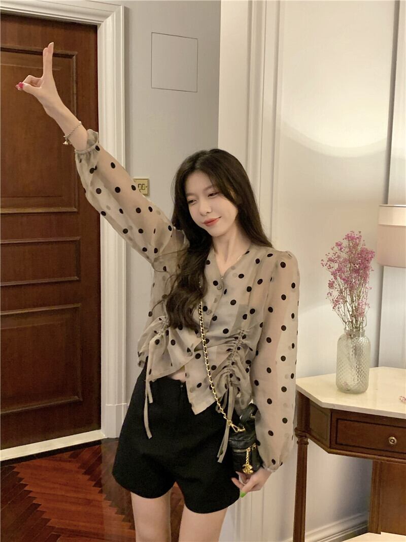 Vネックショートトップス サマー薄手水玉シャツ ロング 夏物 s576138828950252