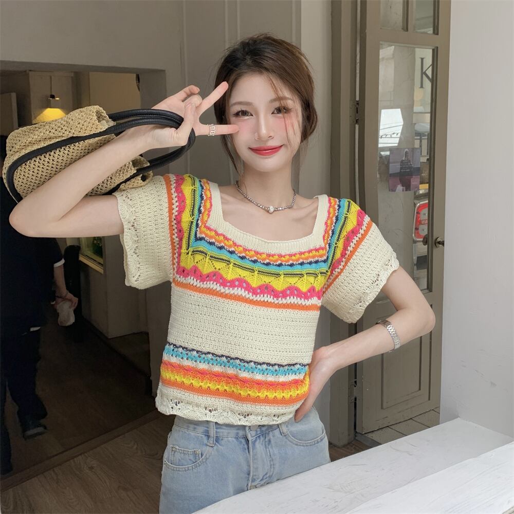 ショートニット サマーカラートップス 大人ガーリー スウィート キュート カジュアル 夏物 スクウェア s576166037108582