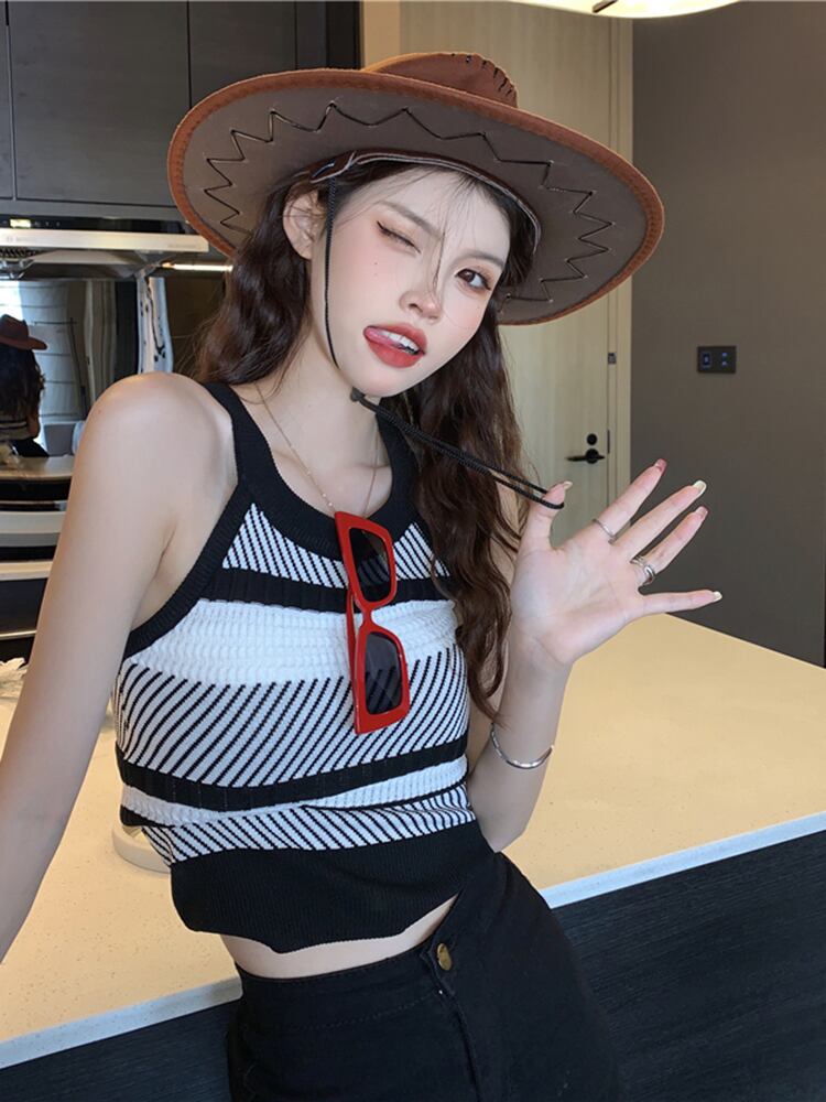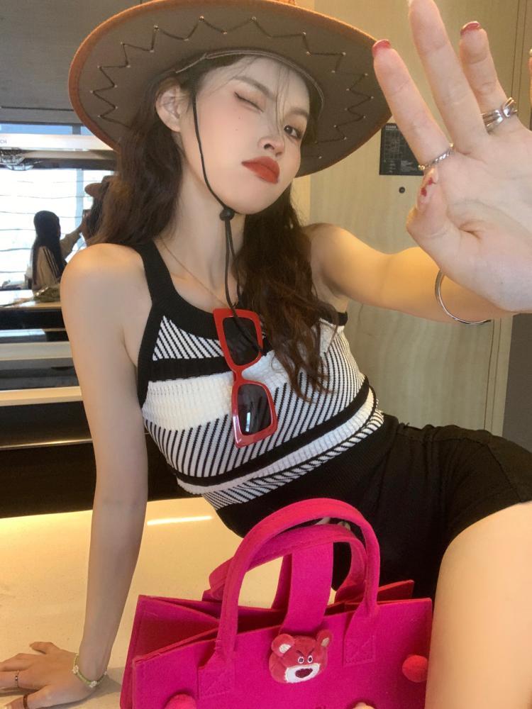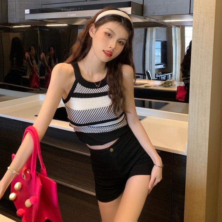 ストライプニットサマースリムフィットノースリーブショートトップス 夏物 ピュア s576126049228477