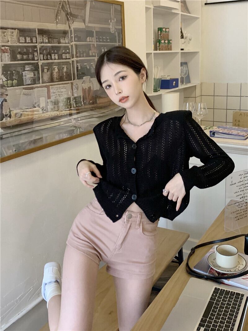 ホワイトニットカーディガンスプリングオータム薄手コート ブラウス ショートトップス ロング 春物 秋物 s576197703165182