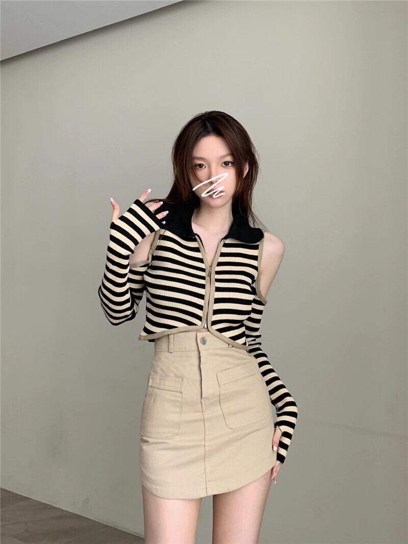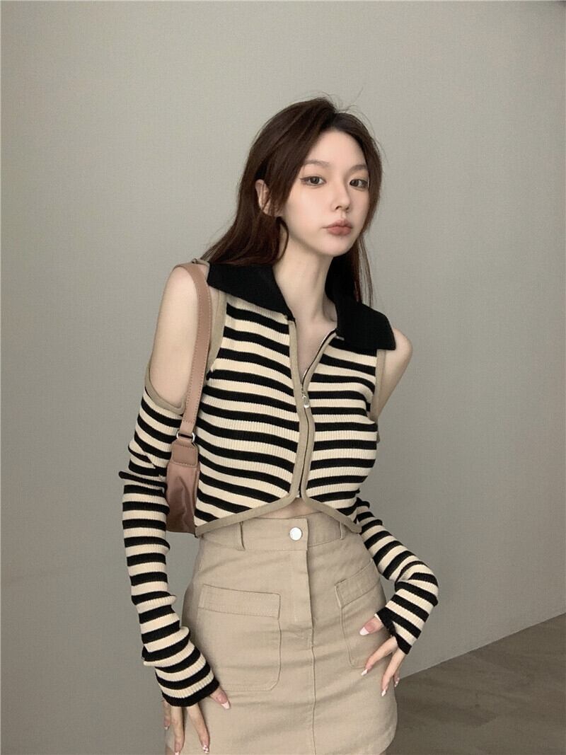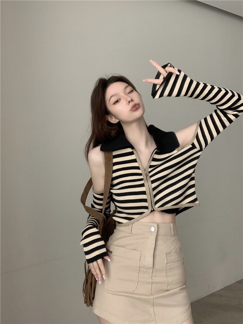 ストライプニットセーター オータムショートトップス ロング 秋物 s576199988408687