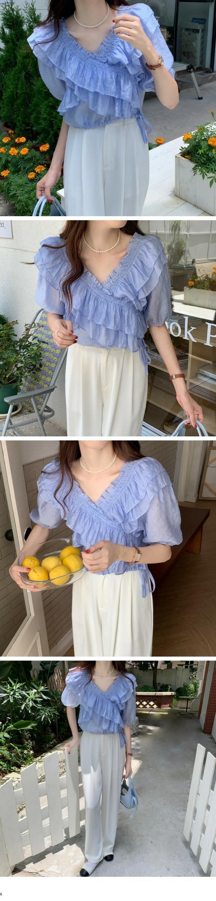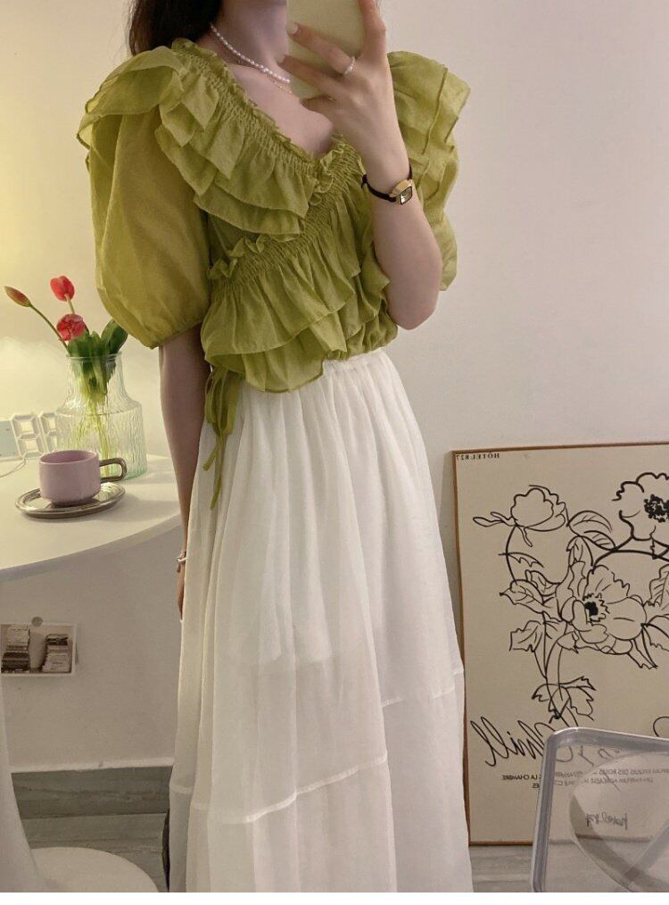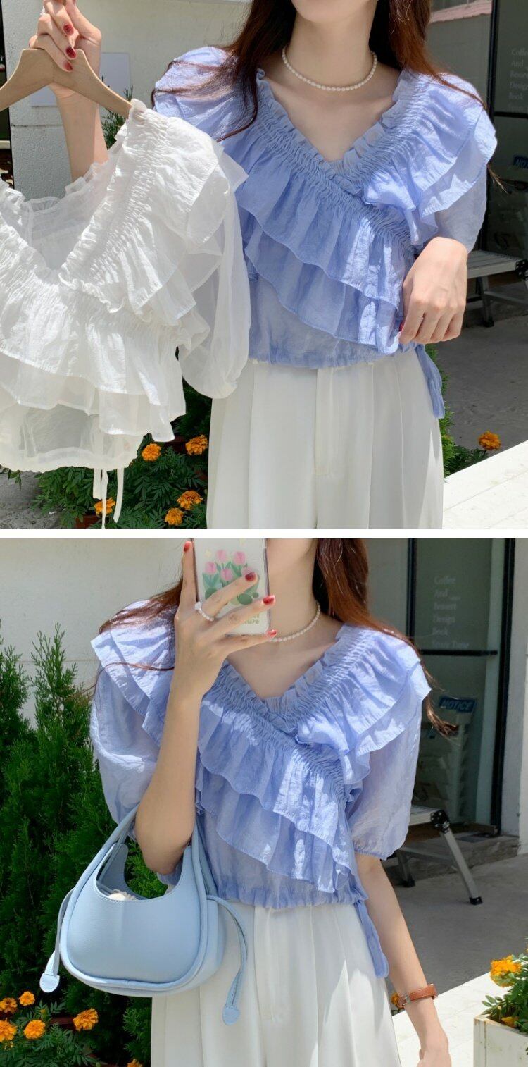 Vネックショートトップス サマースタイルシャツ 大人ガーリー スウィート キュート カジュアル 夏物 s576145478755990