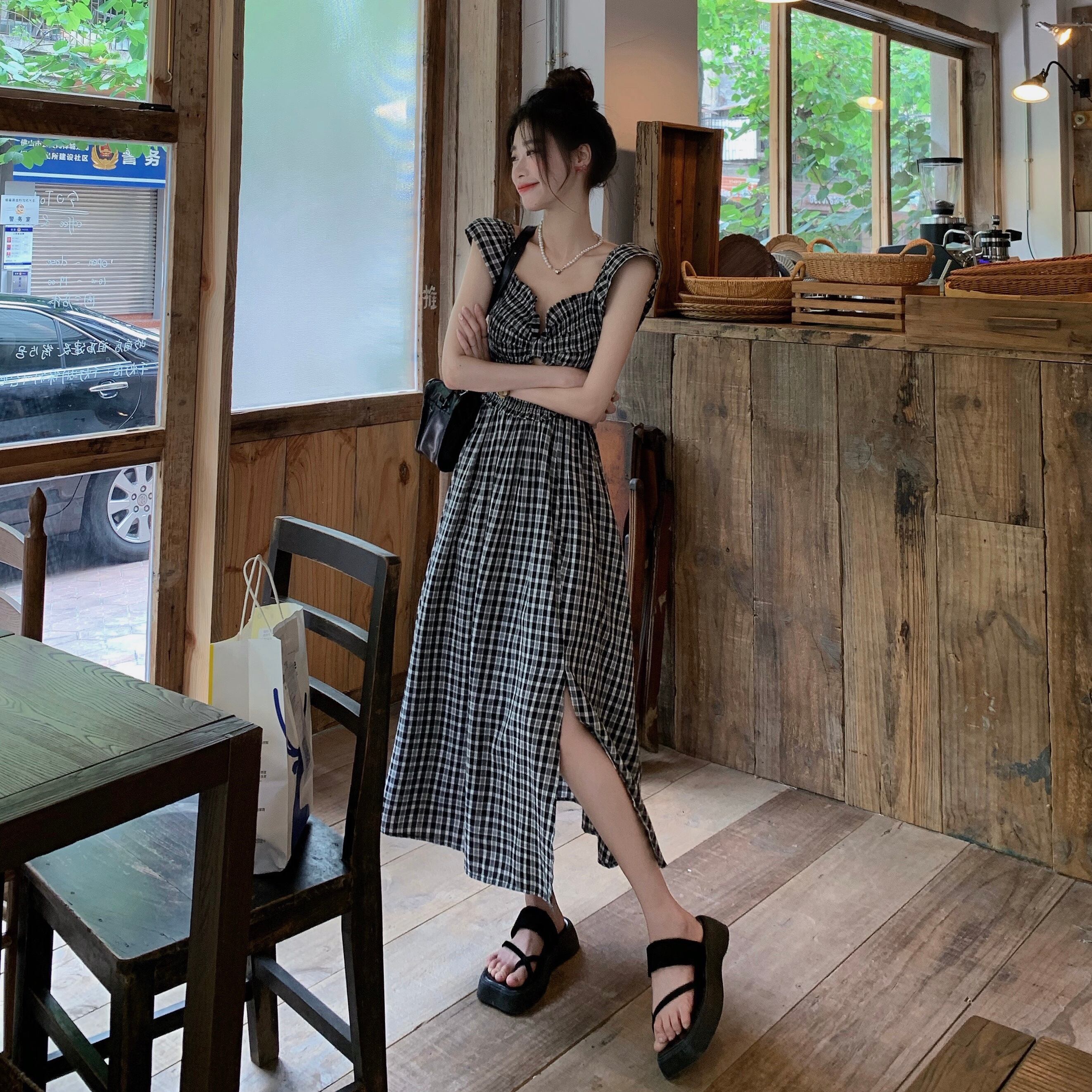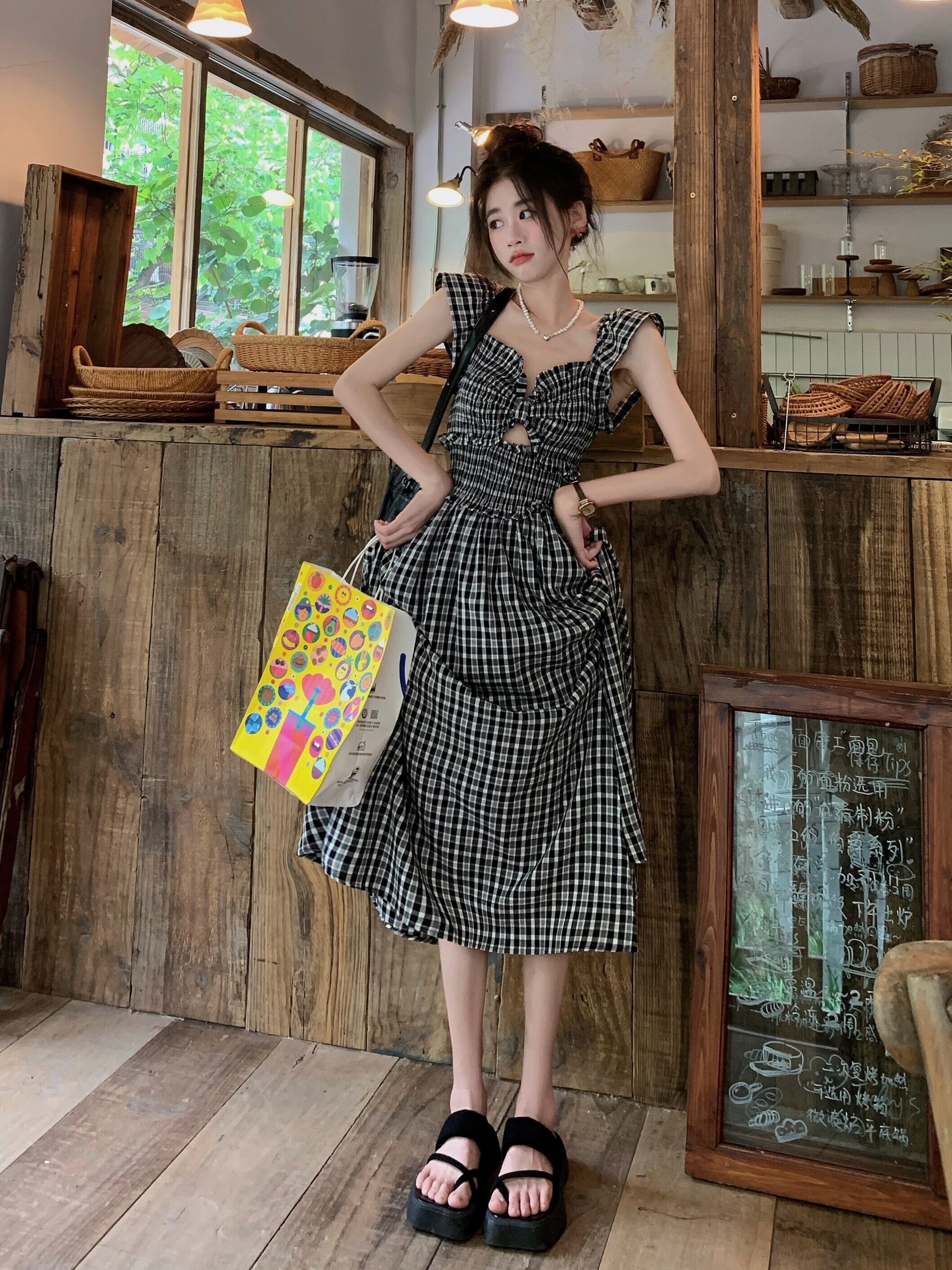 スカート サマーリボン格子柄スリーブドレス ロング 夏物 s576172041419191
