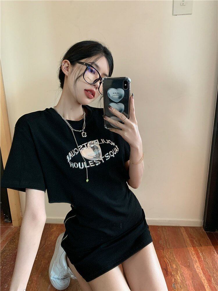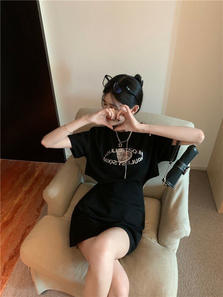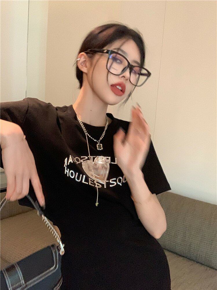 メタルハートプリント柄ブラックスリーブ半袖ドレス スカート サマー ショート ハーフスリーブ 夏物 s576120127298185