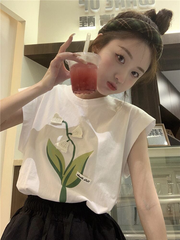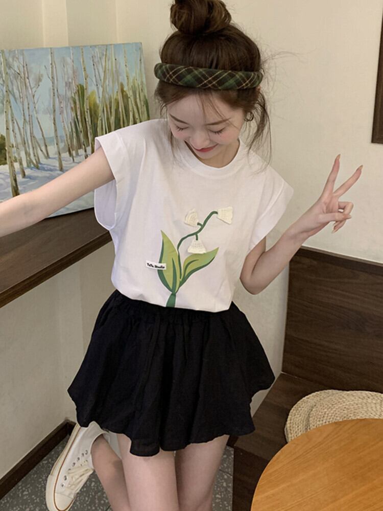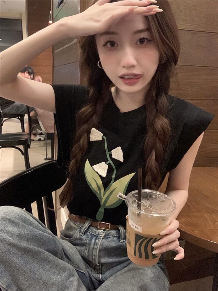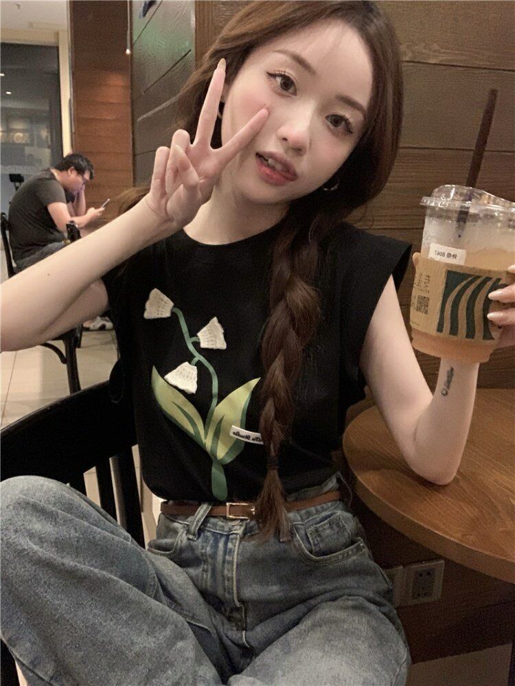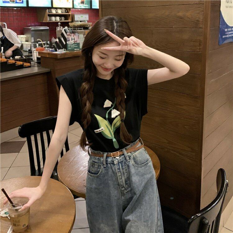 ブラックノースリーブTシャツ サマーアドバンスルーズトップス 夏物 s576176099379504
