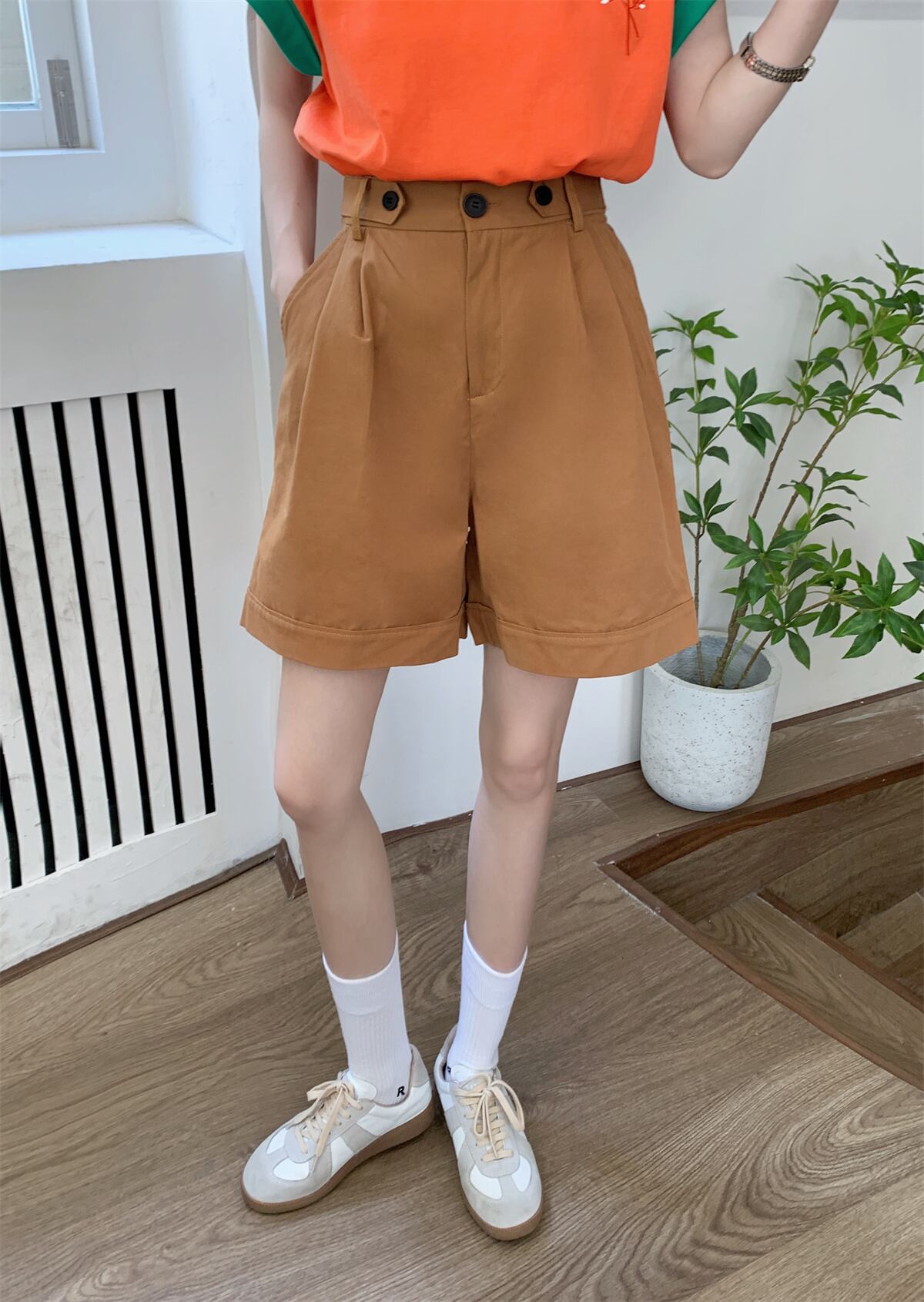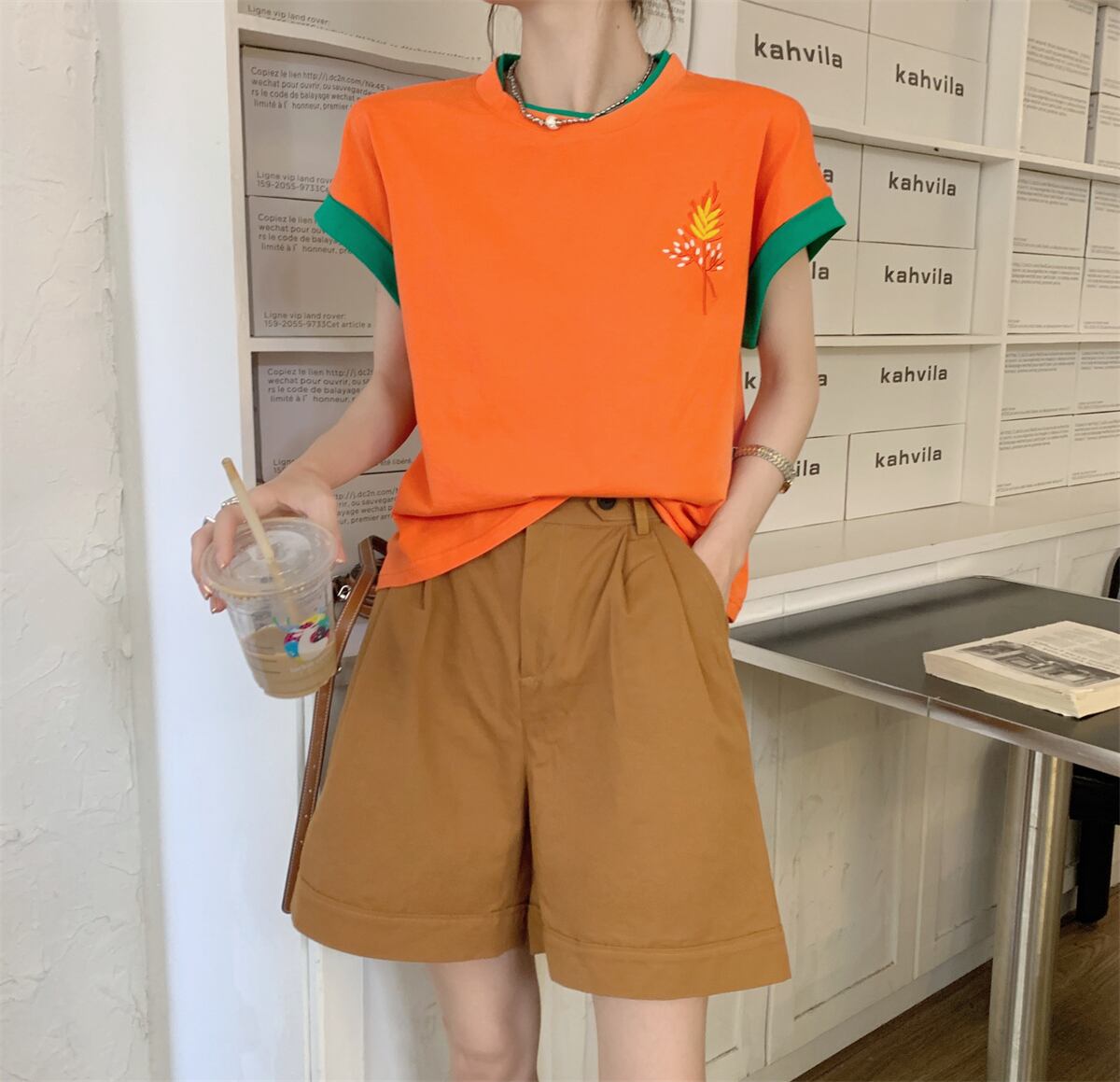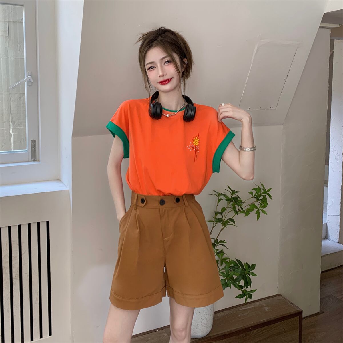 色:オレンジトップ,カーキshorts