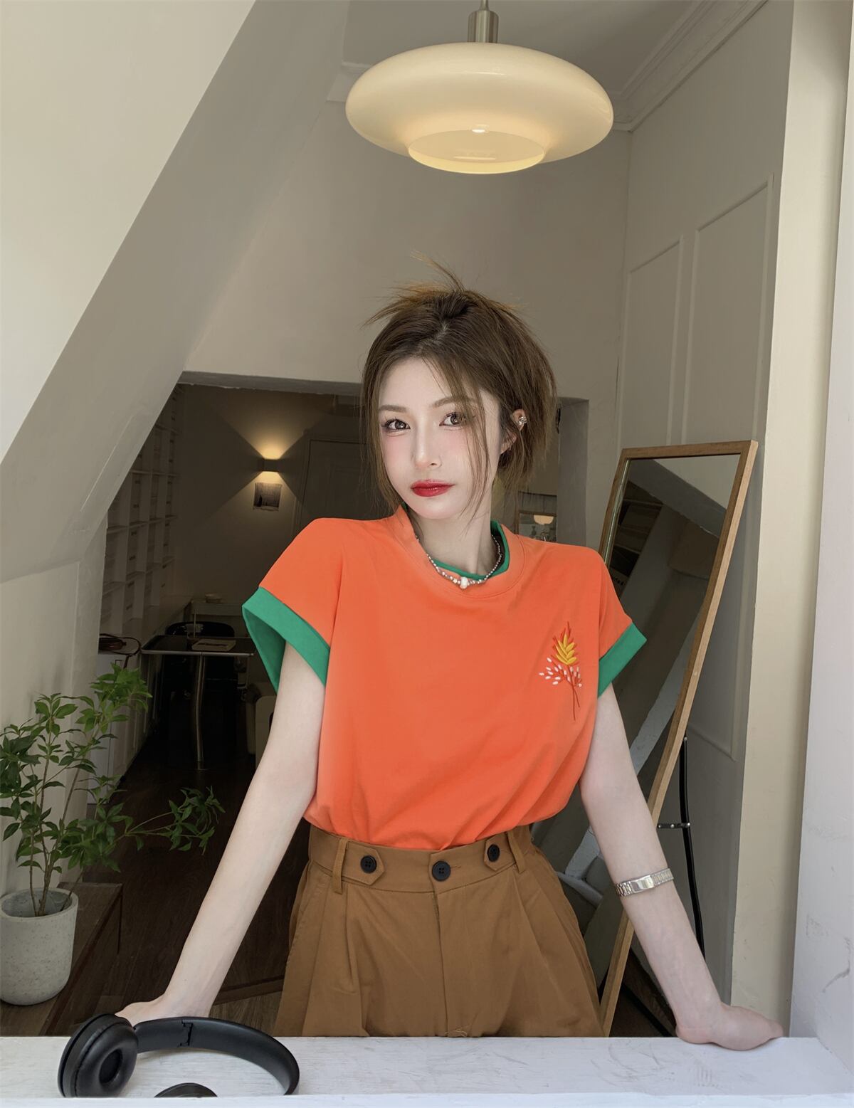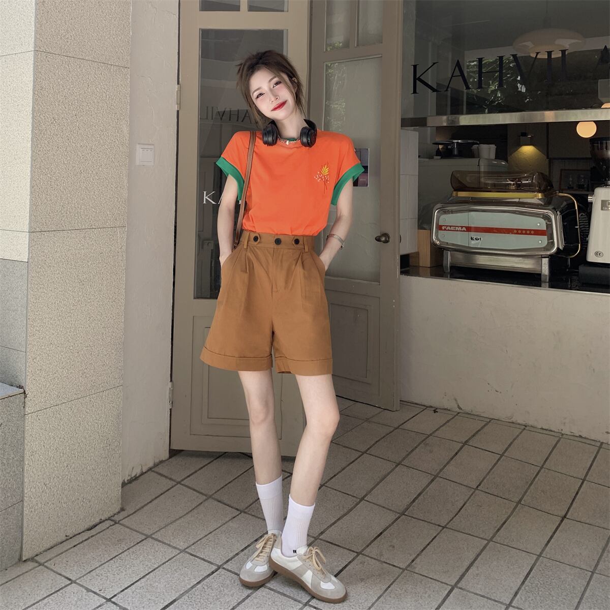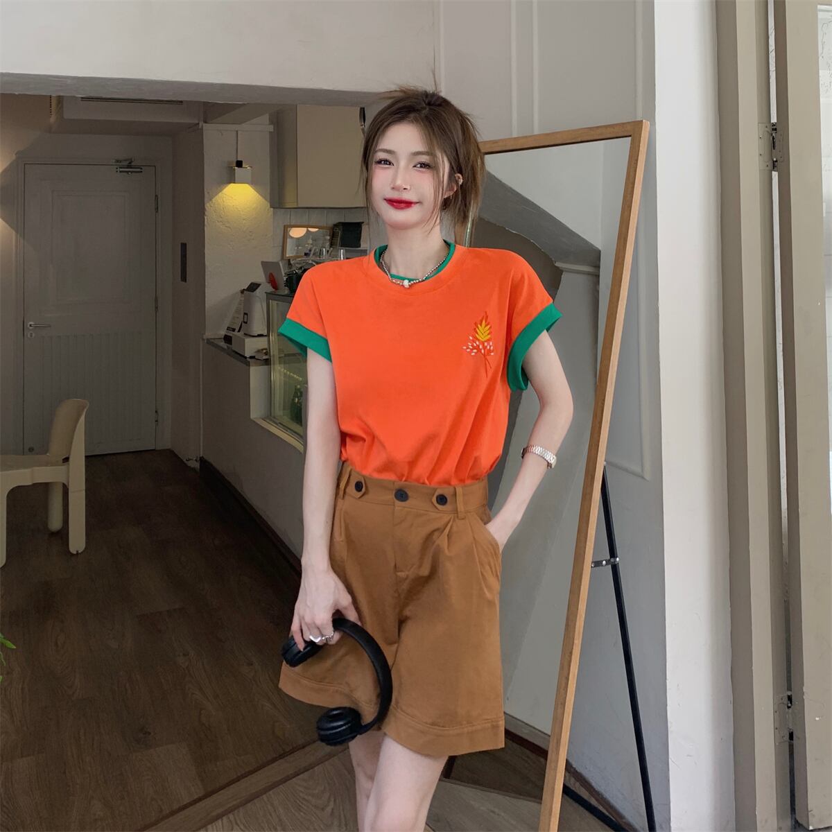 色:オレンジトップ,カーキshorts
