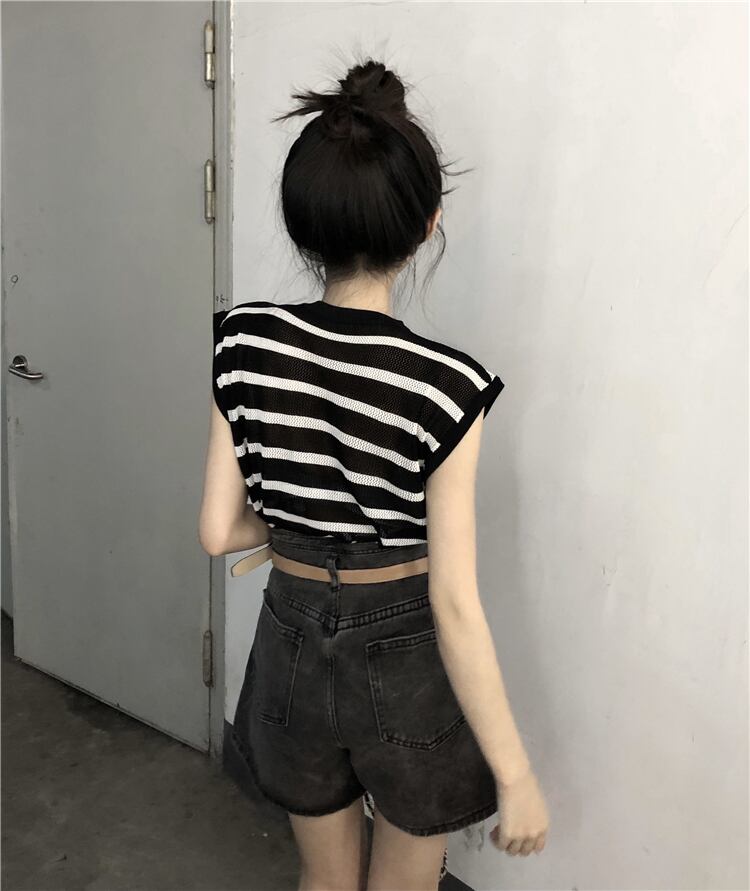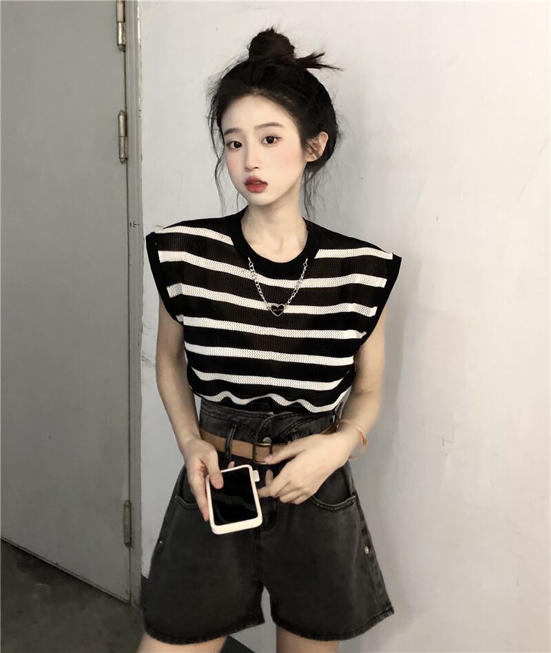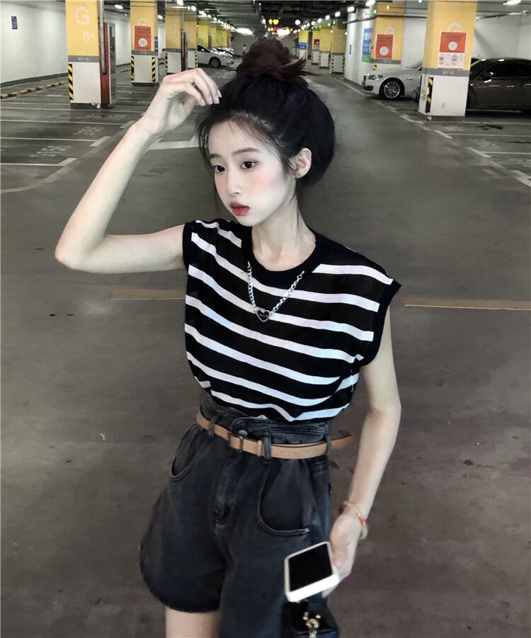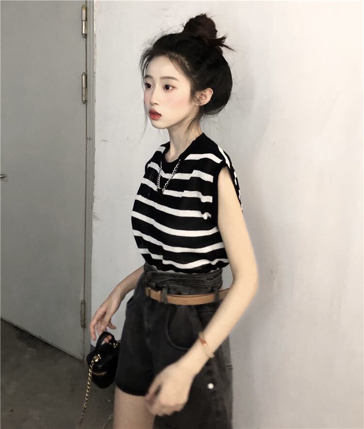 ストライプノースリーブTシャツ サマースタイルルーズニットトップス 夏物 s576165212557293
