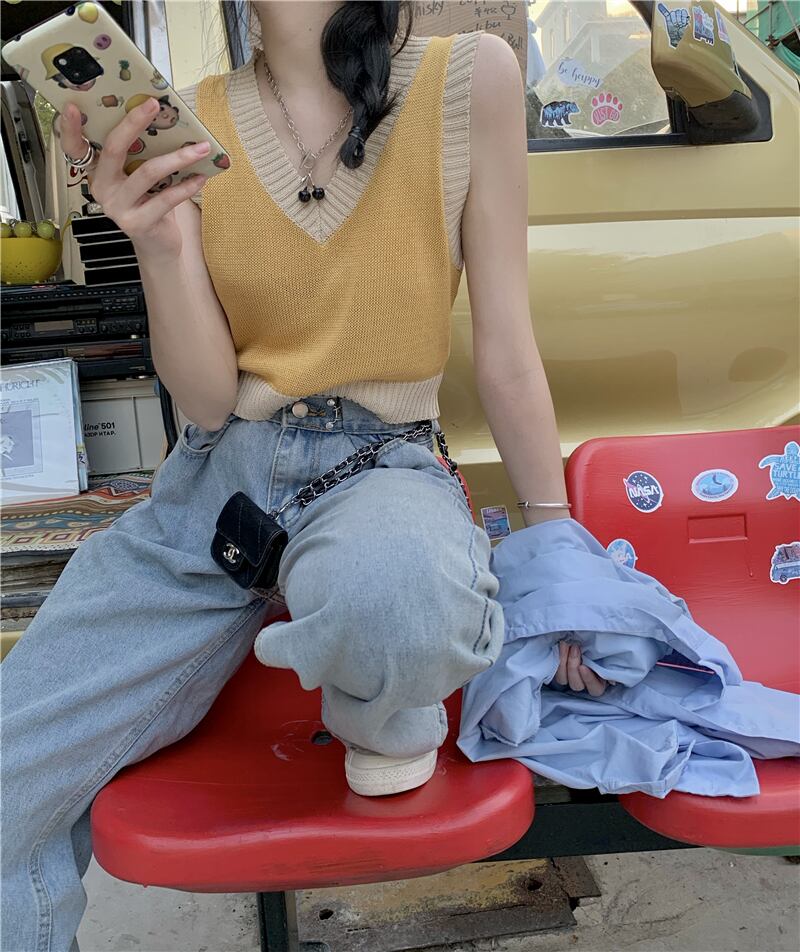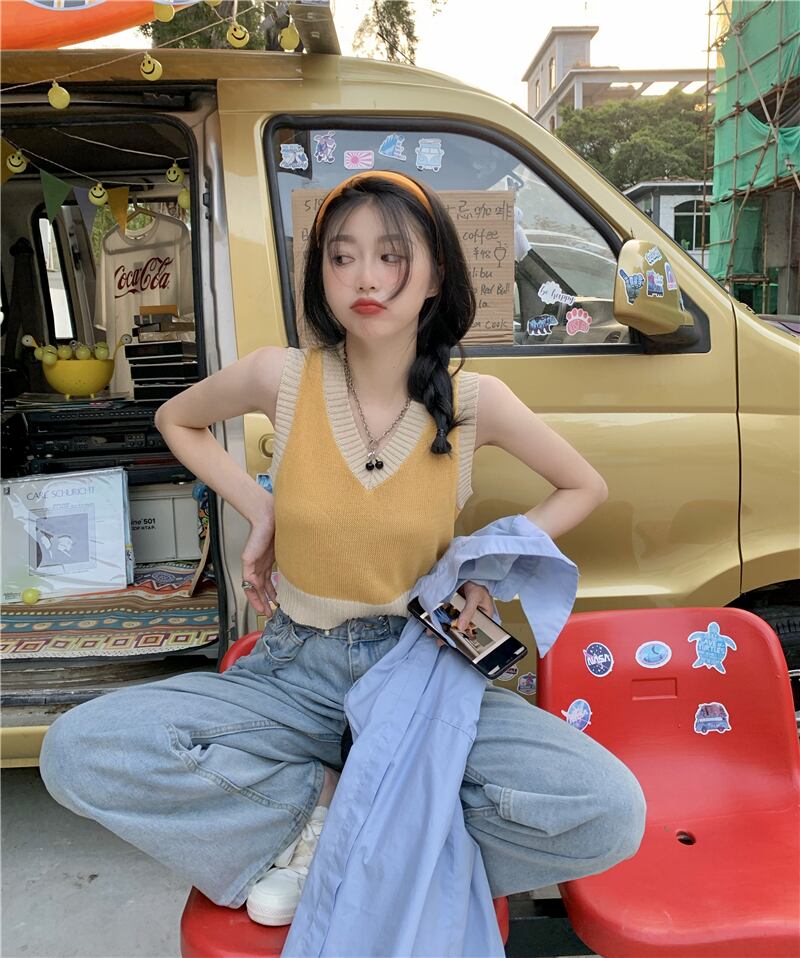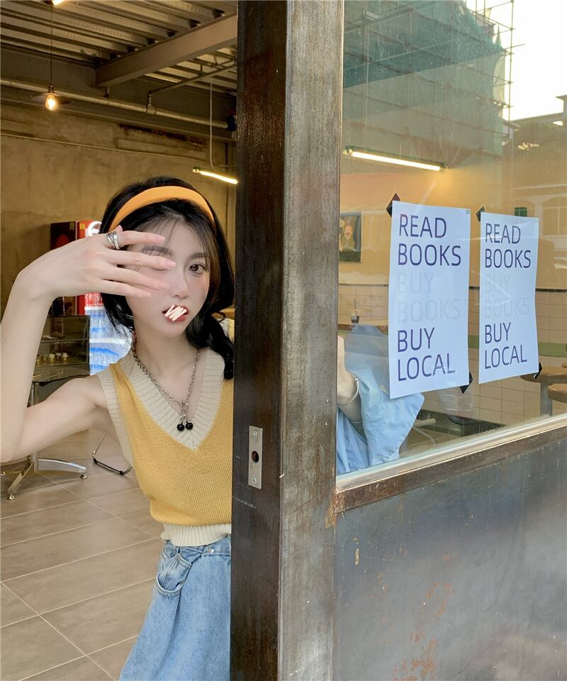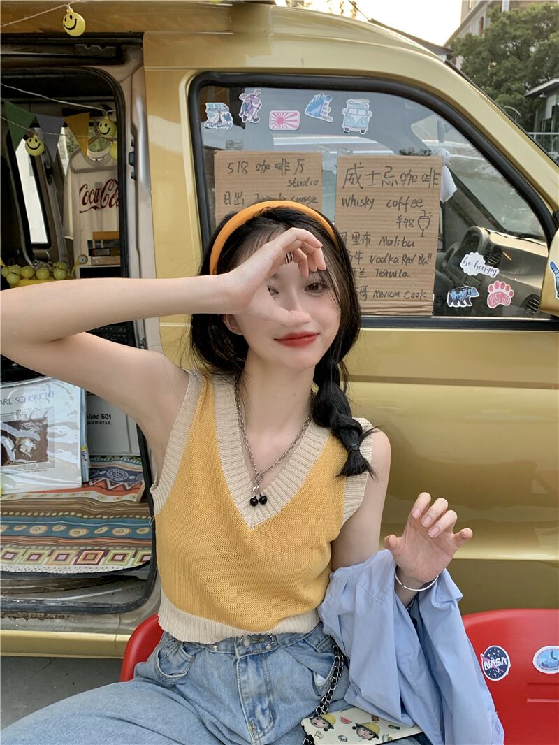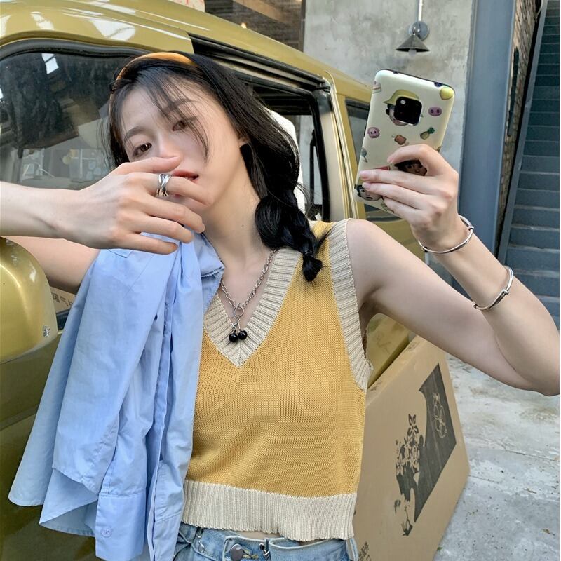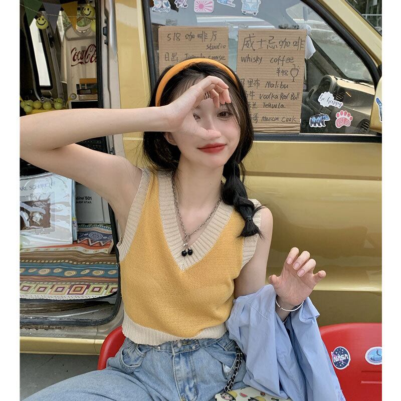 ニットサマースリムノースリーブVネックショートトップス 大人ガーリー スウィート キュート カジュアル 夏物 s576189818379113