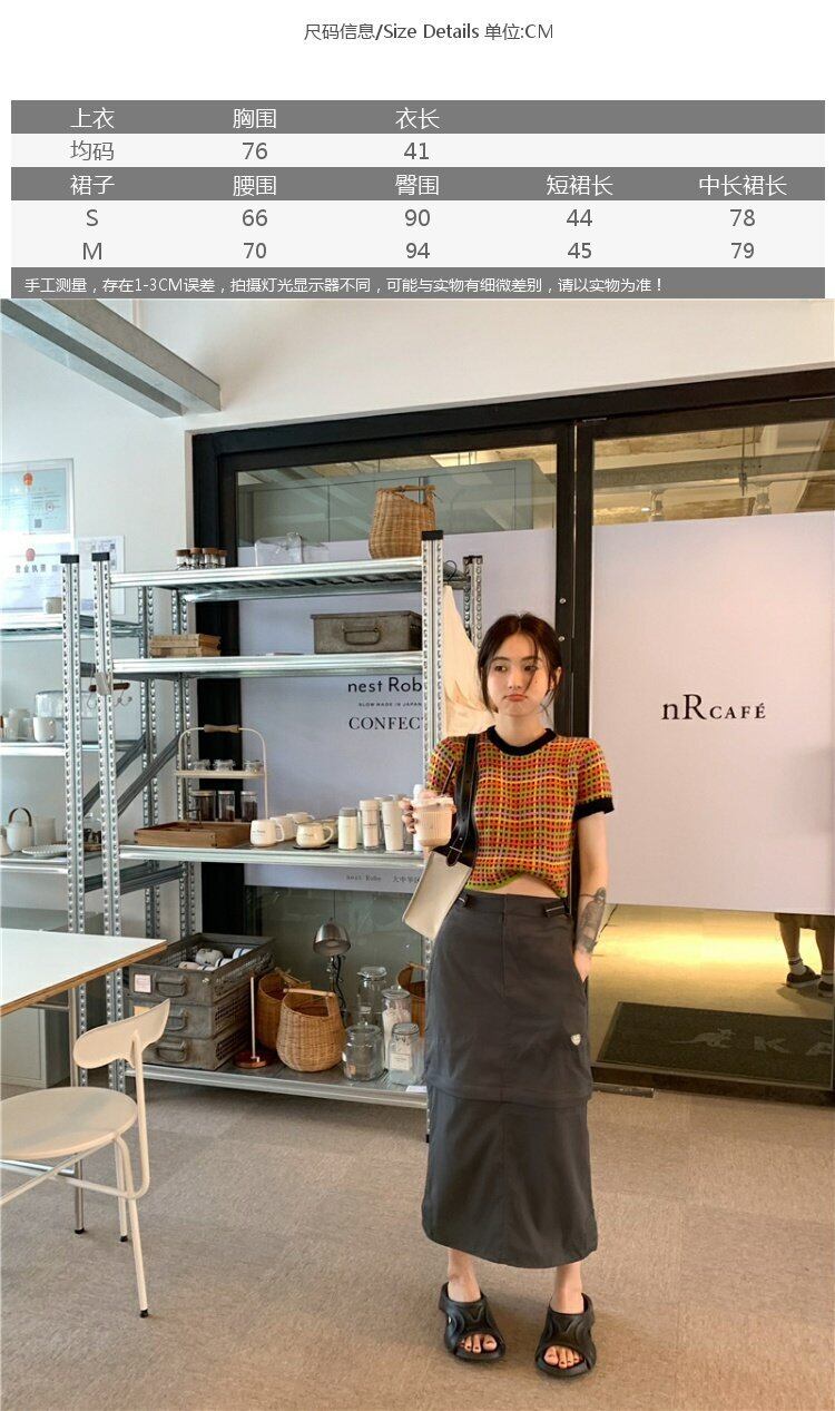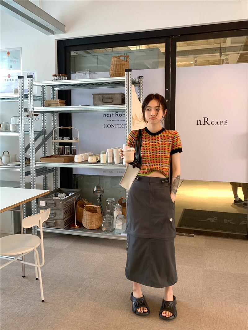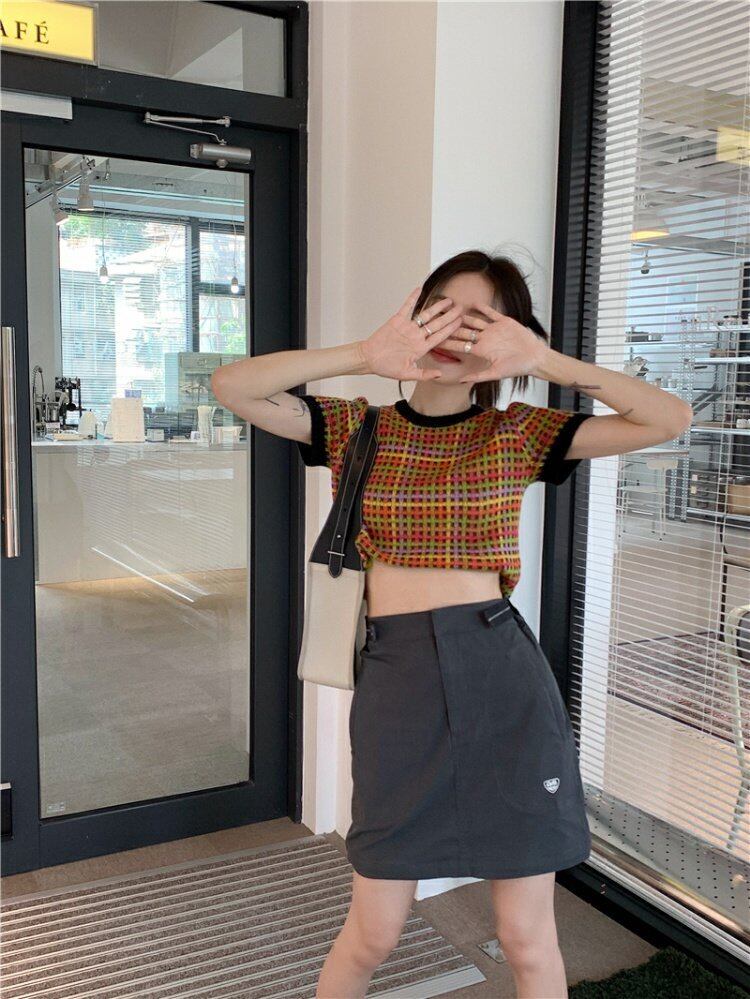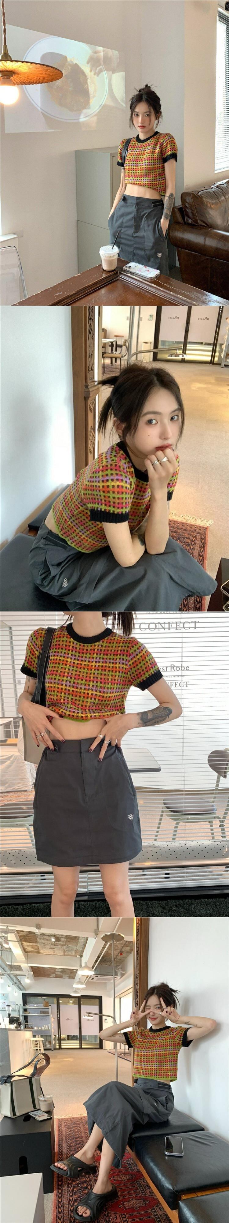 格子柄ショートニットセーター サマースリムトップス 大人ガーリー スウィート キュート カジュアル 夏物 s576127394919233