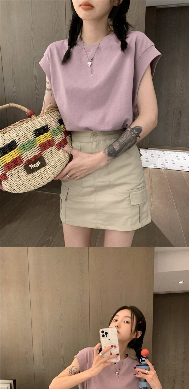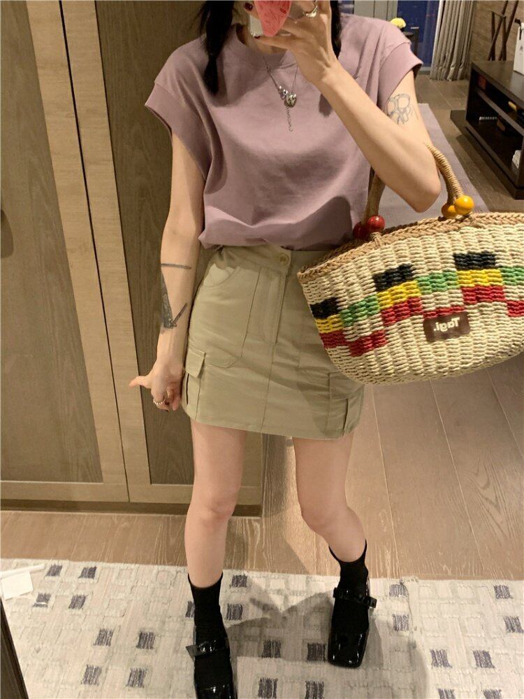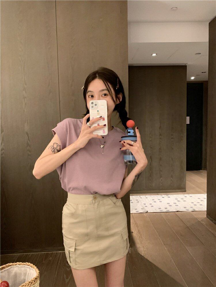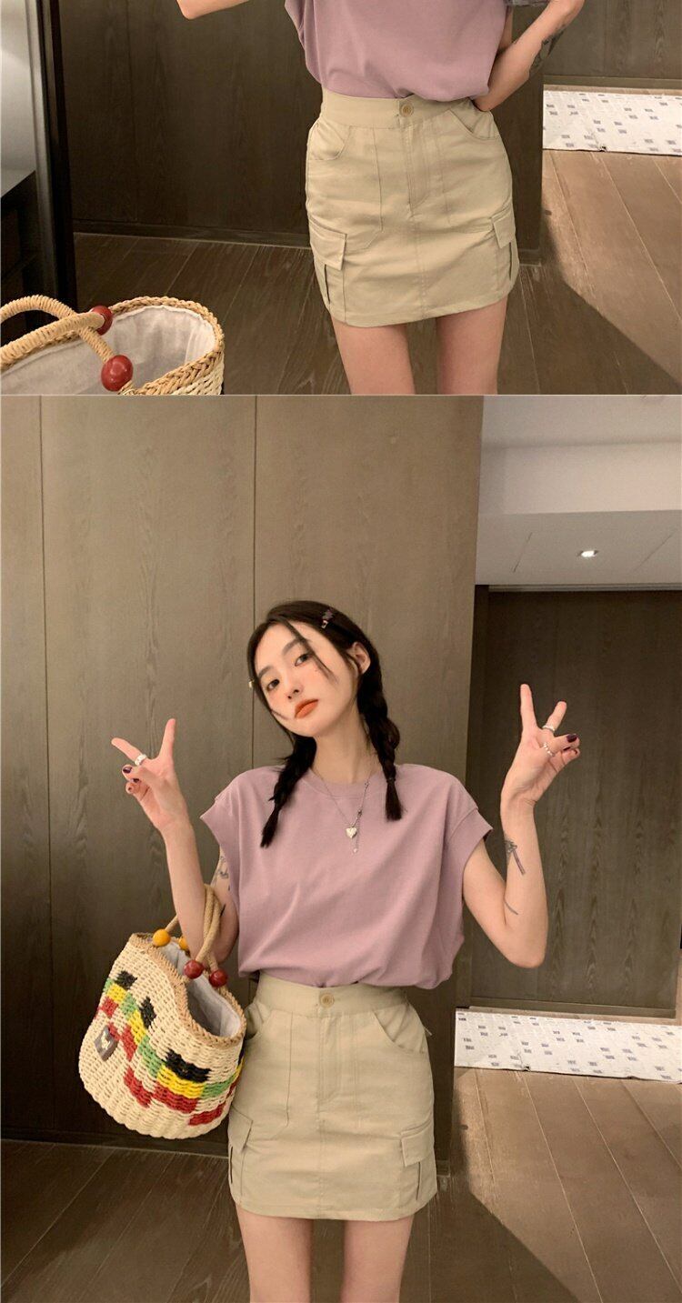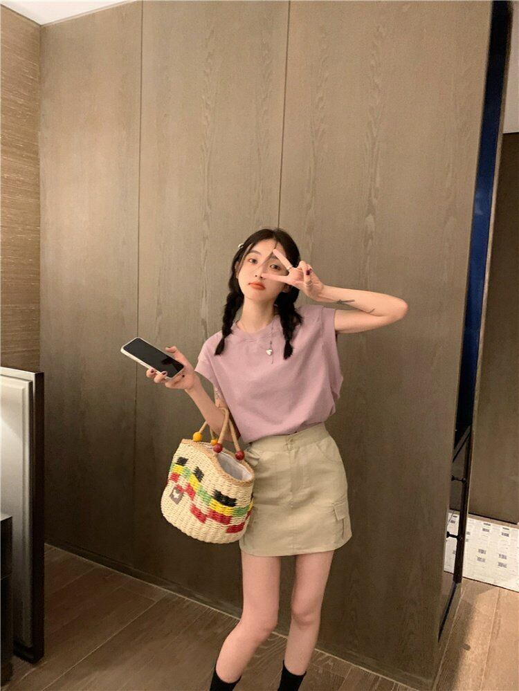 色:ベージュT-shirt,ピンクパープルT-shirt,カーキスカート