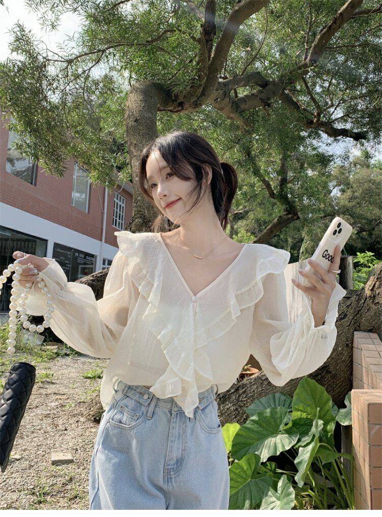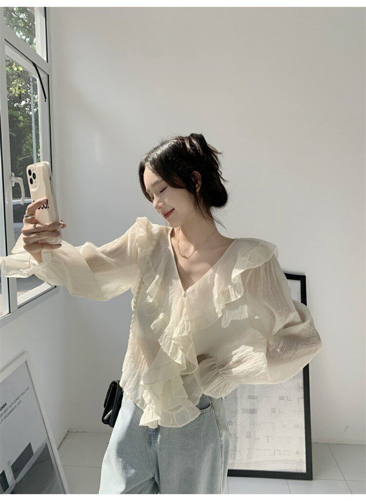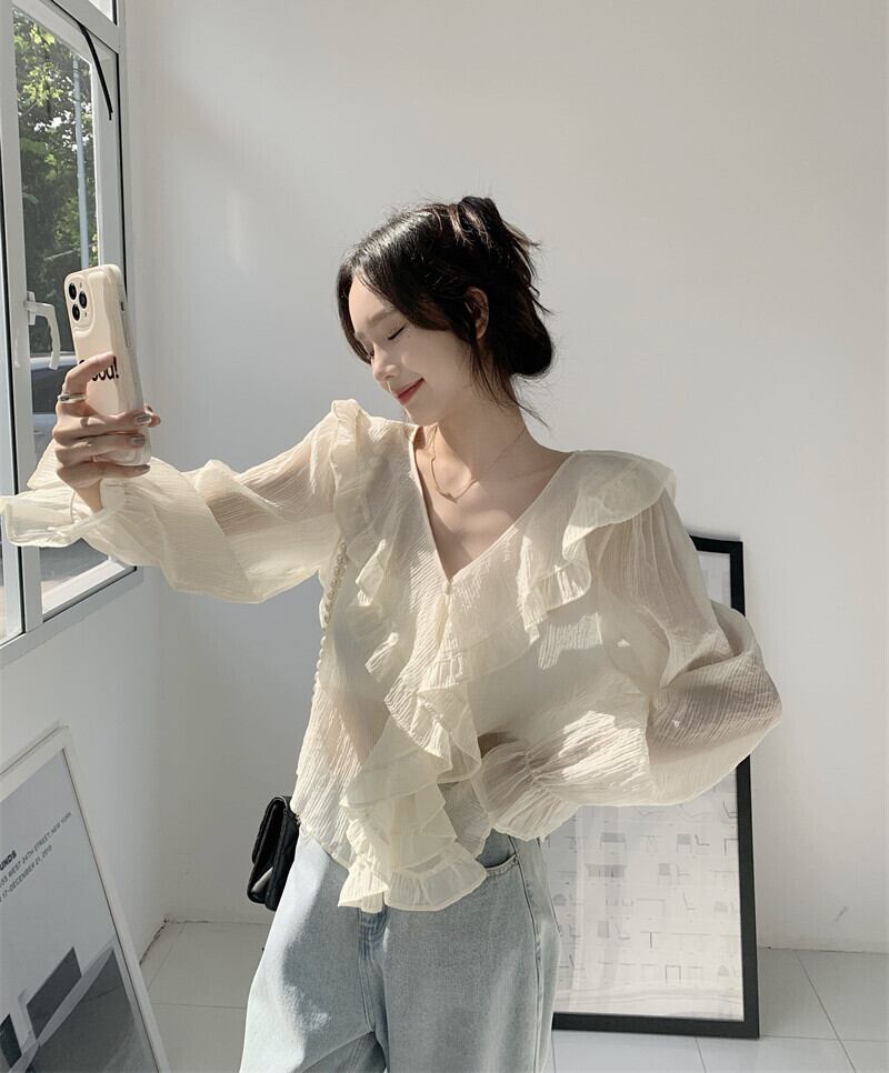 Vネックトップス サマースタイルシフォンシャツ ロング 大人ガーリー スウィート キュート カジュアル 夏物 s576188385792911