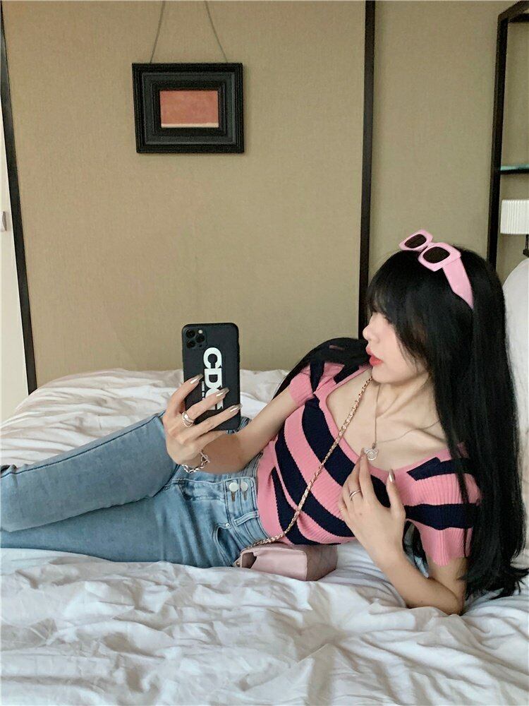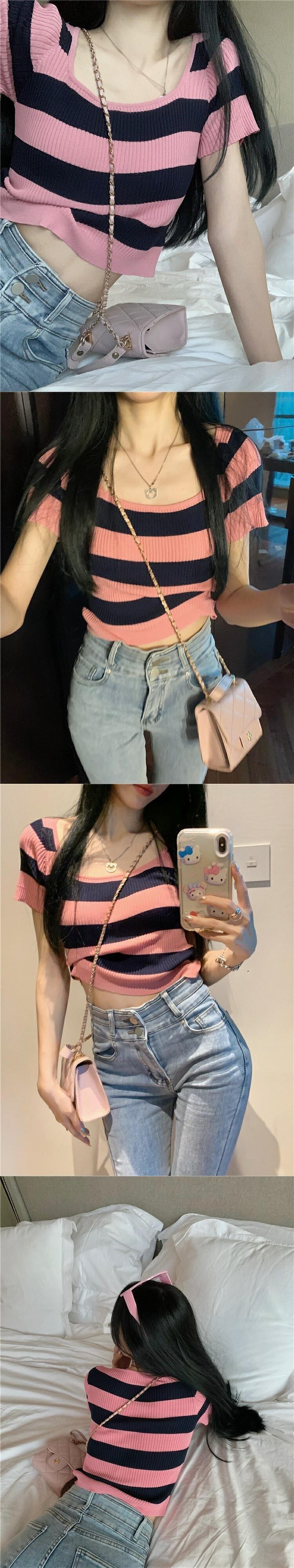ストライプショートニットセーター サマースリムカラートップス 大人ガーリー スウィート キュート カジュアル 夏物 スクウェア s576125636553329