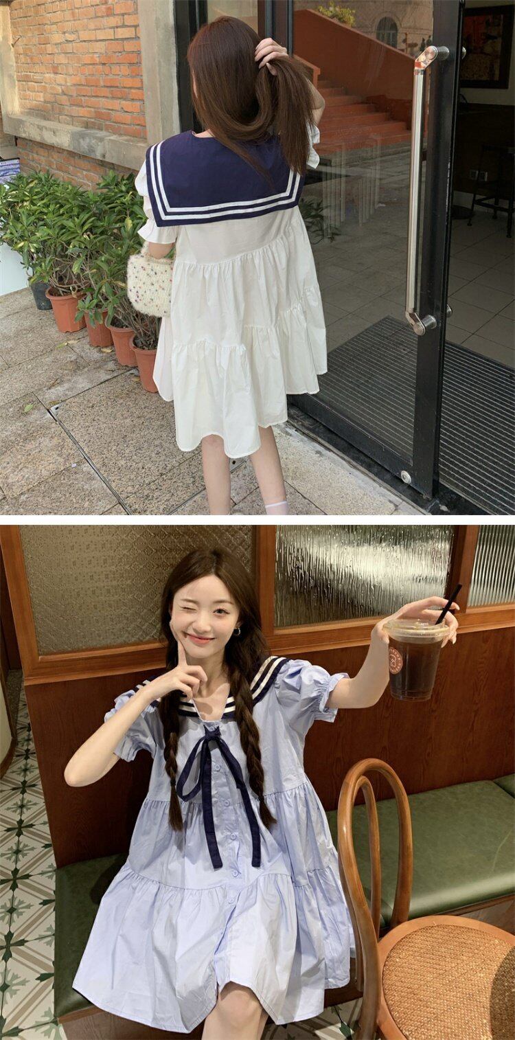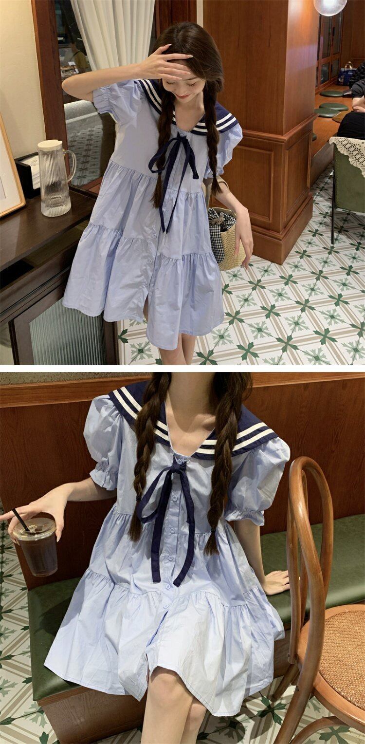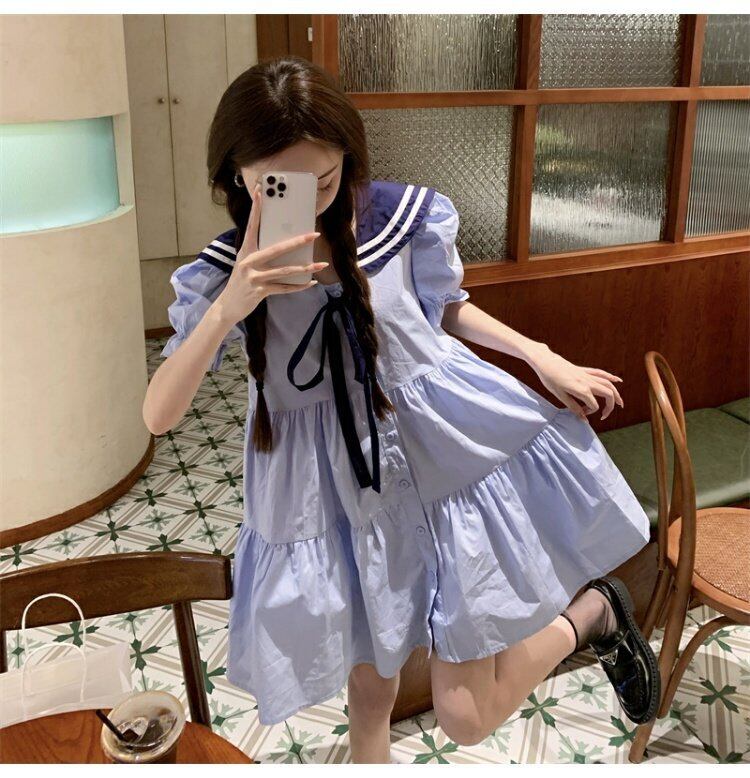 ネイビーカラードレス サマースタイルウェスト薄手半袖スリーブAラインスカート ショート ハーフスリーブ 大人ガーリー スウィート キュート カジュアル 夏物 s576188344678652