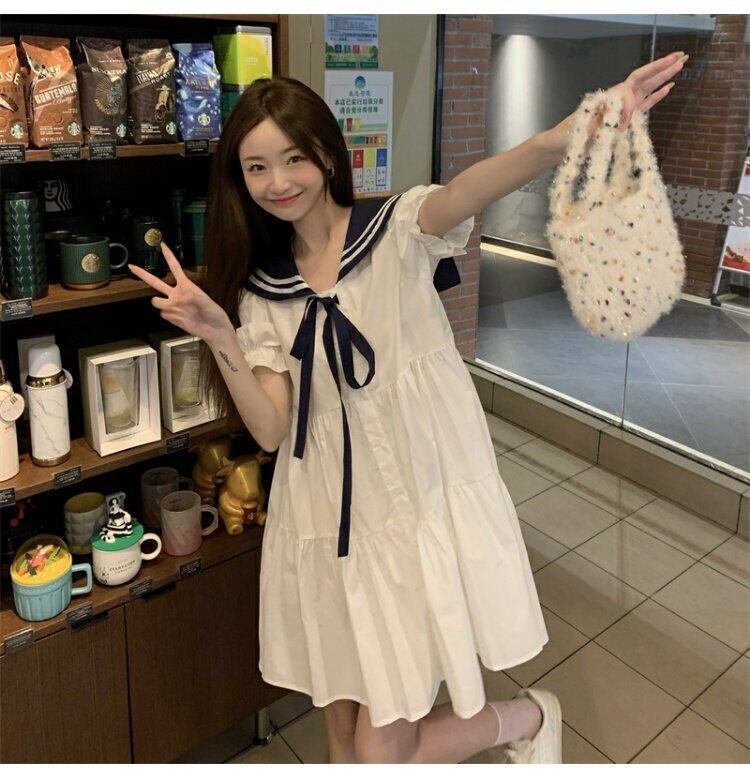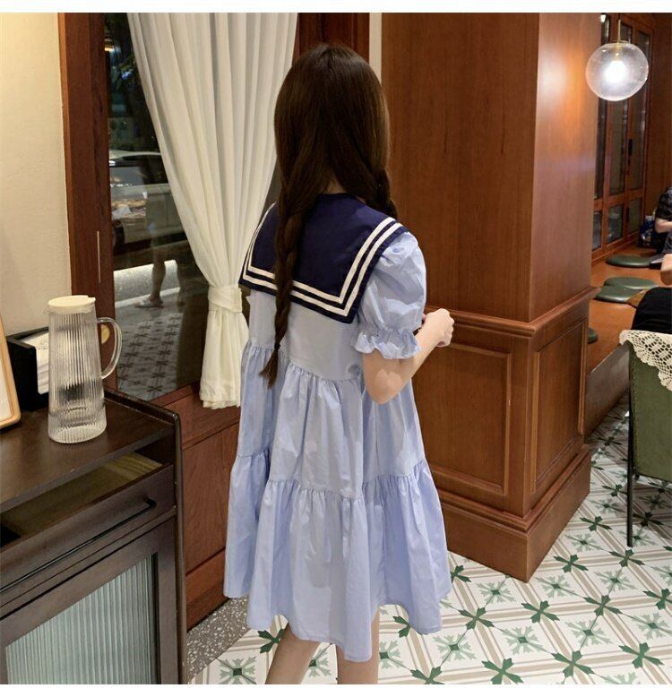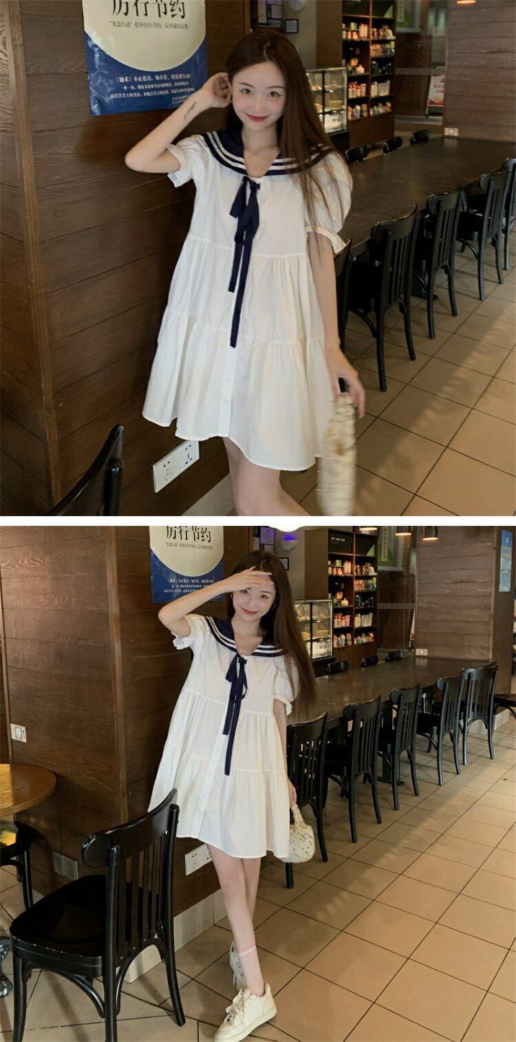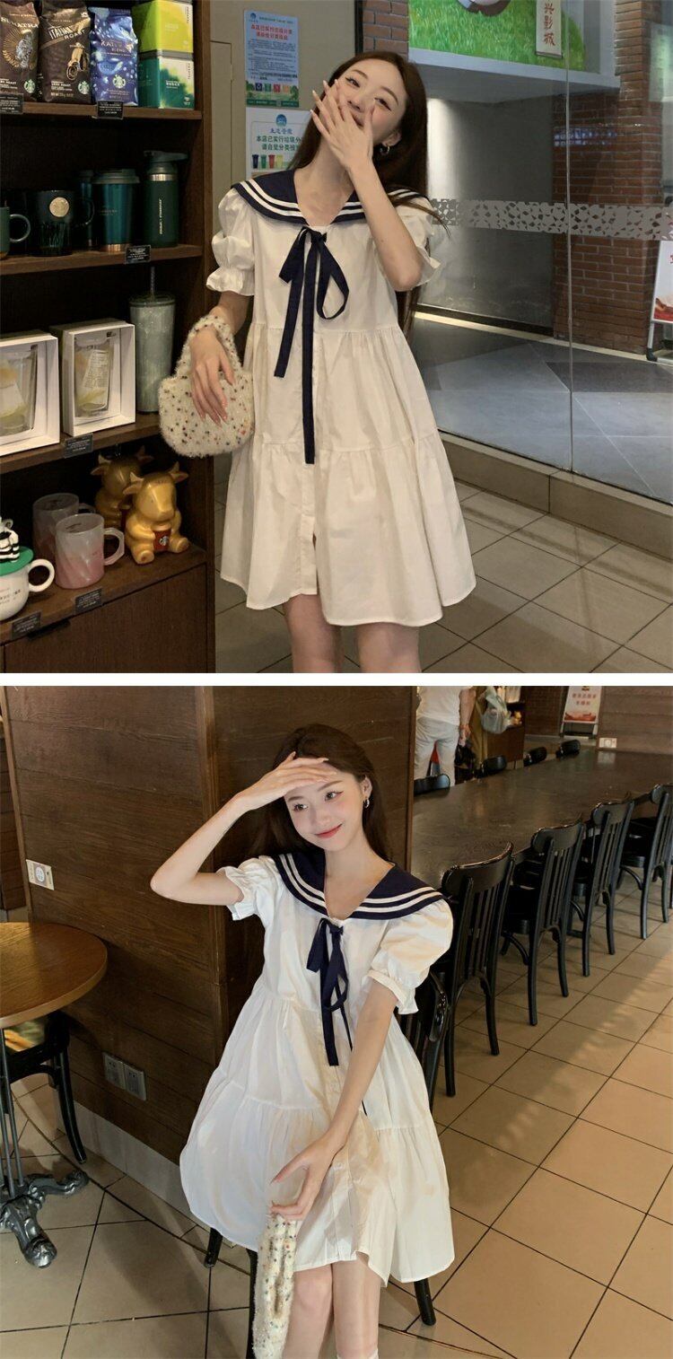 ネイビーカラードレス サマースタイルウェスト薄手半袖スリーブAラインスカート ショート ハーフスリーブ 大人ガーリー スウィート キュート カジュアル 夏物 s576188344678652