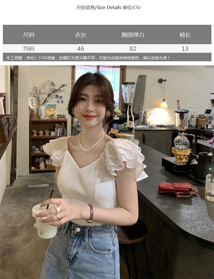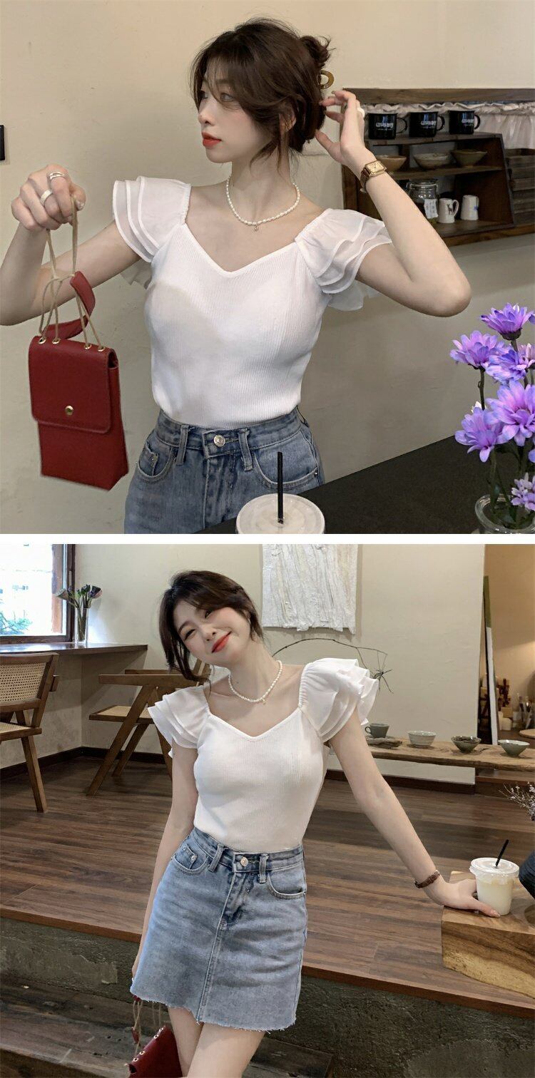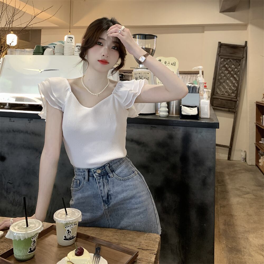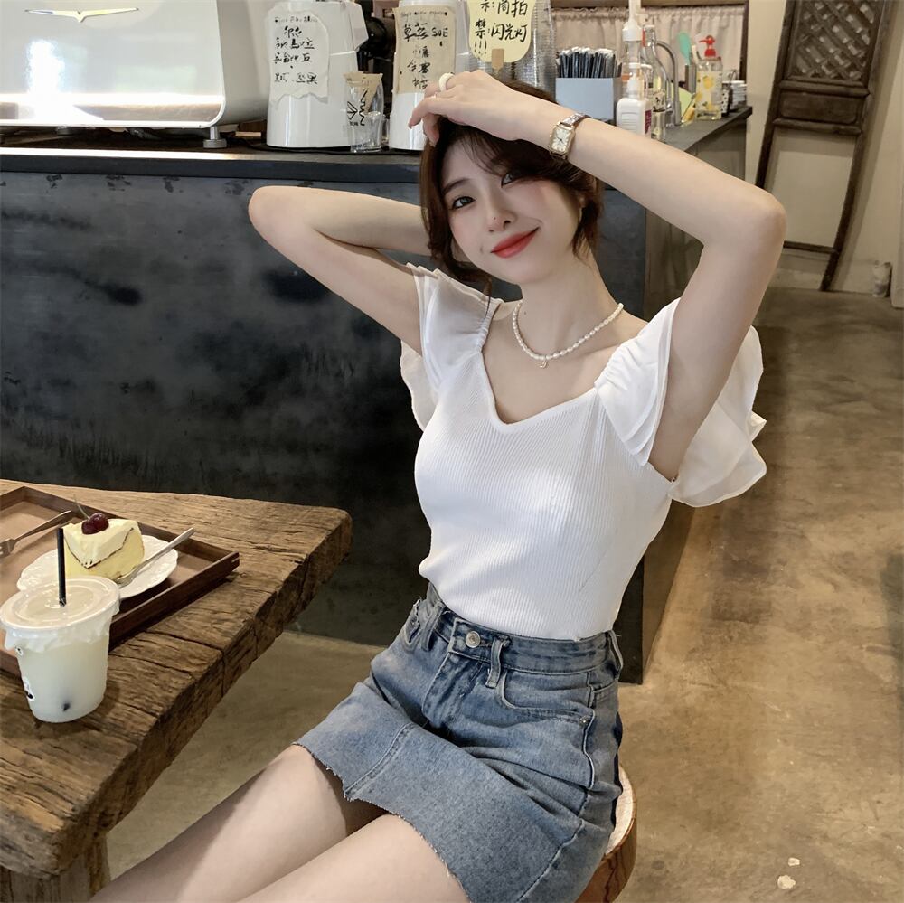 ホワイトショートニットセーター サマーVネックトップス 大人ガーリー スウィート キュート カジュアル 夏物 s576135873861608