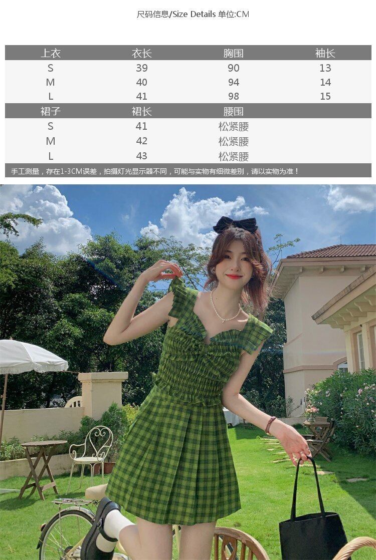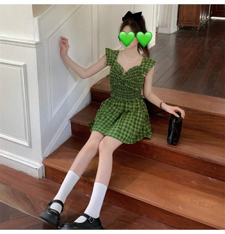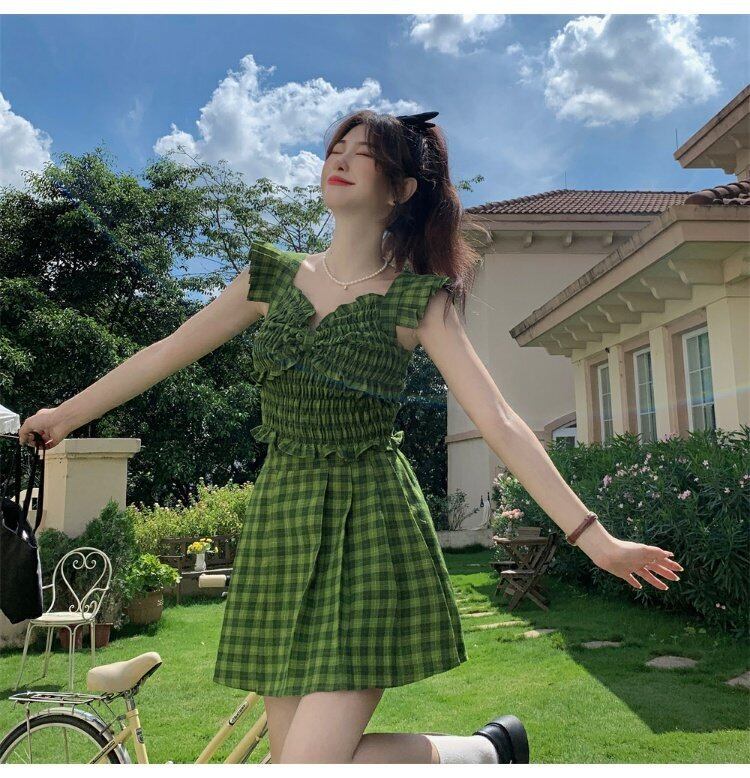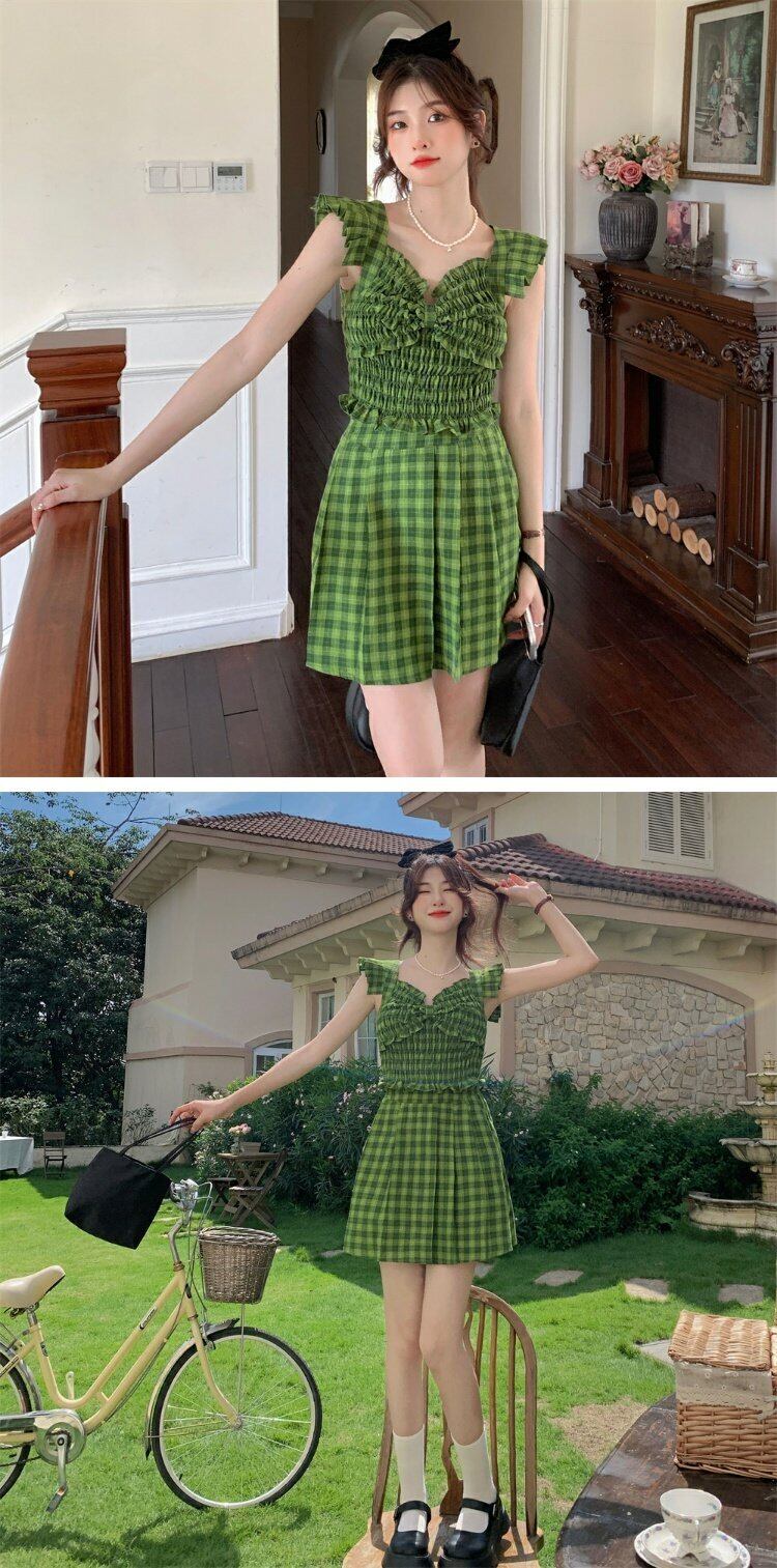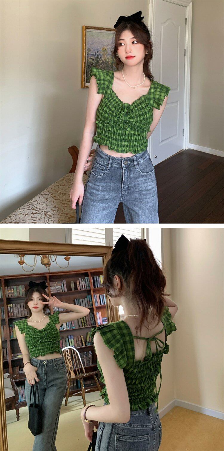 グリーン格子柄バックサマースタイルノースリーブショートトップス 大人ガーリー スウィート キュート カジュアル 夏物 s576152172903898