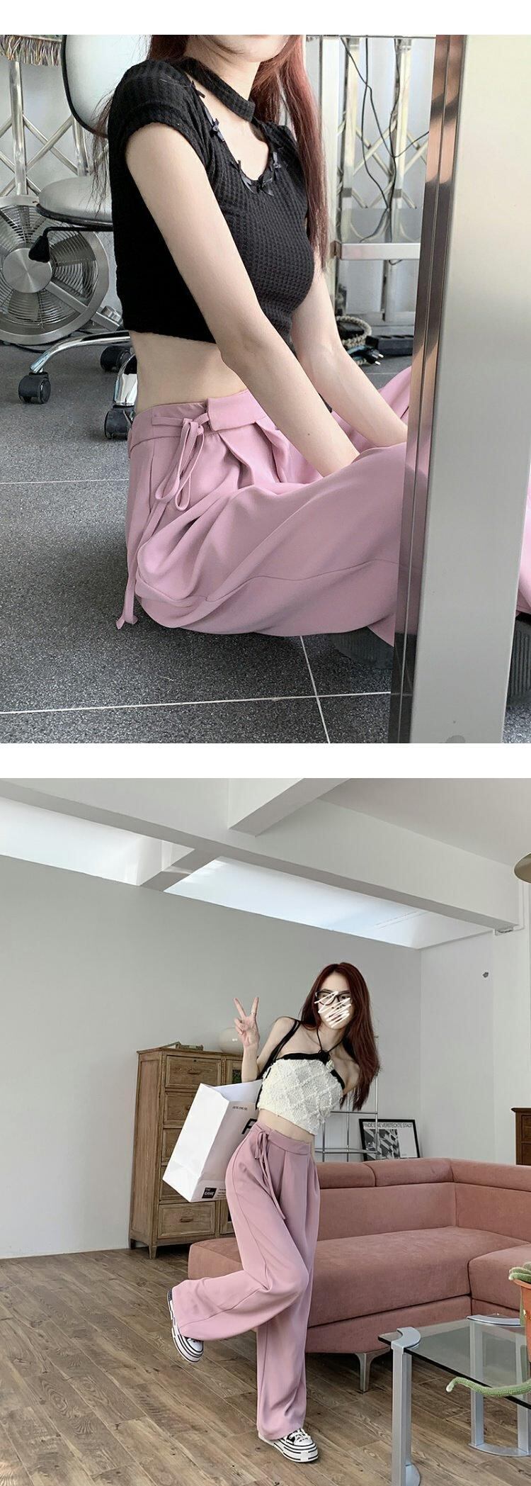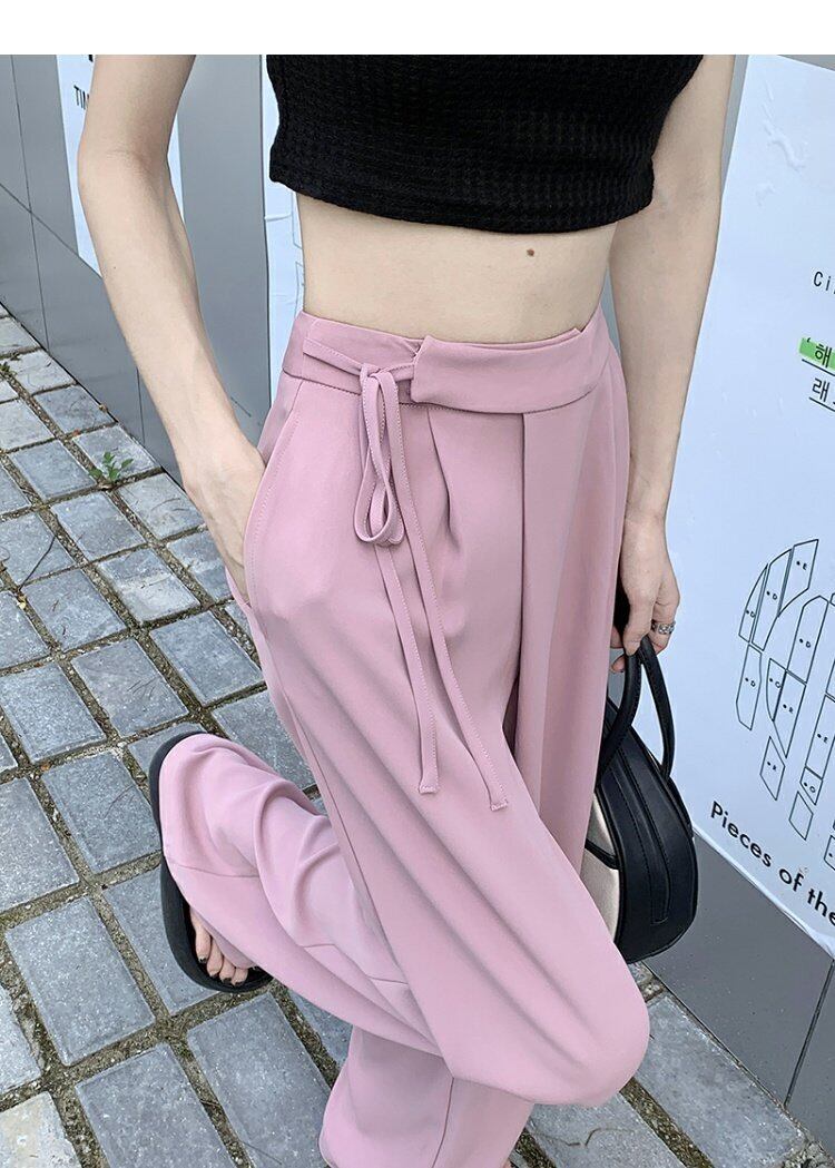 パンツ サマー薄手ハイウェストウェストルーズワイドレッグ ピンク 夏物 ワイドパンツ s576142098135362